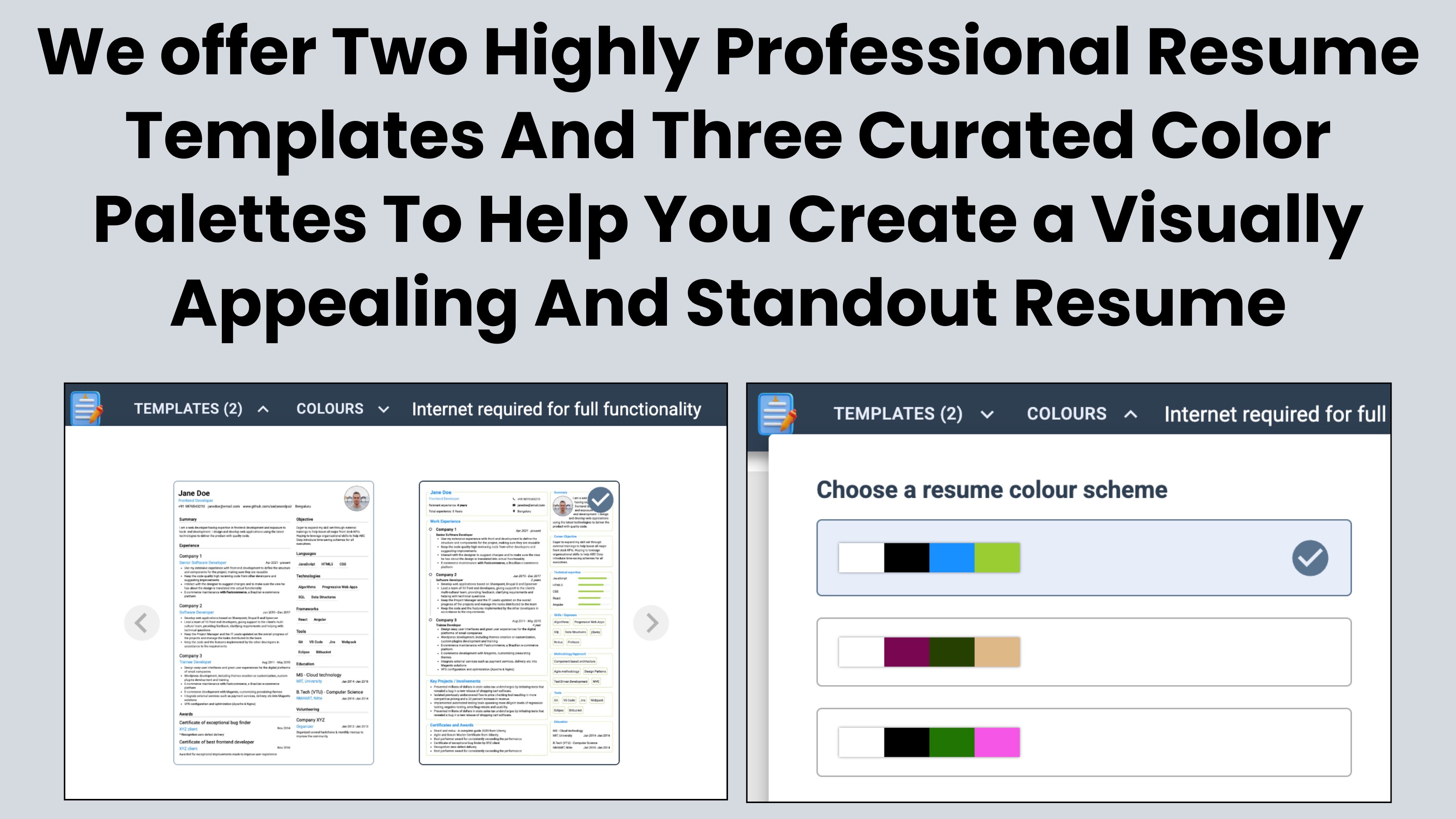 Quick Resume & CV Creation – Build a professional resume in minutes.Customizable Resume Templates – Choose from sleek, ATS-friendly designs.Offline Editing – Work on your resume anytime, even without internet access.Export & Import Resume Data – Save your progress in JSON format and resume editing later.Instant PDF Download – Export your resume as a high-quality PDF.Live Preview – See real-time updates as you edit.Easy-to-Use Interface – Drag-and-drop sections for smooth customization.