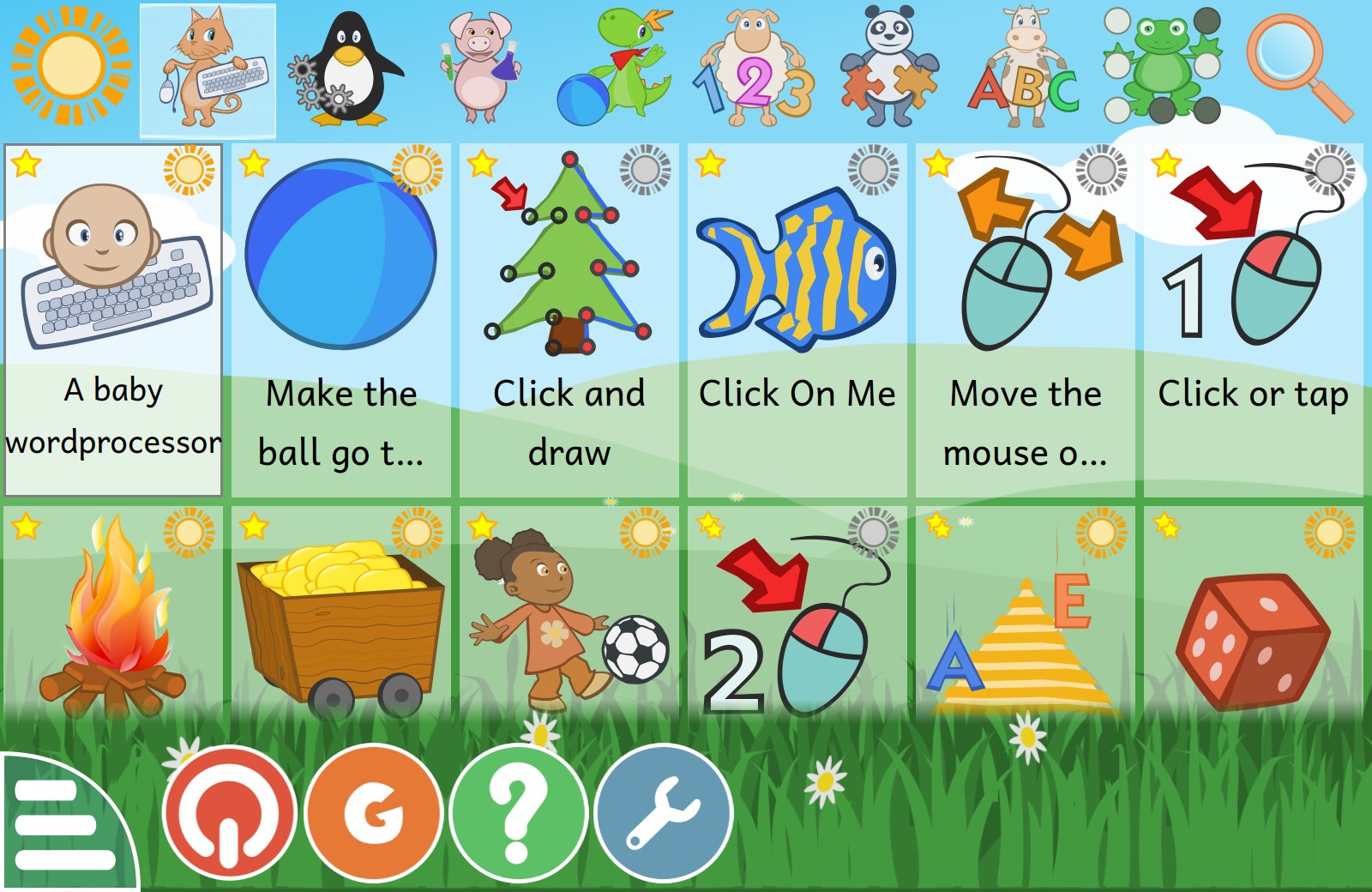 Computer Discovery: keyboard, mouse, touchscreen ...Reading: letters, words, reading practice, typing text ...Arithmetic: numbers, operations, table memory, enumeration, double entry table ...Science: the canal lock, the water cycle, renewable energy ...Geography: countries, regions, culture ...Games: chess, memory, align 4, hangman, tic-tac-toe ...Others: colors, shapes, Braille, learn to tell time ...