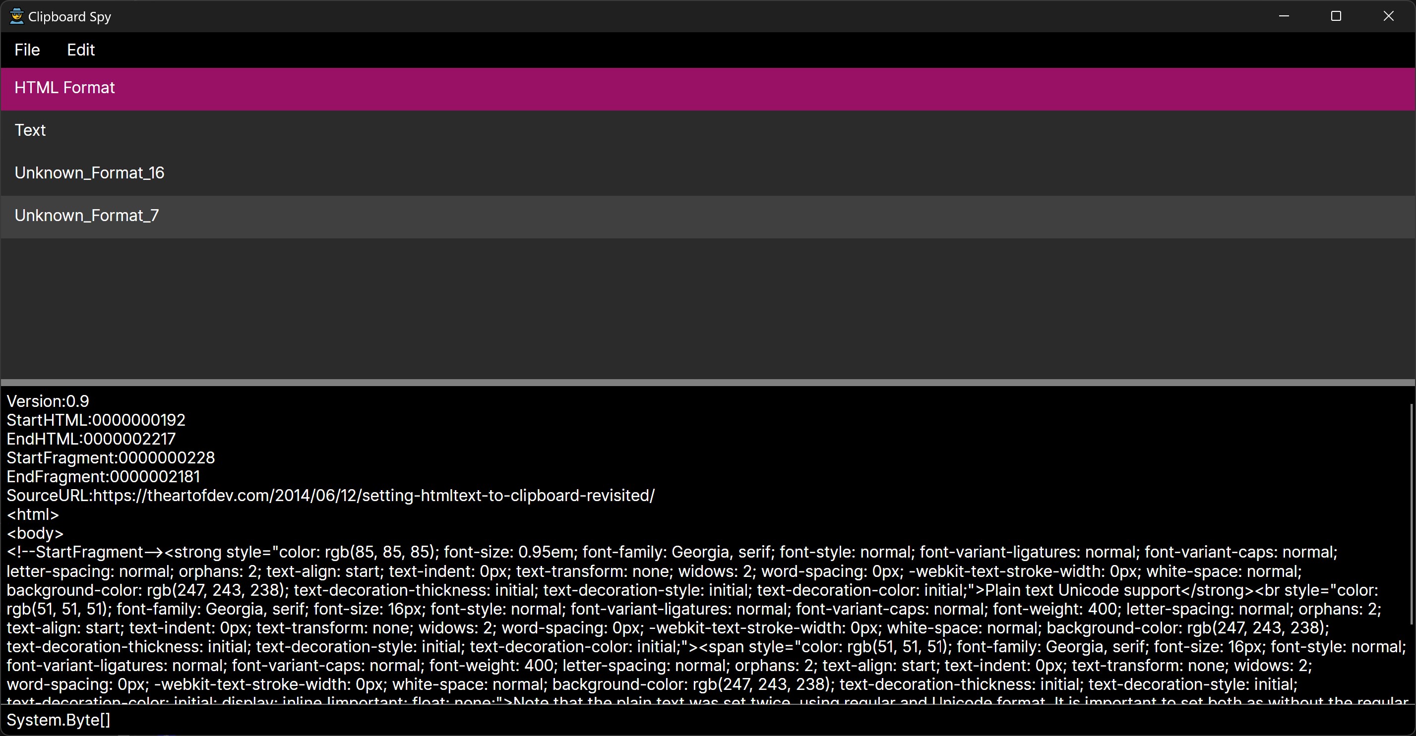 A simple clipboard and drag and drop data object viewer. Showing all format names and their associated data in decoded plain text..
