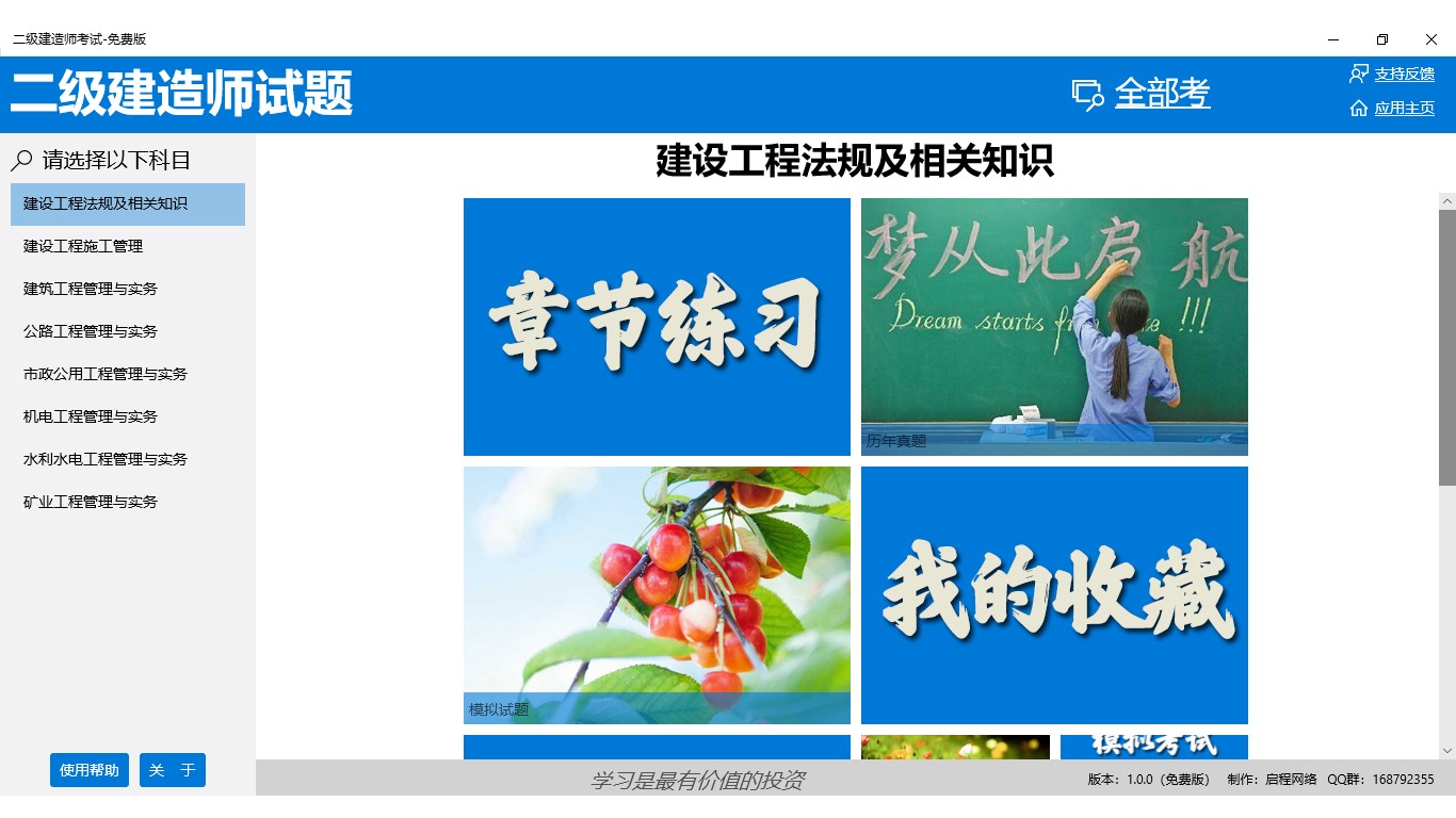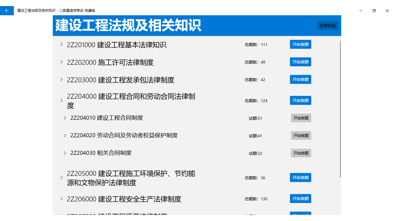 多种分类,建设工程法规及相关知识、机电工程管理与实务、公路工程管理与实务、建设工程施工管理、水利水电工程管理与实务、矿业工程管理与实务、建筑工程管理与实务、市政公用工程管理与实务。科目中分章节进行练习。