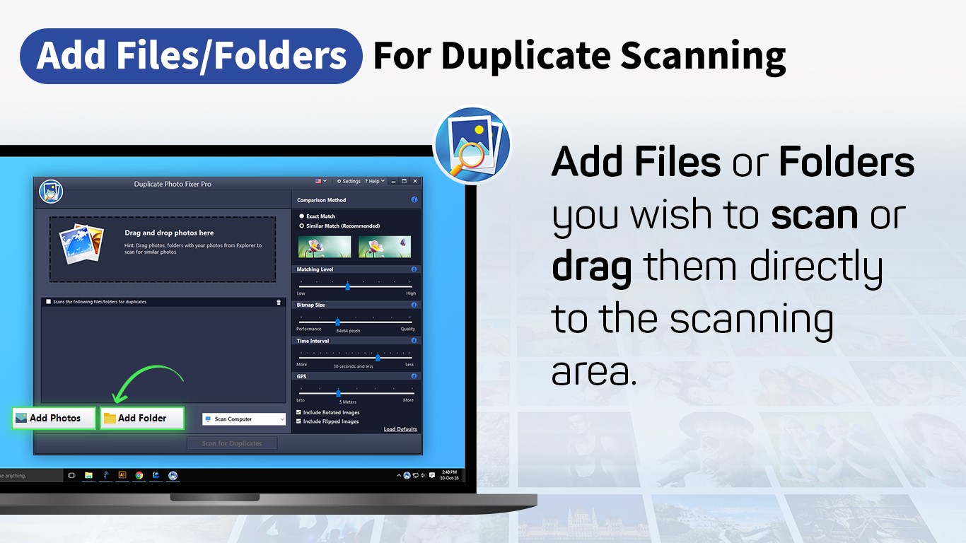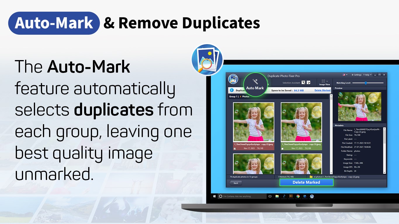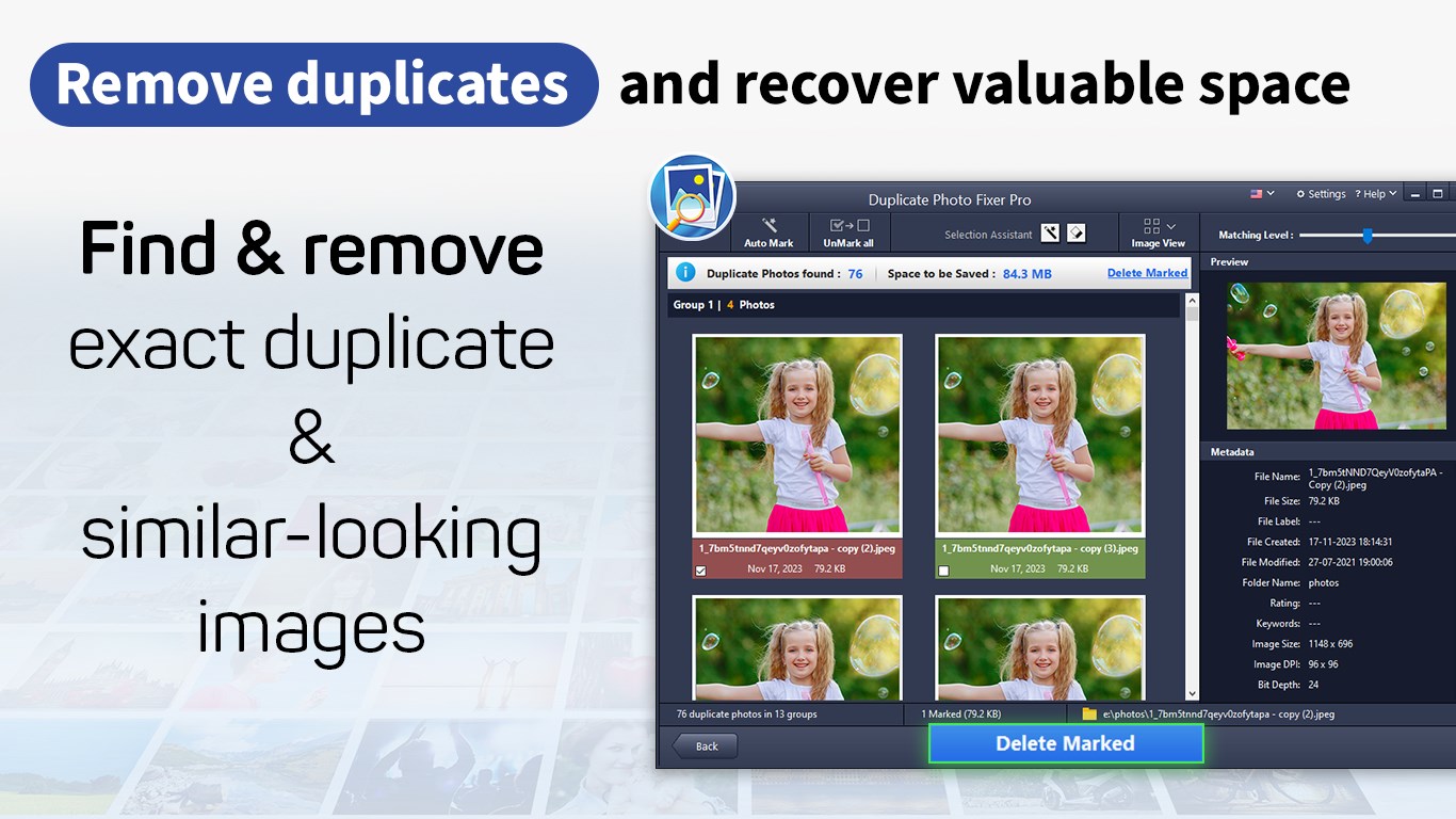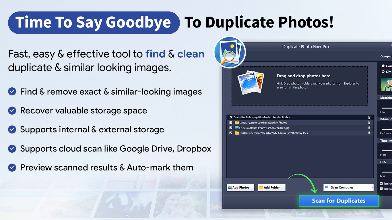 Scan for identical & similar-looking imagesAuto-mark duplicate imagesRecover huge chunks of spacePreview duplicate snaps before removing them permanentlyInternal Storage: Remove duplicate unwanted photos from the computer\’s hard driveExternal Storage: Delete duplicate images from USB drives, external hard drives & SD cardsCloud Storage: Use this duplicate photo cleaner on Google Drive and Dropbox to eliminate clone photosSupports clearing duplicates for Picasa and Lightroom Classic LibrarySupports scanning rotated and flipped imagesEnjoy an organized duplicate-free picture galleryFast & Accurate Scanning - The duplicate photo finder employs a highly efficient scanning algorithm to swiftly scan your entire library to detect duplicate images.User-Friendly Interface - The application is designed with simplicity in mind. Its intuitive interface makes it easy for all types of users to navigate and use the duplicate cleaner.Duplicate Photo Detection - The Windows app effortlessly identifies identical images. It can locate images with the same content, even if they have different file names or formats.Similar-Looking Image Detection - Besides finding exact duplicates, the app also helps users to find images that are visually similar, ensuring no duplicates are left behind.Solid Comparison Methods - It finds duplicates based on image quality, burst mode duplicates within a 30-second timeframe, and uses embedded GPS coordinates to match similar photos.Flexible Matching Levels - Duplicate Photo Fixer Pro offers the ability to adjust the matching level using the slider for accurate identification of exact and similar-looking photos.Advanced Image Recognition - Additionally, it supports scanning rotated and flipped images, ensuring thorough and accurate duplicate identification.Drag and Drop Functionality - The app supports drag & drop functionality, making it convenient for users to add entire folders or specific images for duplicate scanning.Cloud Solution Compatibility - This duplicate photo finder allows you to scan and manage clone images stored on Dropbox. It supports removing duplicates from Picasa & Lightroom Classic Library as wellMulti-Device Compatibility - The app is designed to be compatible with various devices, including local & network drives.