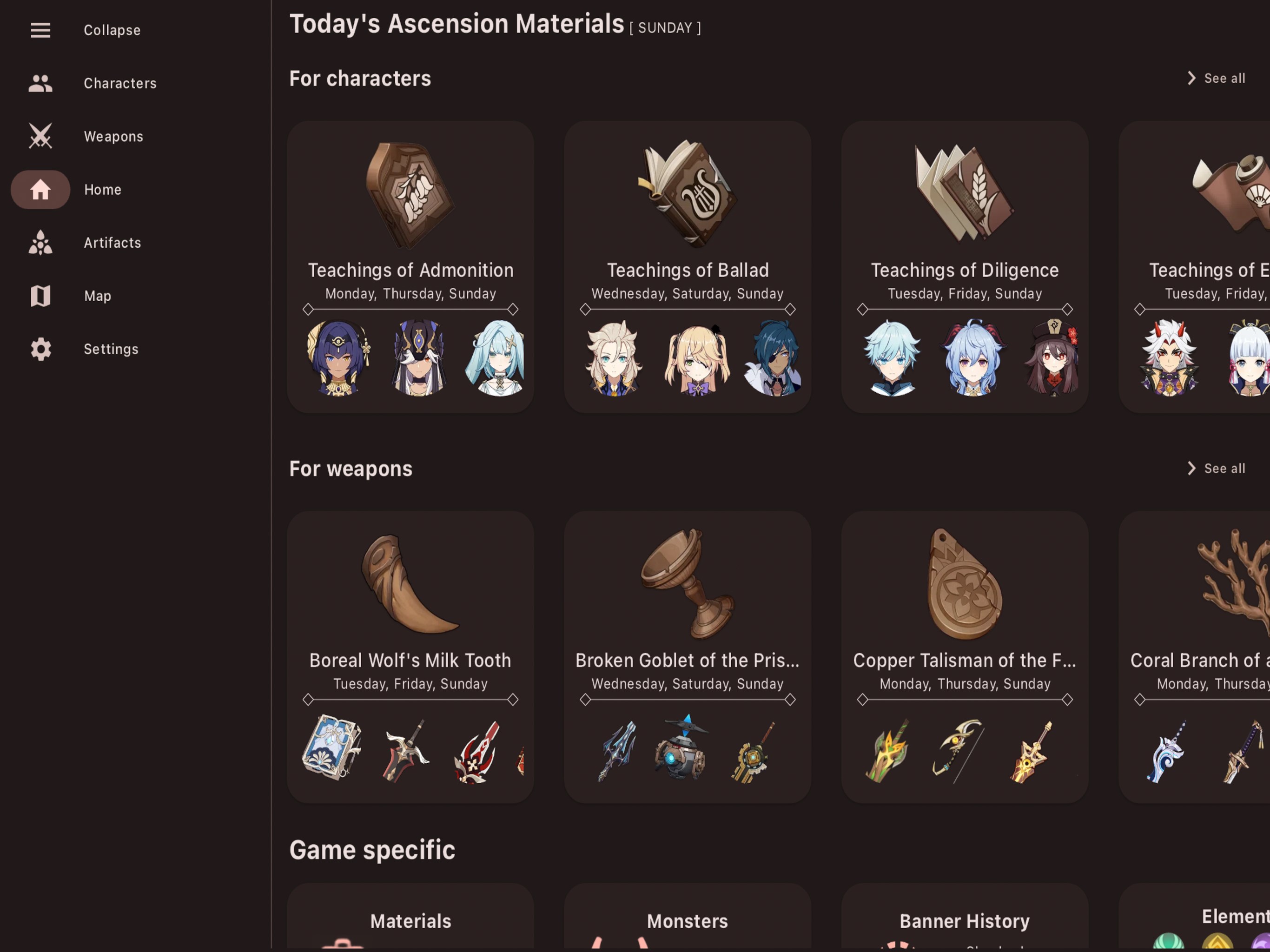 ArtifactsCharactersWeaponsMaterialsCalculators