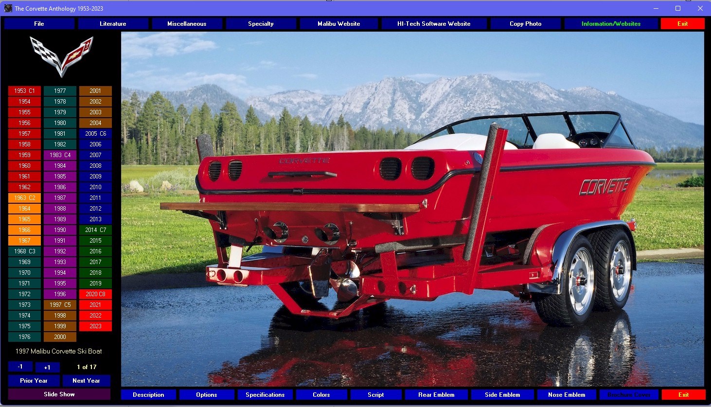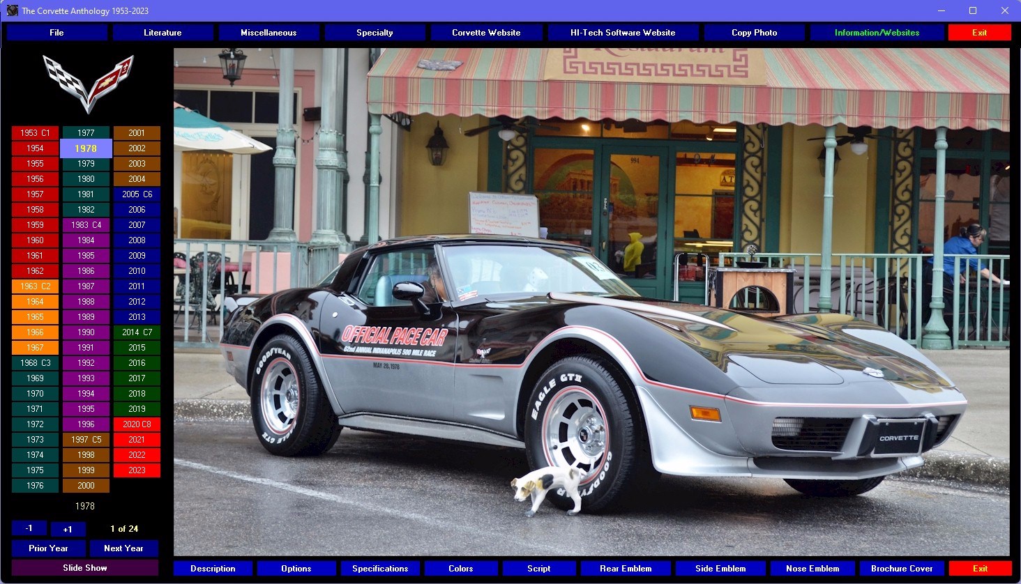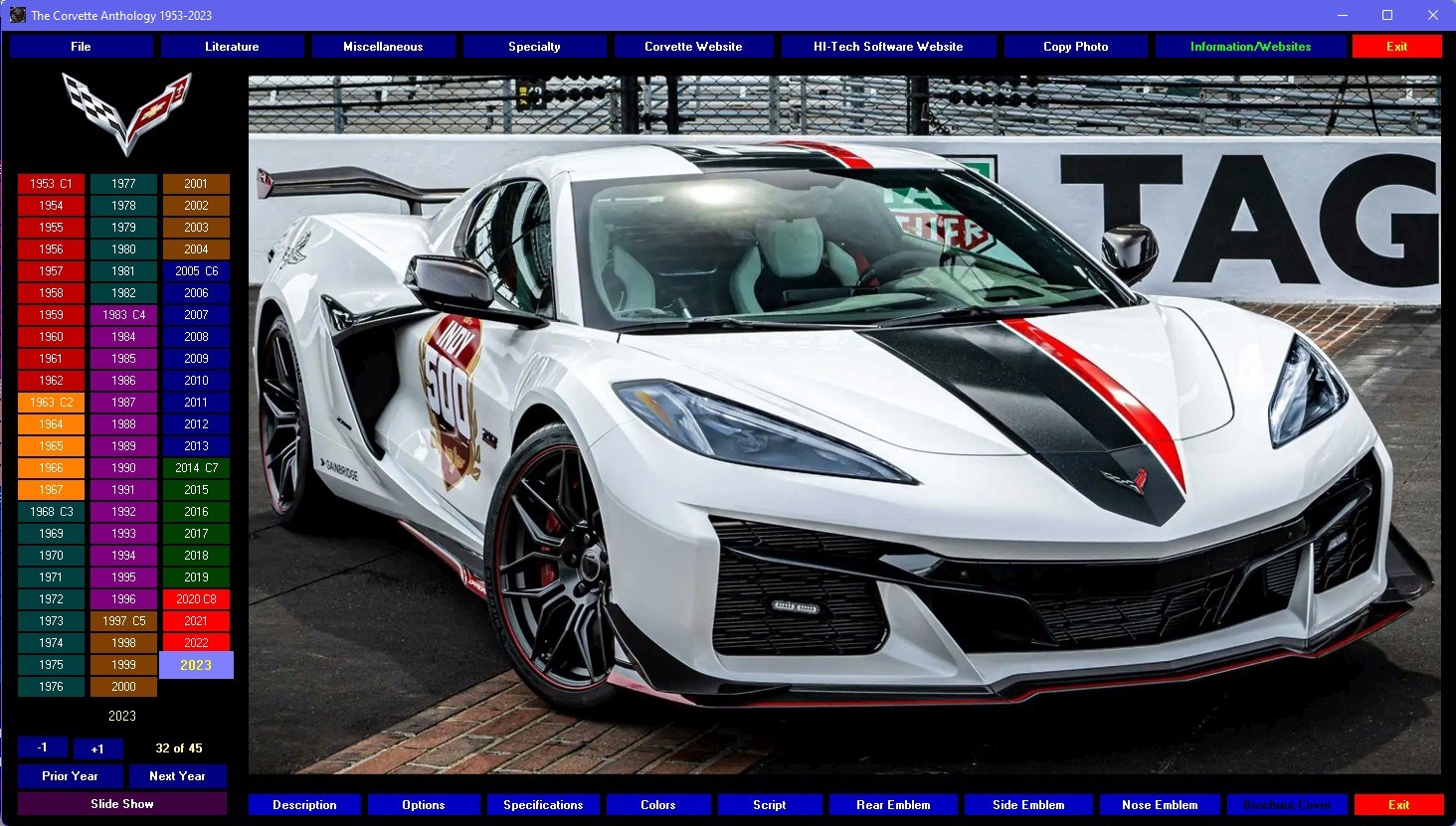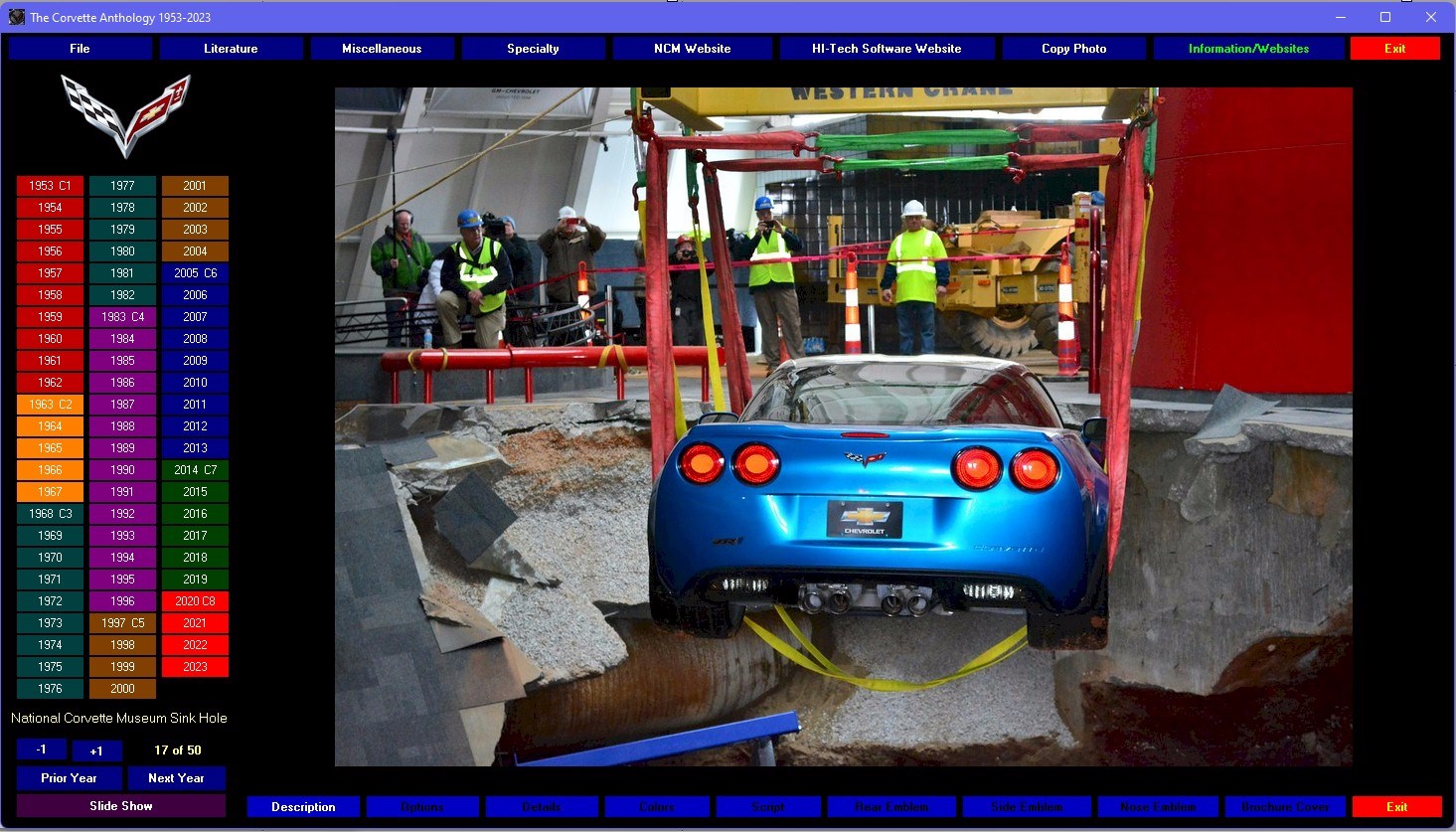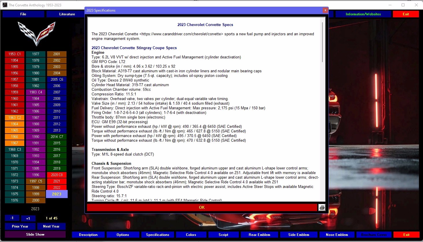 Still the only GM officially licensed multi-media encyclopedia about the Corvette. This photographic extravaganza contains nearly 3000 high resolution (1200x730) photos, hundreds of graphics and more to guide you, starting with the first six-cylinder in 1953, to the awesome new 2023 mid-engine Z06. Browse the statistics, the options, those tremendous horsepower muscle cars of the sixties. It’s all here! Everything you want to know about
