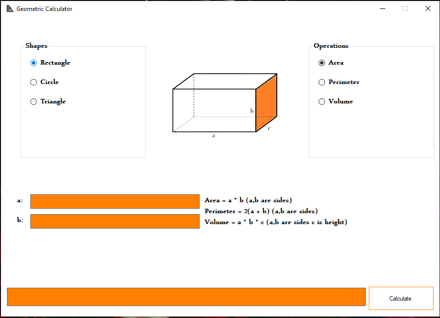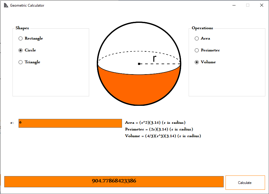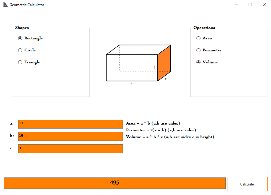 The program uses math and geometric rules to calculate Circles, Rectangles and Triangles' Perimeter, Area and Volumes with user-input data for sides of the shapes.