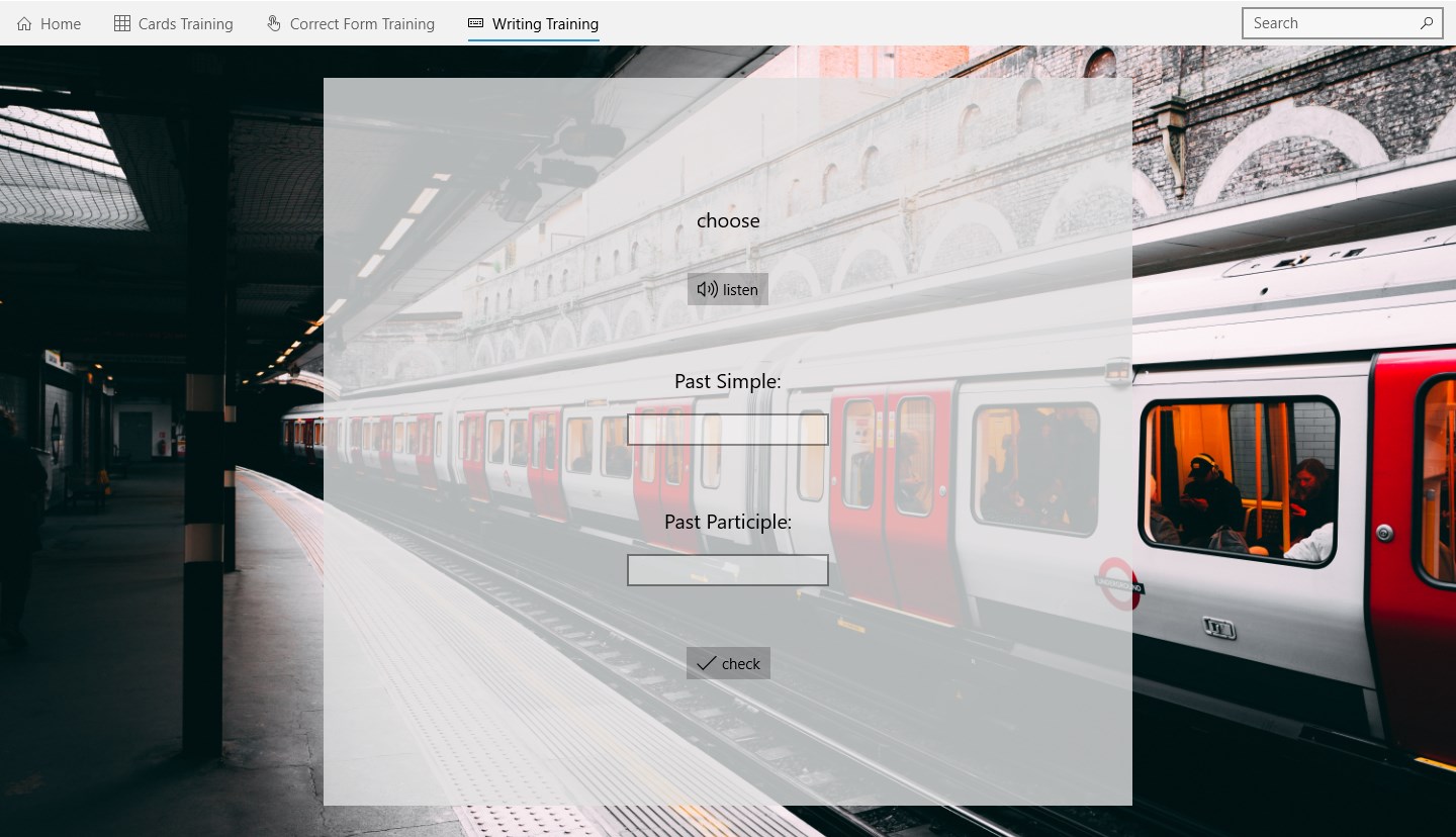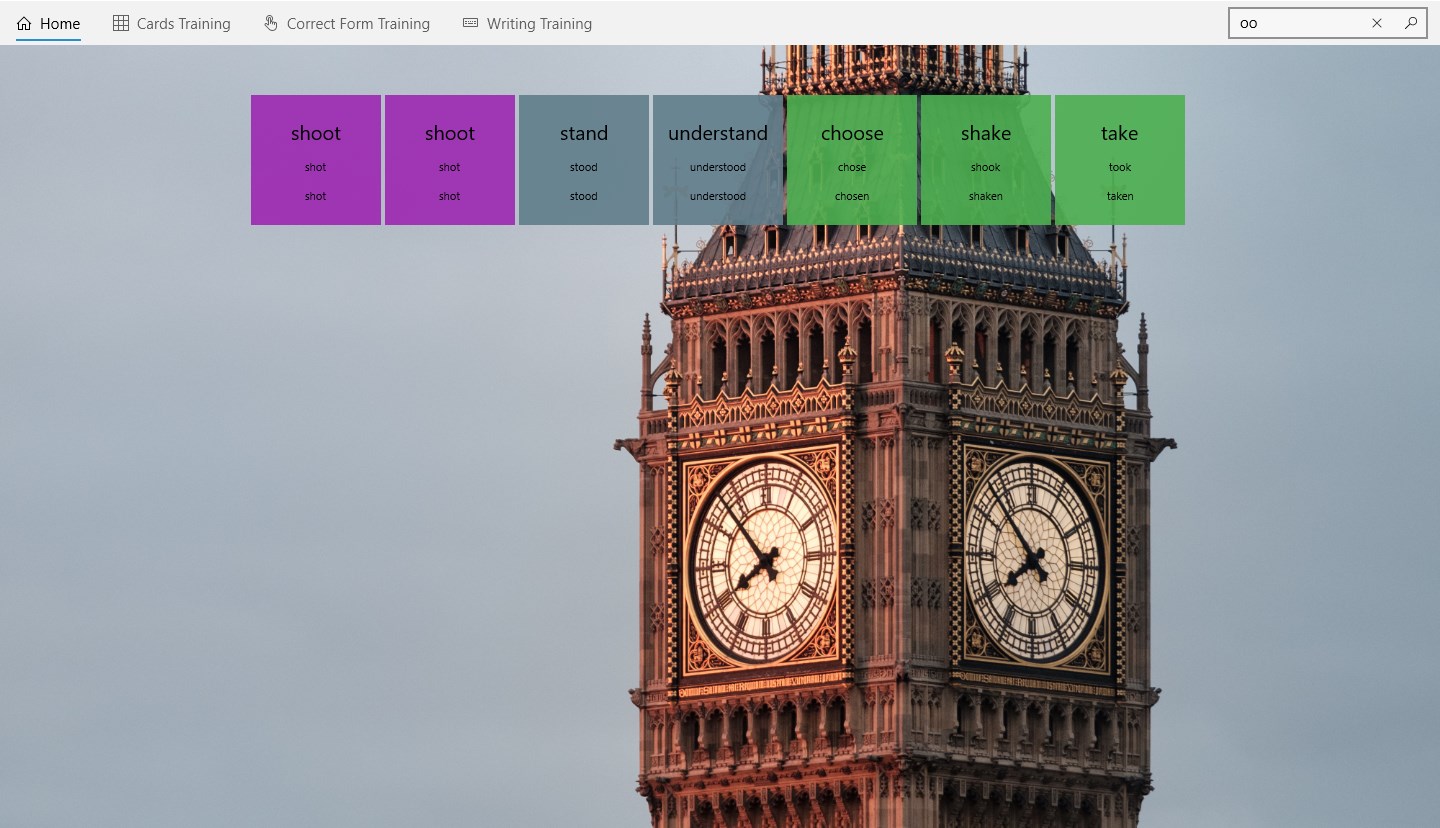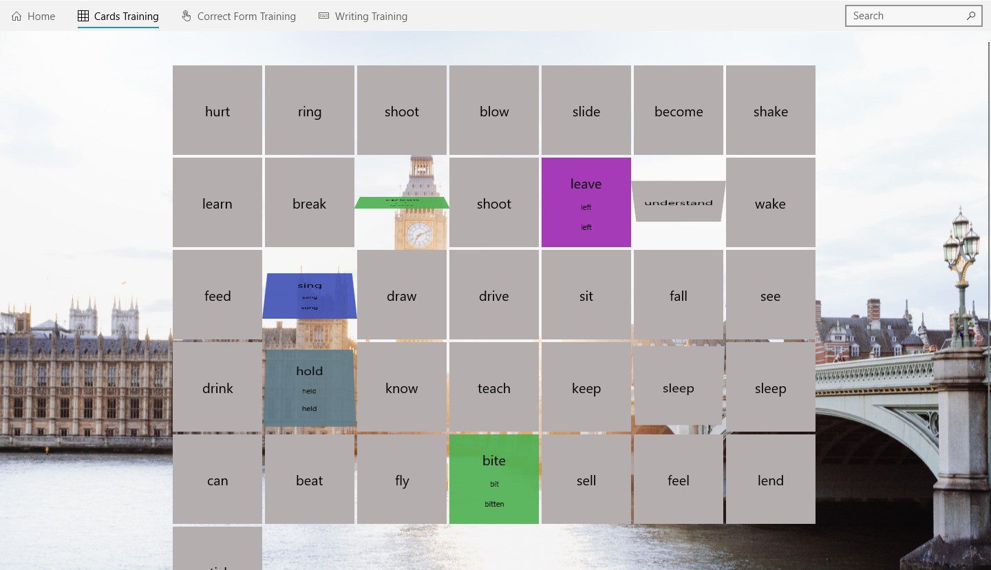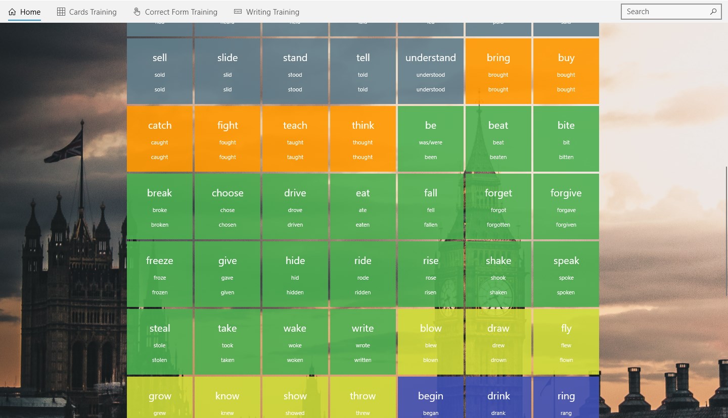 Grouped irregular verbsFlipping cardsWriting testMultiple-choice testConvenient searchBeautiful background
