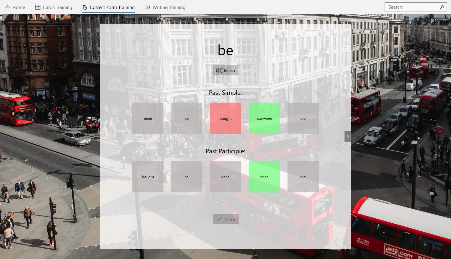 Do Did Done is a learning app for English Irregular Verbs. It has three types of exercises you can use to improve your English skills. All verbs are divided into logical groups which simplifies the learning process.