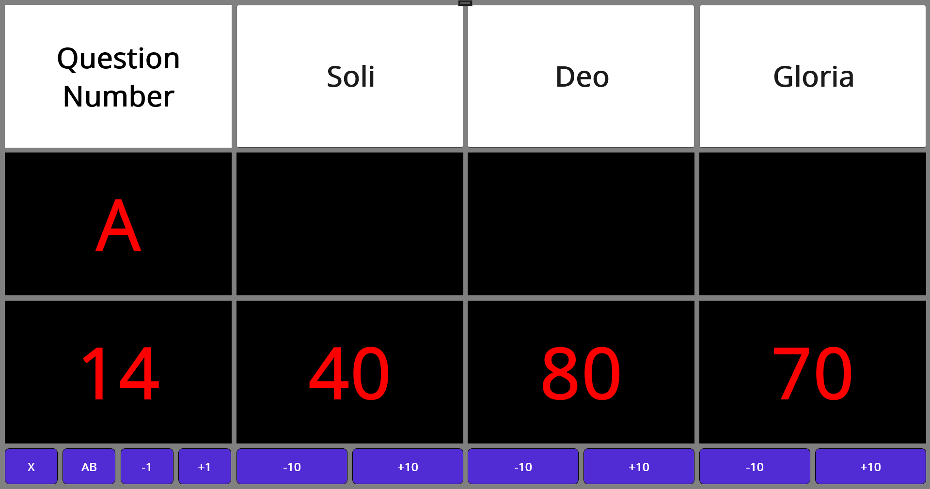 There are a max of 3 teams which each have a name and current score. Scores always increment by +/- 10 points. The team names can be changed by clicking on them (they default to "Soli", "Deo", "Gloria") and typing in the actual team names. The buttons along the bottom are used to add/subtract 10 points from the individual teams. The "X" button resets the quiz. There's a question number which can be increased/decreased by 1 and there's an AB toggle which toggles that display between "", "A", and "B". The values shown are all saved using the preferences storage so that if the app is unexpectedly closed, it will resume where it left off when run again. When pressing and releasing the buttons, sounds are played which are recorded from the physical scoreboard buttons used at some quiz meets.