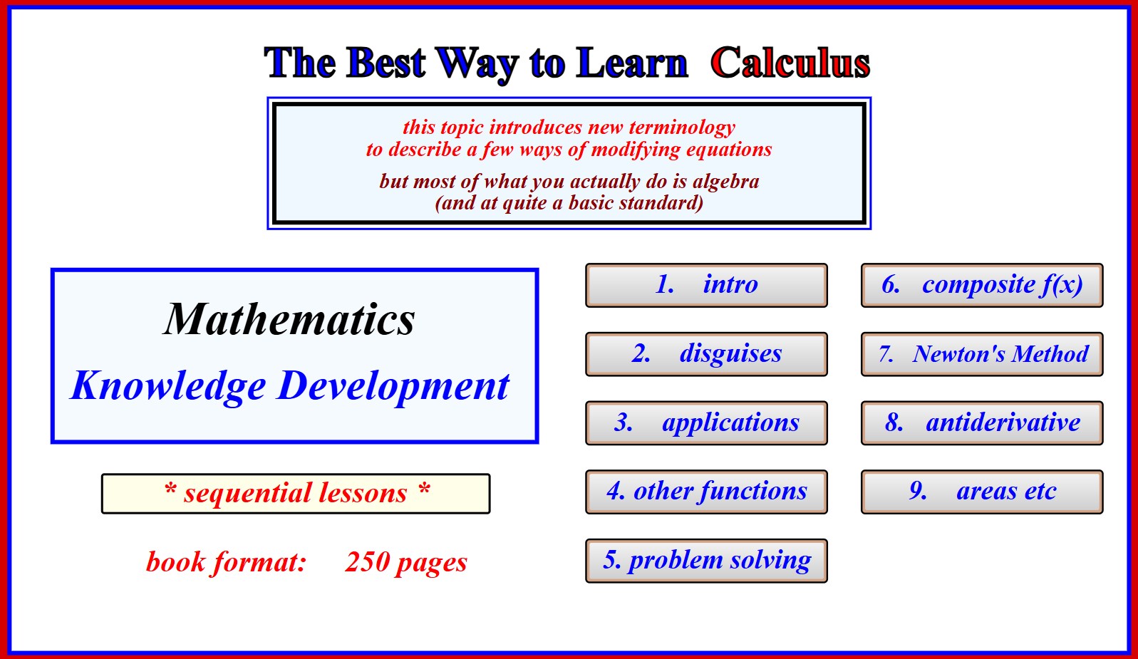 In book 10 Calculus is presented as a natural extension of algebra. It extends the simple mathematical structure and concepts that students have already mastered, thus allowing for more powerful applications.