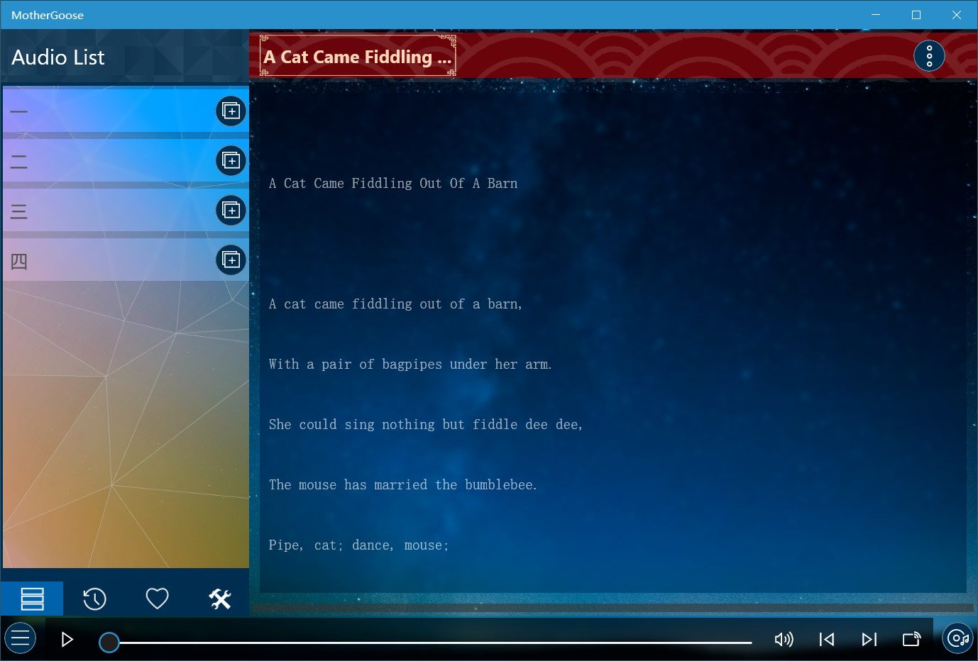 Mother Goose Nursery Rhyme is a collection of British folk nursery rhymes, these folk nursery rhymes in the United Kingdom for a long time, some up to hundreds of years, content is graceful, is the familiar children's songs in the United Kingdom and the United States.