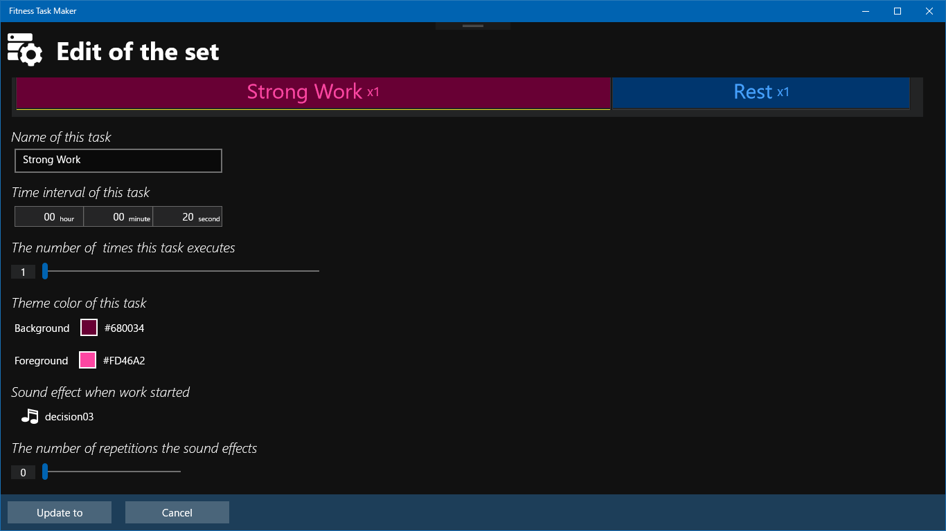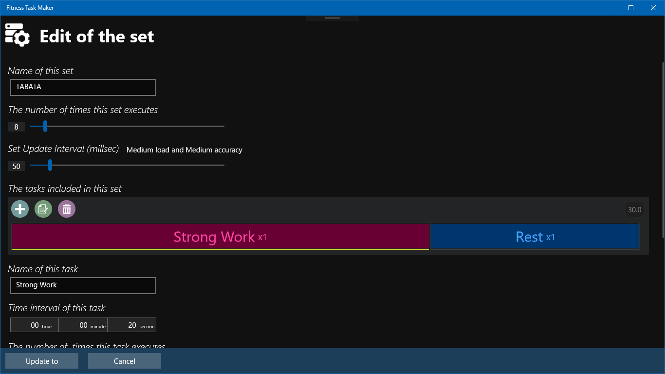 It is a timer application for training which can set the cycle which informs the working time. For example, if you set breakpoints of actions to be performed by fitness training, you can concentrate on training as it automatically counts.