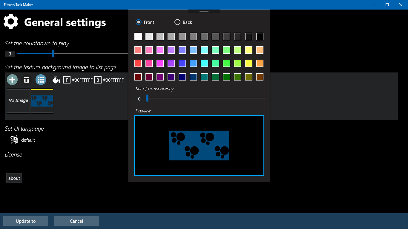【General setting page】: This page is displayed when executing the "gear" of the action command from the list page. In this case, you can set "Countdown before set execution", "Change background of list page", "UI language".
