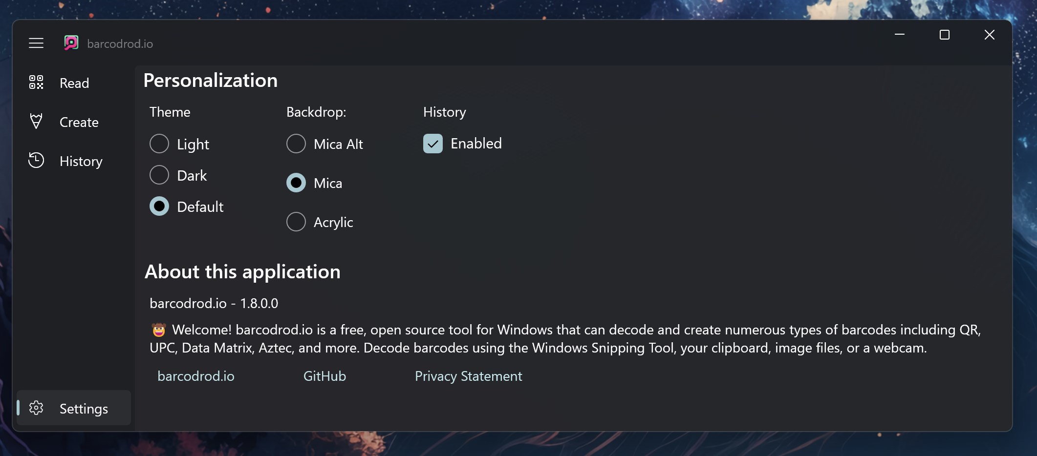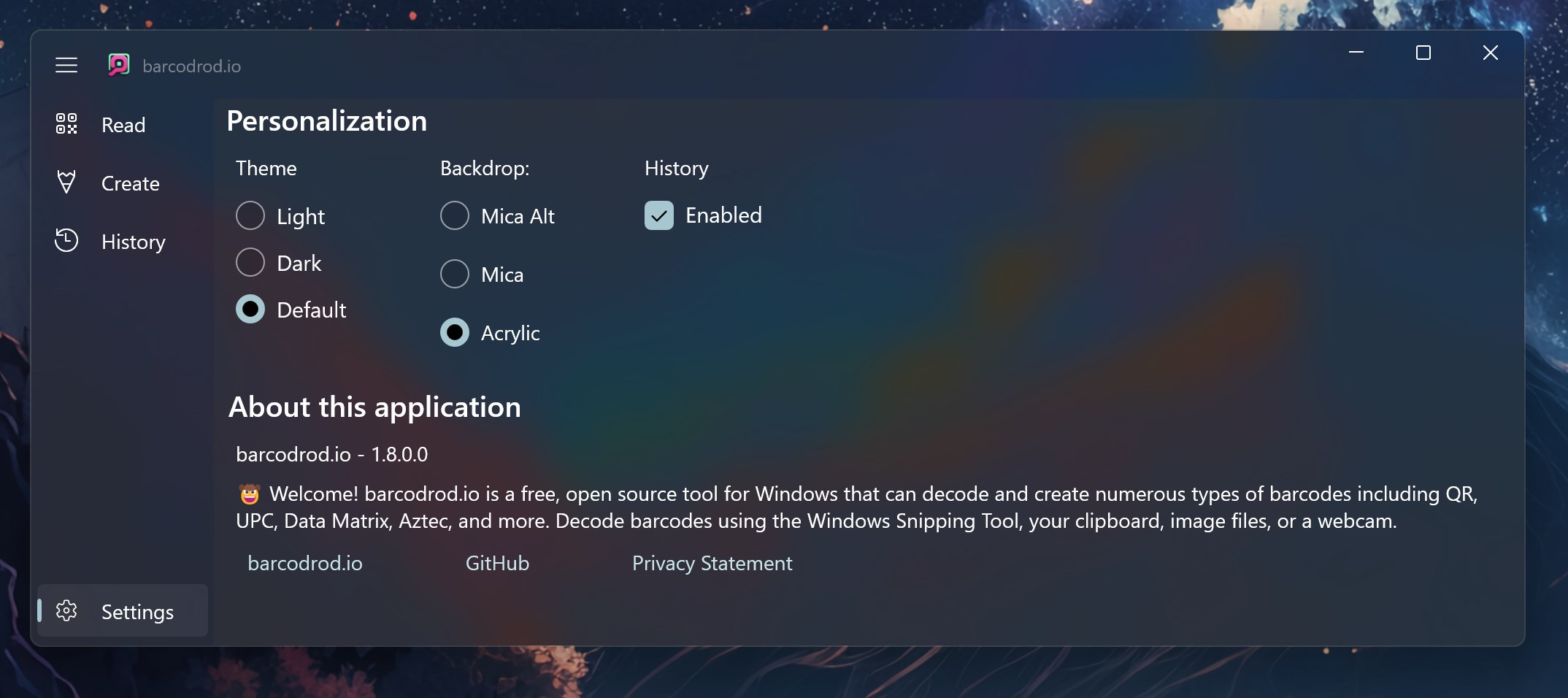 barcodrod.io is an ad-free, open-source, modern barcode and QR code toolkit for Windows 10 and 11. 100% free to use.