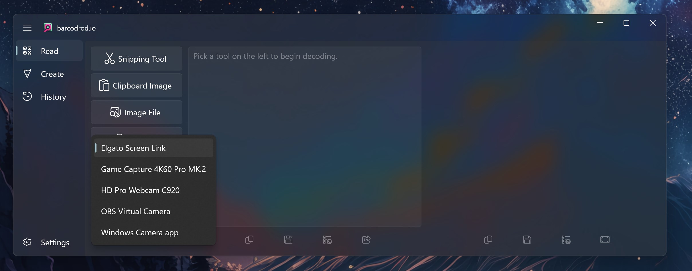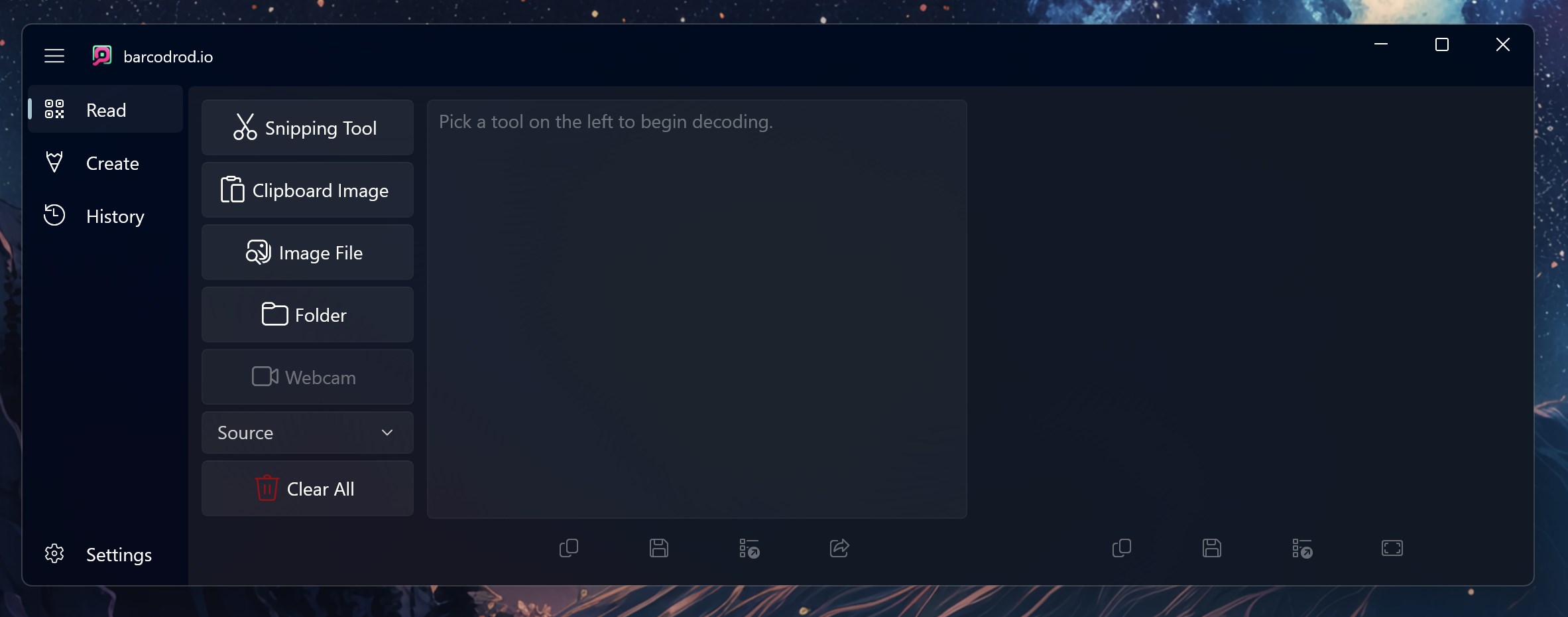 Decode 17 different barcodesCreate 13 different types of barcodesMica + Light and dark theme supportDecode using the Windows Snipping ToolDecode from image fileDecode from clipboardDecode from webcamCreate QR Codes for connecting to Wi-Fi networks, sending emails, and sharing business cardsDecode QR and barcodes in bulkDecode from DirectShow, video, and webcam sourcesSet custom colors for generated barcodesView and export historySecurely scan and review QR code contents before launching them in a browser or app.