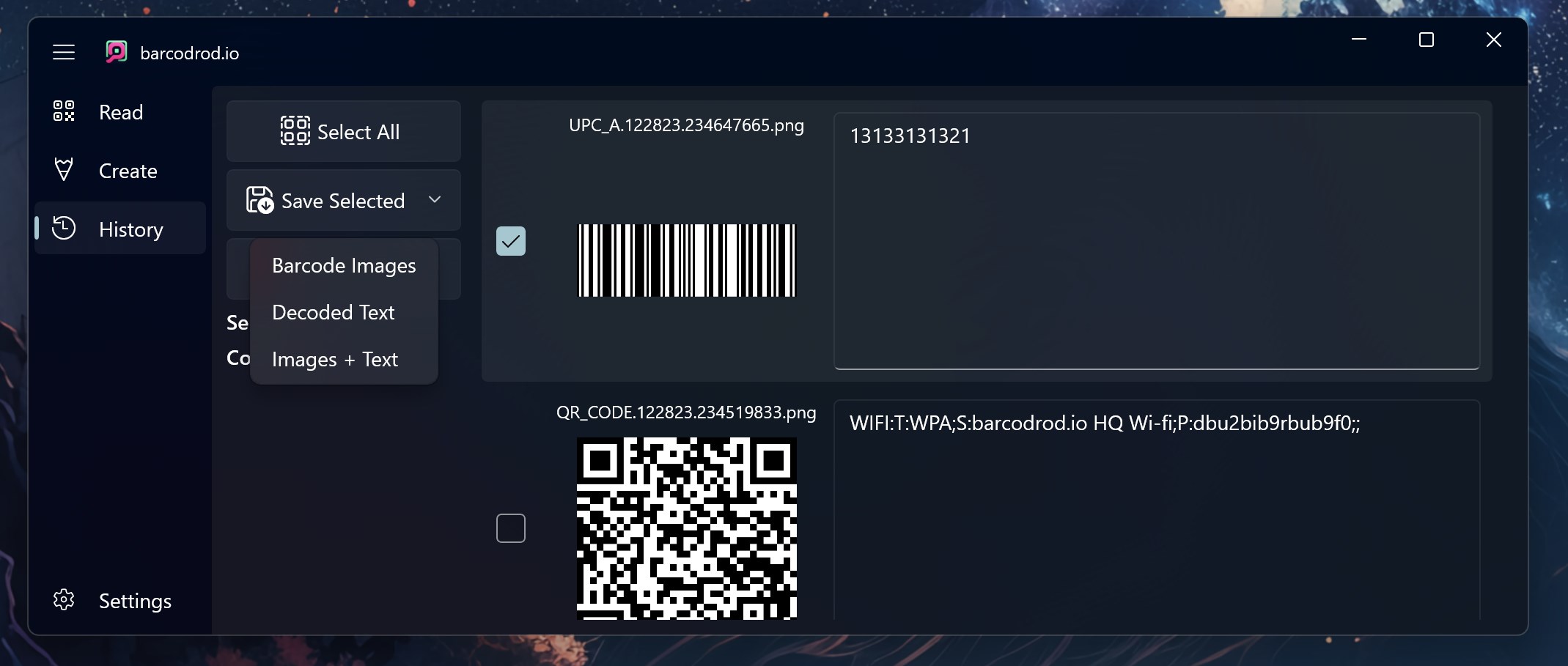 - View and manage a history of QR codes and barcodes read and created on your PC.