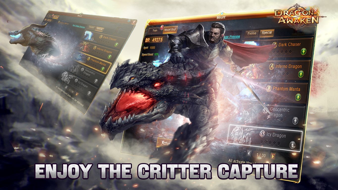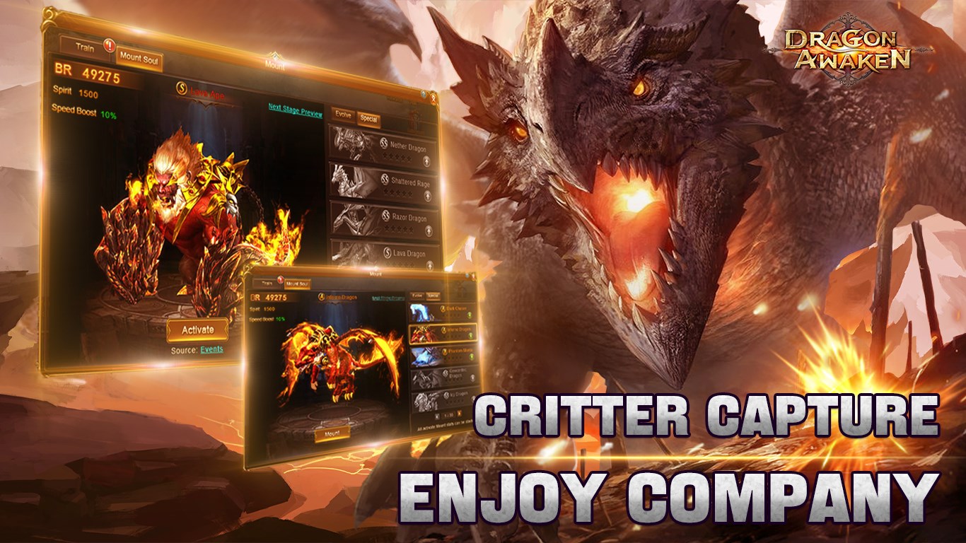 Players have the opportunity to domesticate and train their own dragons to assist them in combat. From the start of the dragon egg hatching, players have to take care of domesticating their dragon pets until they show the final form. In the process, players reach a close strategic alliance with their own pets, and fight together to coexist and die.