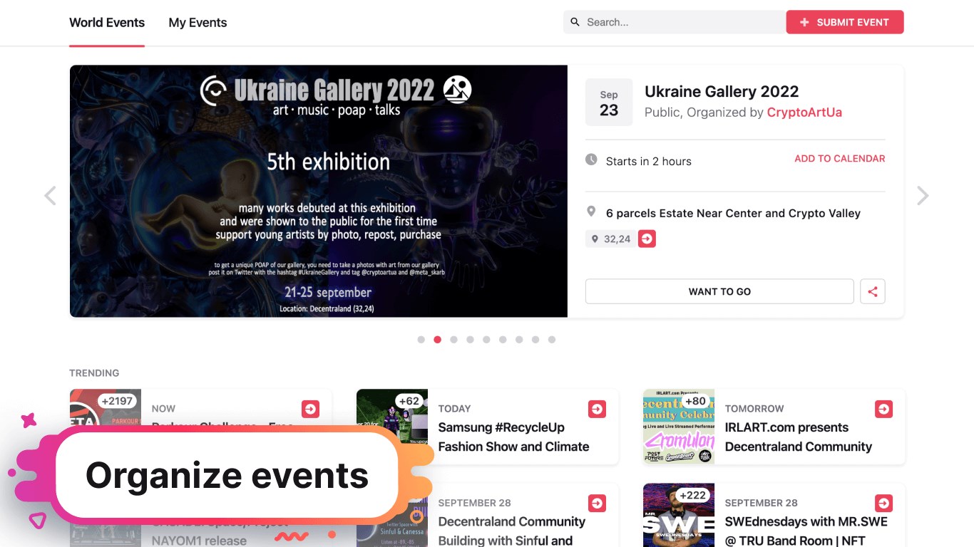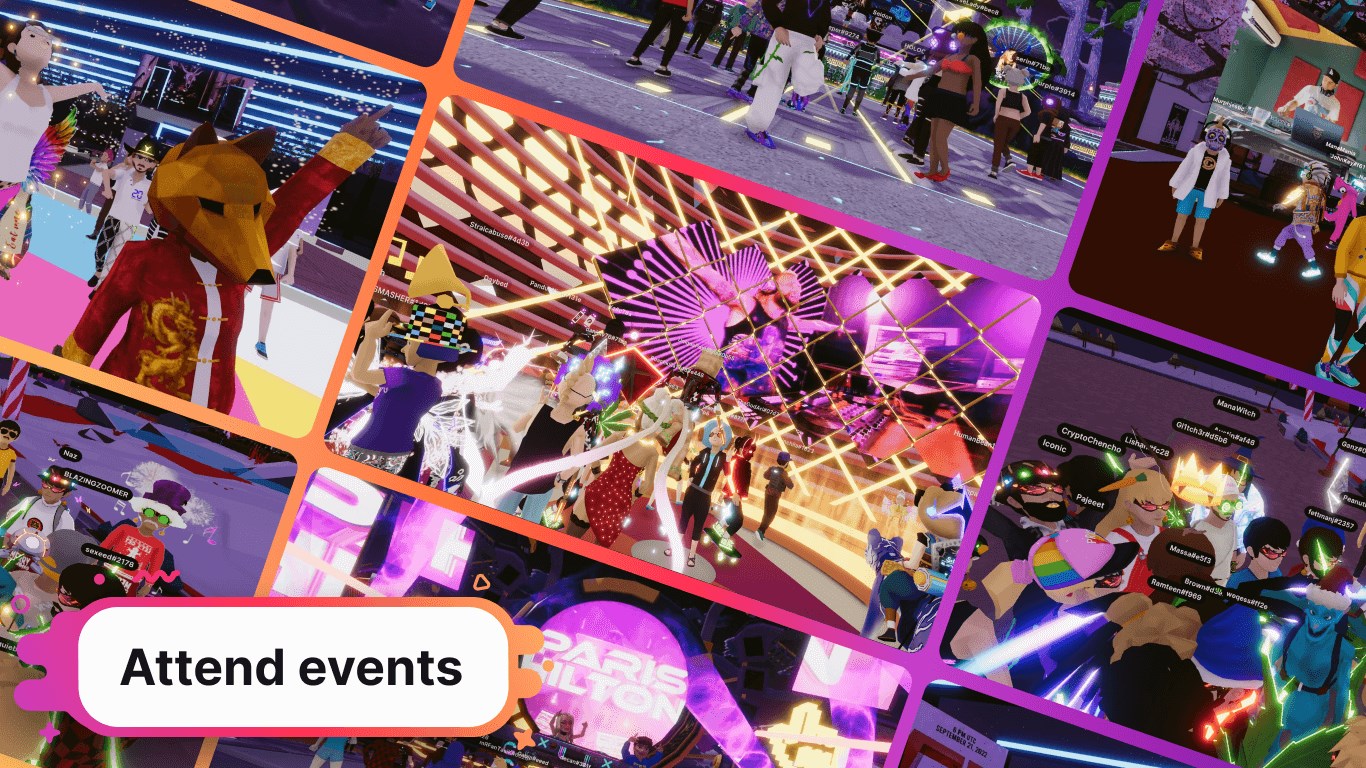 Users are free to explore and discover what Decentraland has to offer as digital avatars and attend live concerts, conferences, art exhibitions, dance parties, and many other events that you can find on the Decentraland event page: [https://events.decentraland.org/](https://events.decentraland.org/)