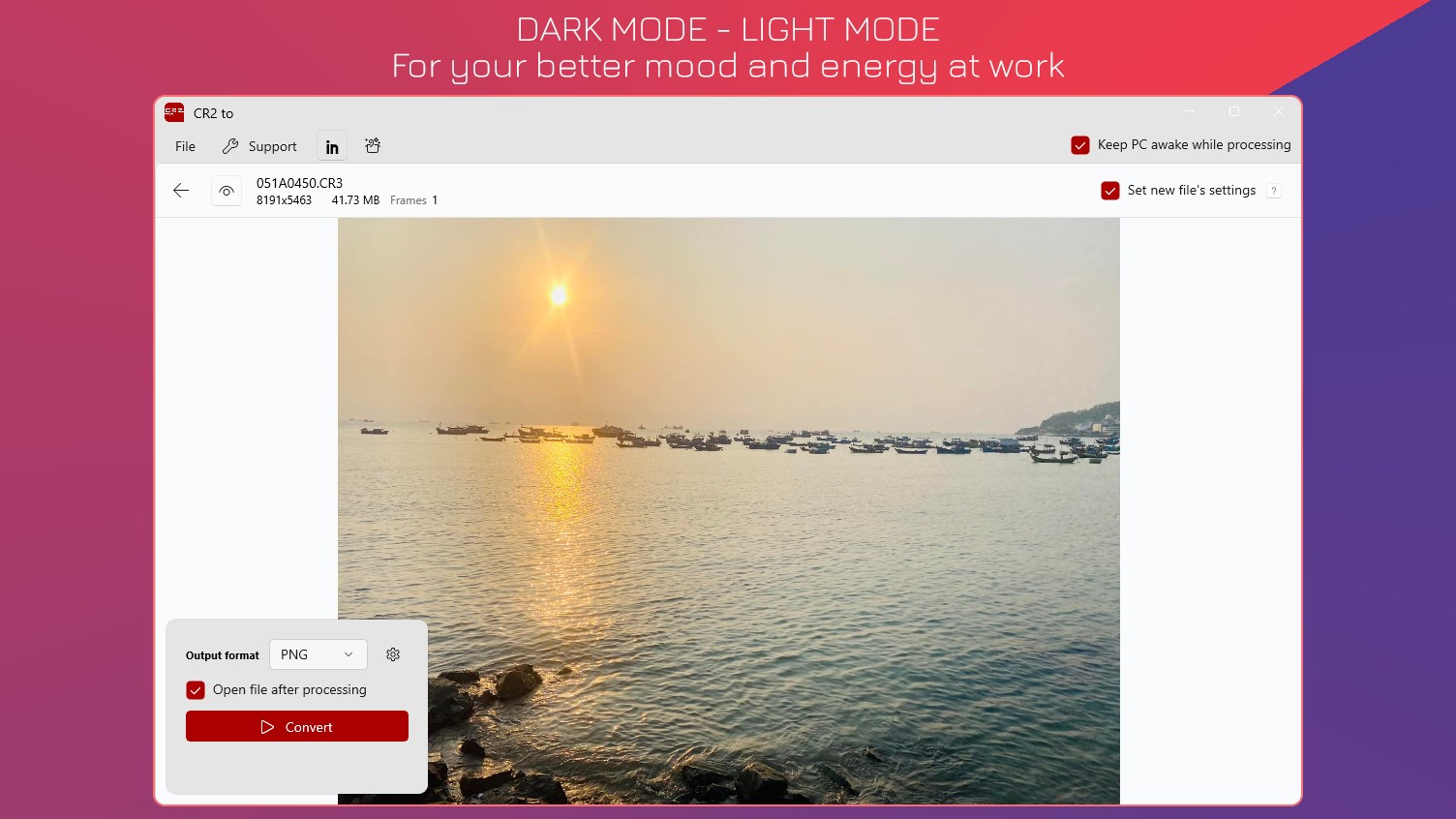 Convert CR2, CR3, CRW to PNG/PNG8, JPG/JPEG, GIF, BMP, ICO, AVIF, WEBP, PBM, PCX, WBMP.