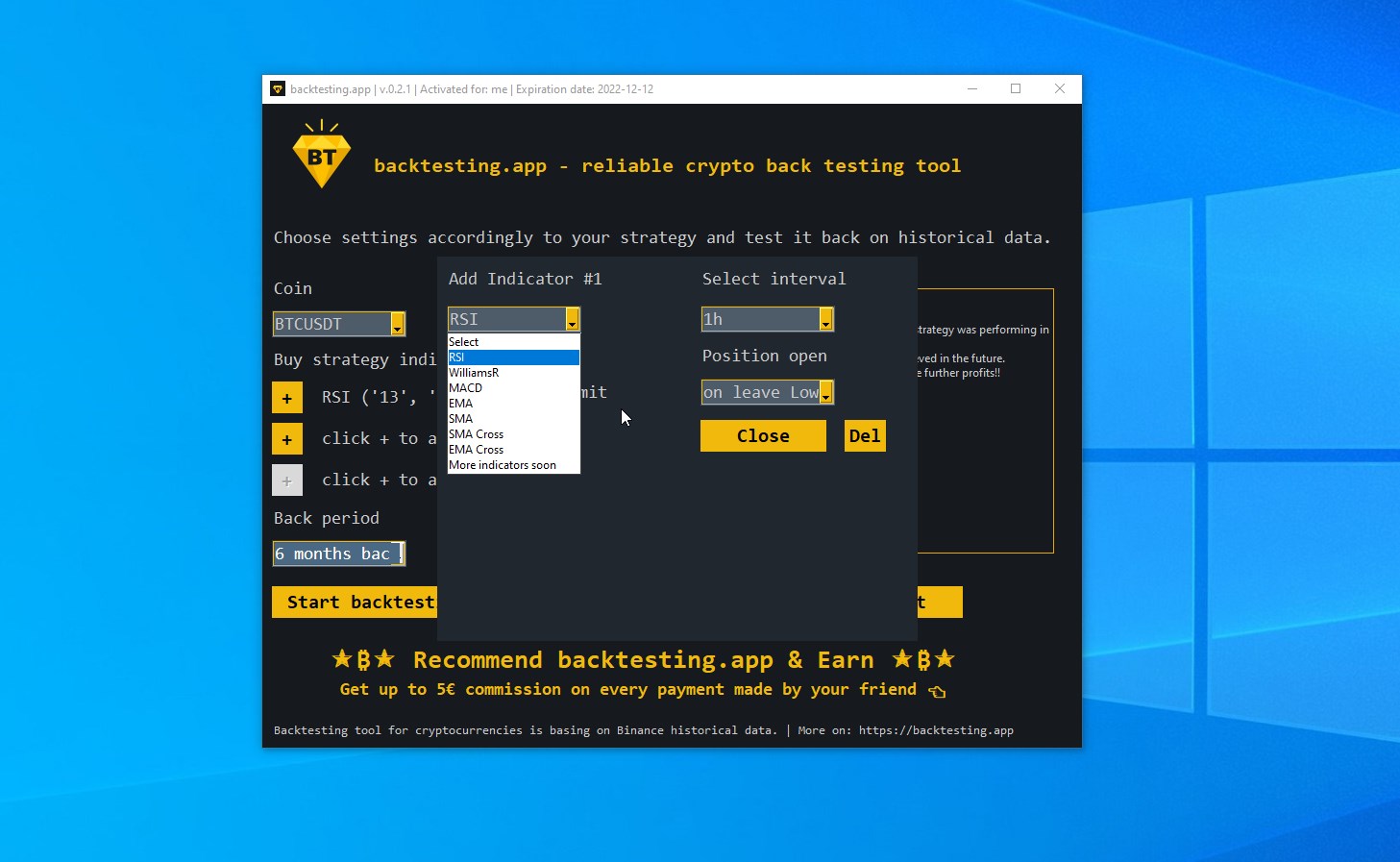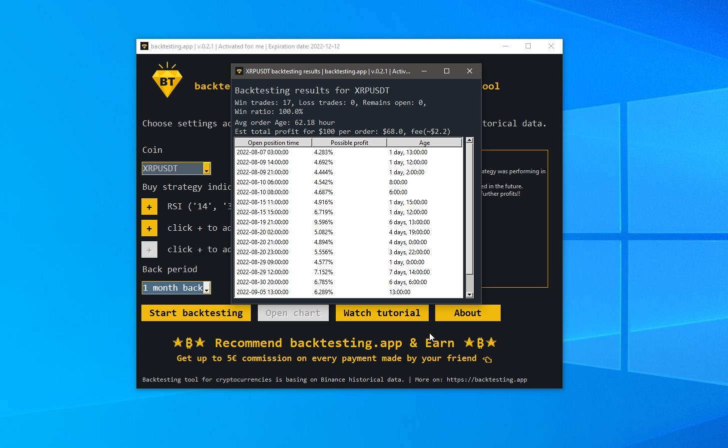 backtesting.app FFREE its a limited version of backtesting.app which is a Windows PC application available as an app from Microsoft Store. Aplication allows to easily build, check and optimise crypto trading stratedy which can be used for manual or bot trading.
