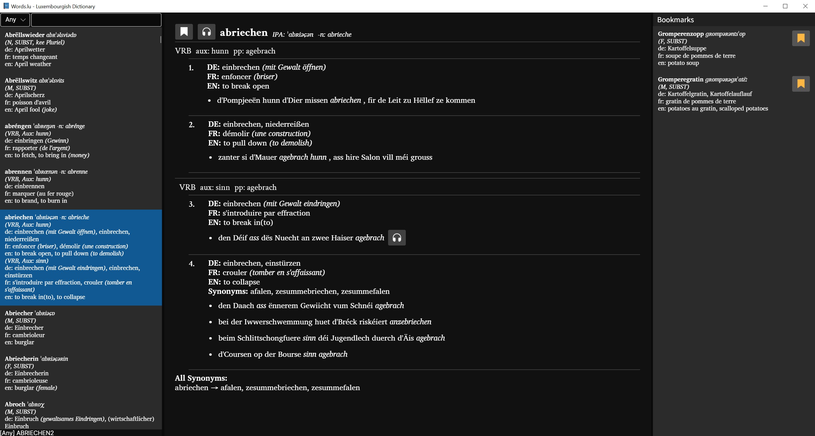 - You can search words and see translations in Luxembourgish, English, French and German.