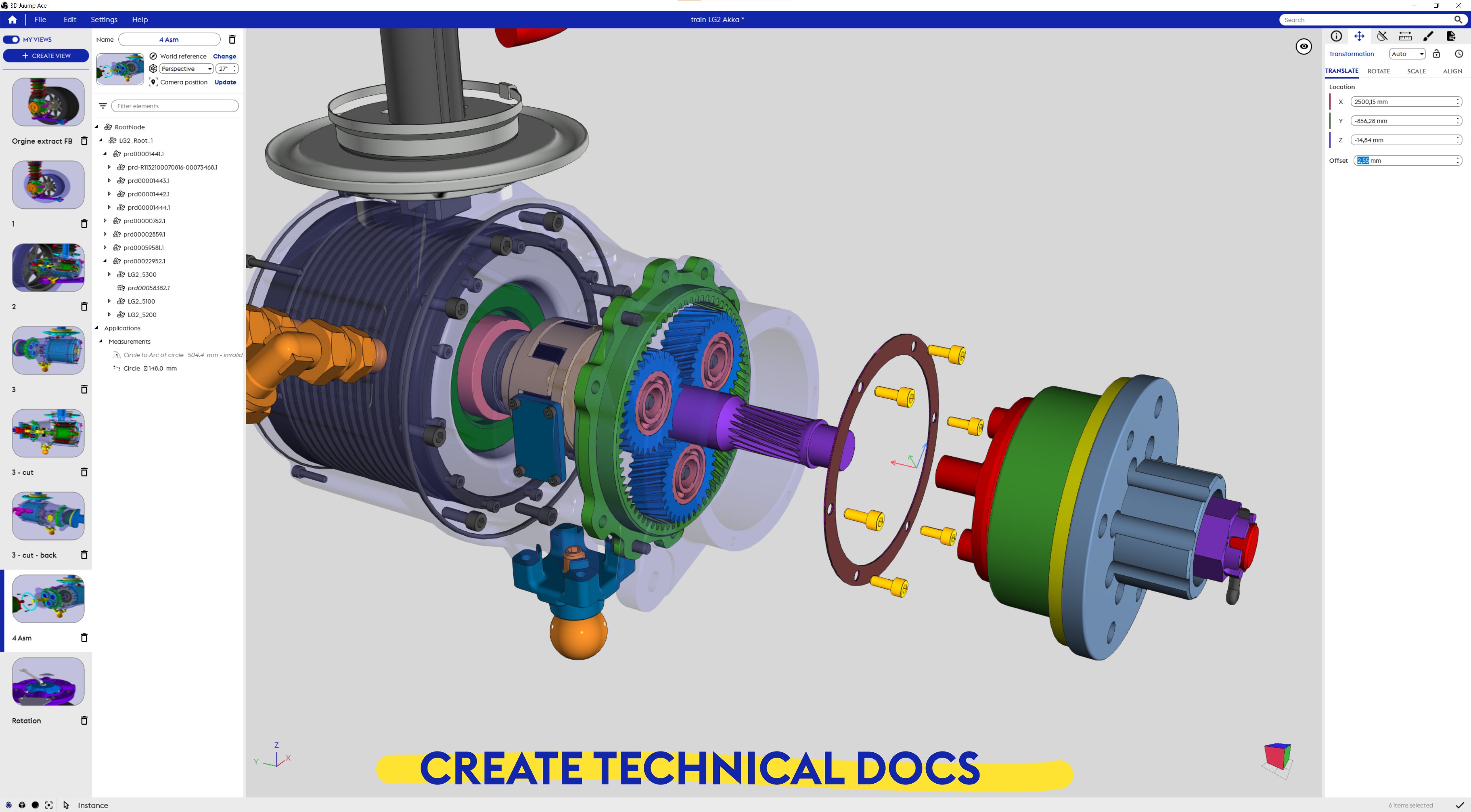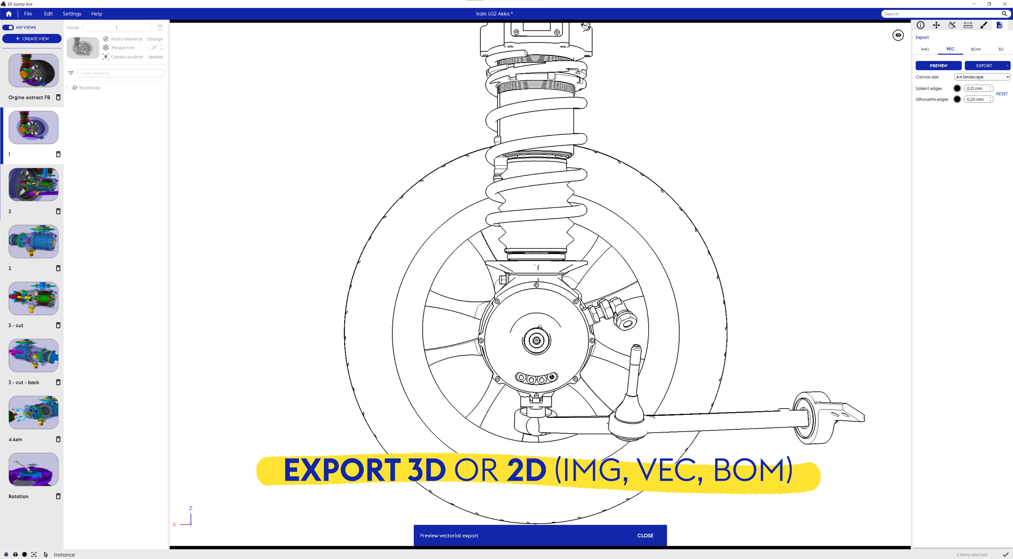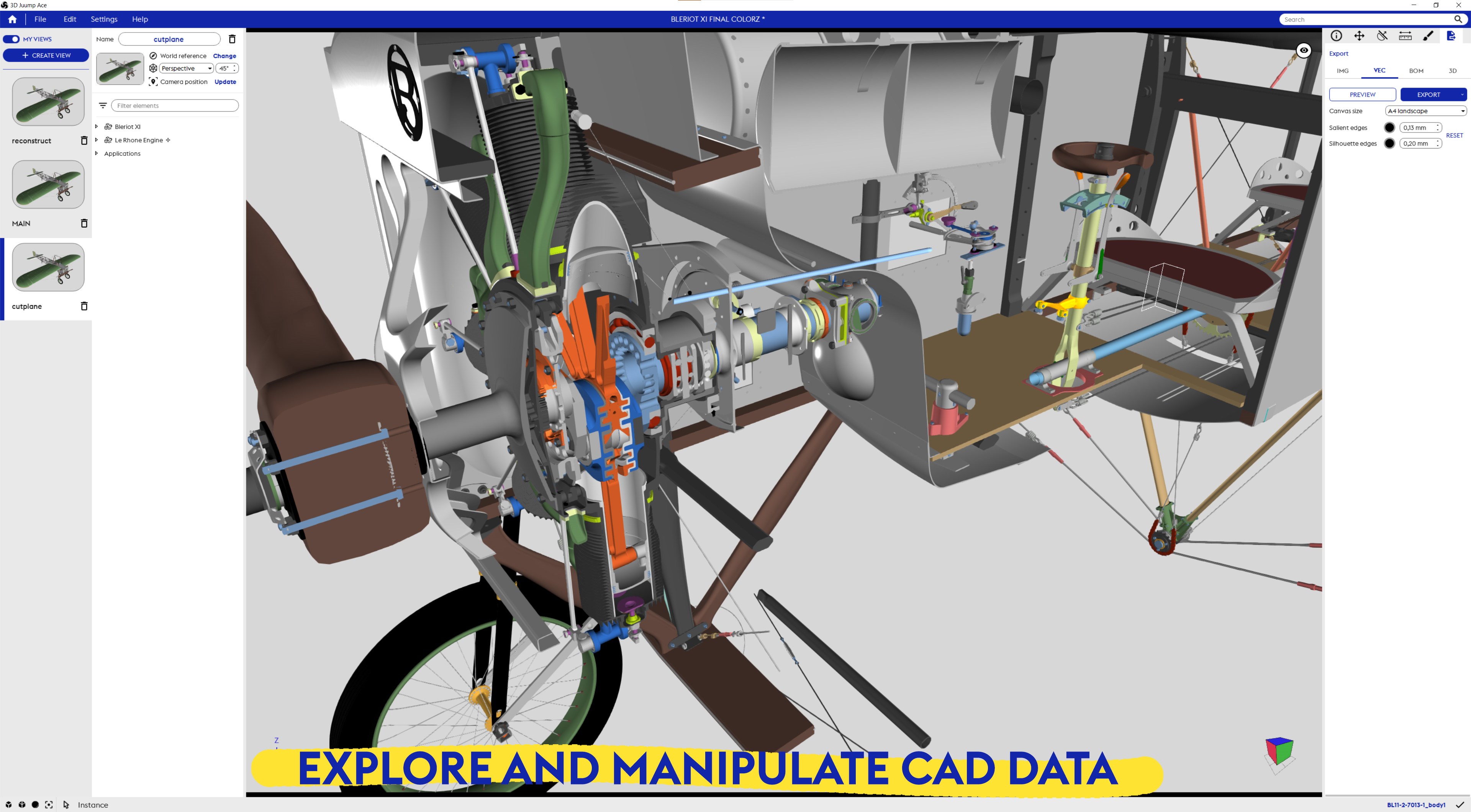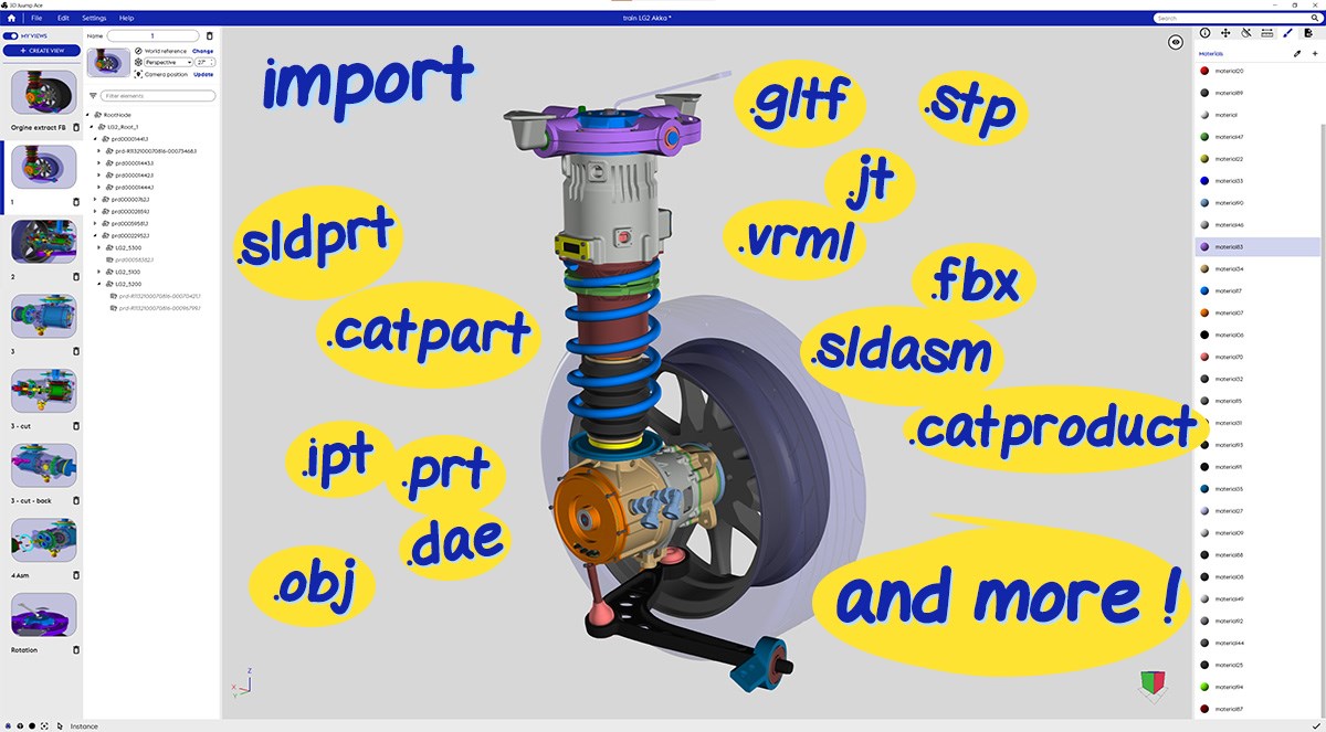 Visualize (orthographic & perspective views)Search thanks to 3D and attributesAnalyse assemblies and product structureMeasure parts, Features...ColorizeVectorize 3D views in 2DMove parts (Rotation, Translation...)Simplify automatically 3D assembliesTag parts or assemblies Import CAD File : ACIS | ASC MEDUSA 3D | CADDS & CAMU | CATIA V4 | CATIA V5 | CATIA V6 | 3D EXPERIENCE | I-DEAS | INVENTOR | NX UNIGRAPHICS | GLB | GLTF2 | PARASOLID XT-FORMAT | PROENGINEER | ... ... |ROBCAD | SOLIDWORKS | STRAESSLE EUKLID | 3DXML | JT | STEP (AP203, AP214 and AP242) | VDA | IGESImport 3D File : AUTODESK 3DS | COLLADA | FBX | GLB | GLTF2 | OBJ | VRML | STL | RHINO 3D |Import Data File : CSVExport 3D File : COLLADA | FBX | GLB | GLTF2 | OBJ | STEP | JT | STL | VRML | SAT |Export 2D File : (Bitmap & Vectorial) : PNG | JPEG | TIFF | SVG | DXFExport Data File : CSV
