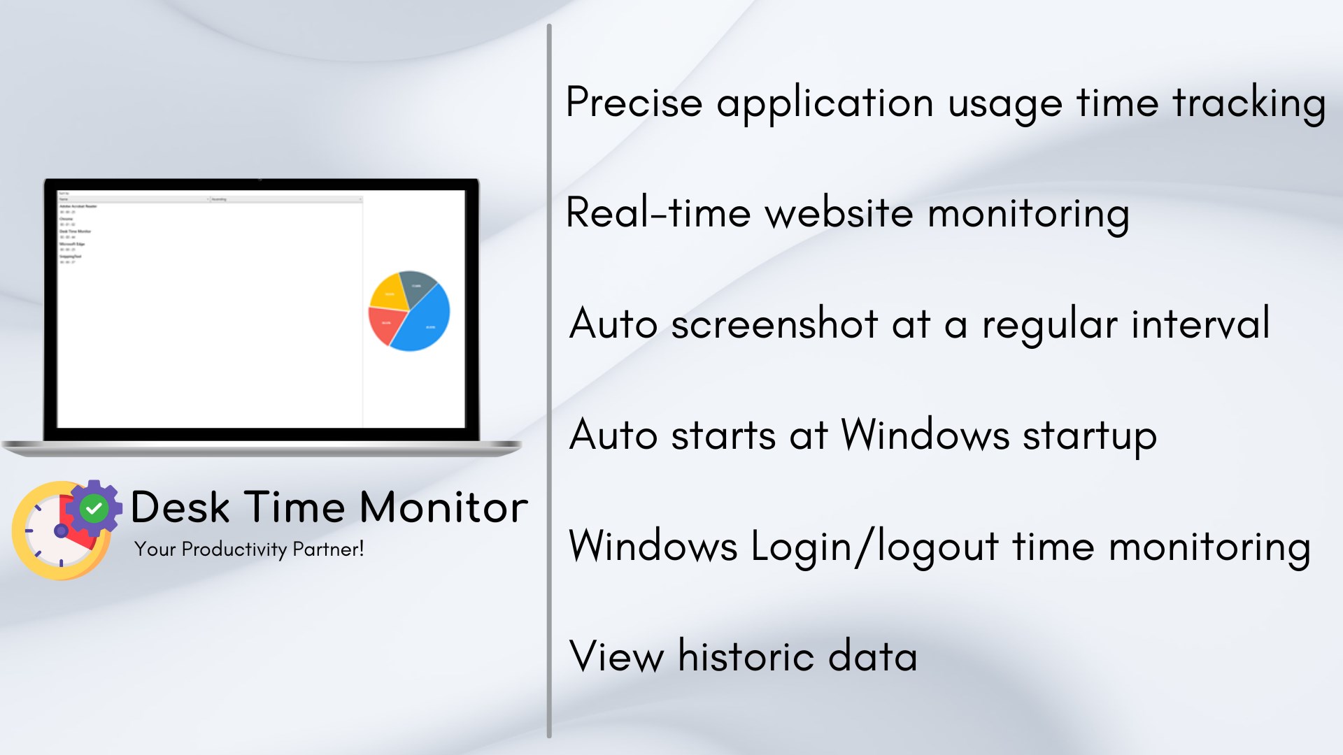 Precise Time Tracking: Accurately monitor every second of your workday to optimize time management.Website Usage Analysis: Identify and manage distractions with real-time website tracking.Configurable Screenshots: Customize screenshot intervals to capture work progress effectively.Login & Logout Monitoring: Track login times to understand work patterns and productivity.Auto start: Automatically start Desk Time Monitor with Windows for effortless tracking.