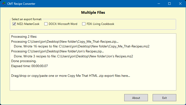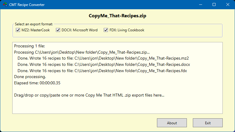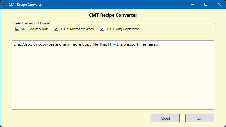 Convert Copy Me That recipes exported in HTML .zip format into other recipe formats: MasterCook (.mz2), Microsoft Word (.docx), and Living Cookbook (.fdx). You must export your Copy Me That recipes in HTML format, not in text format.