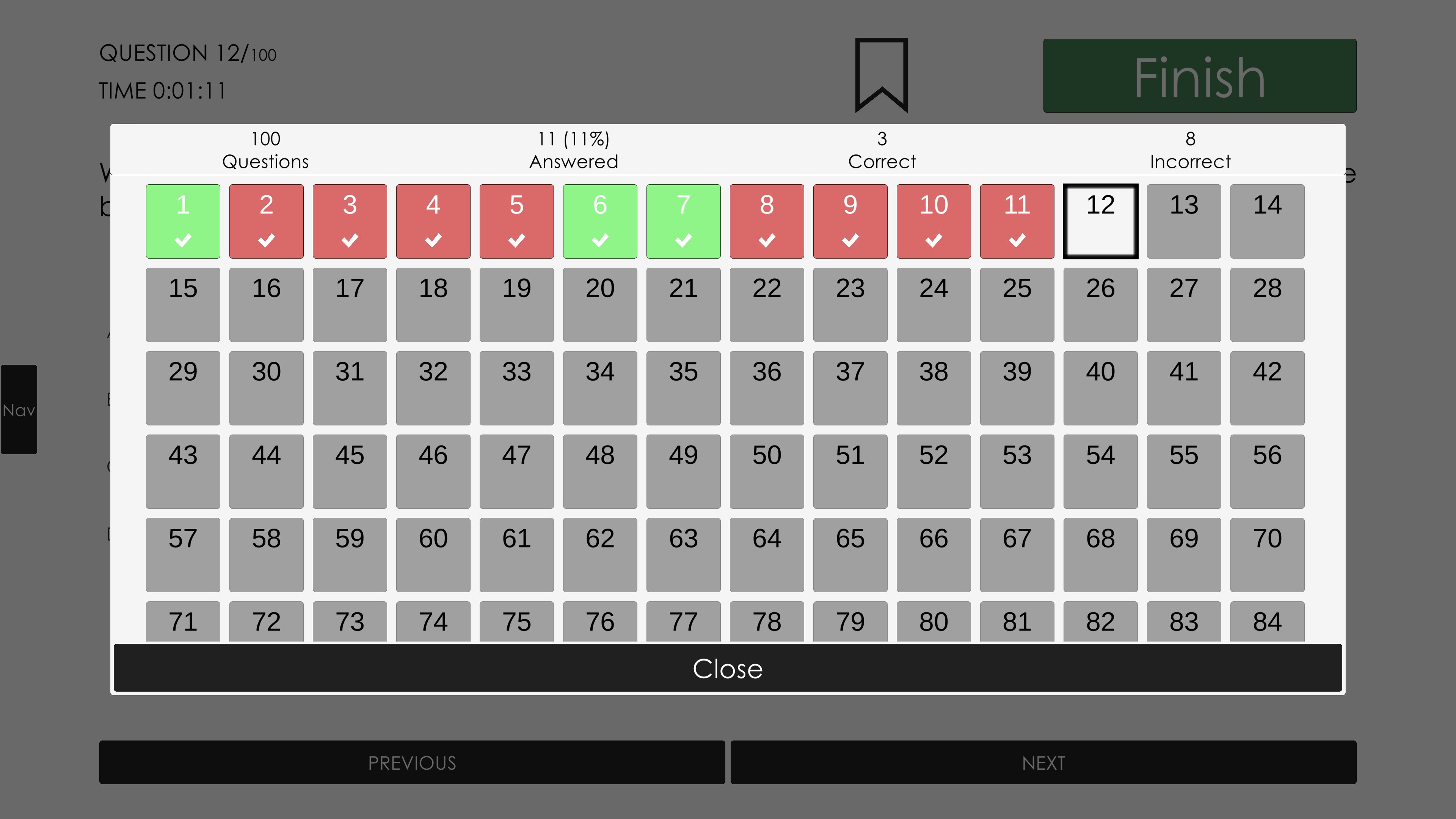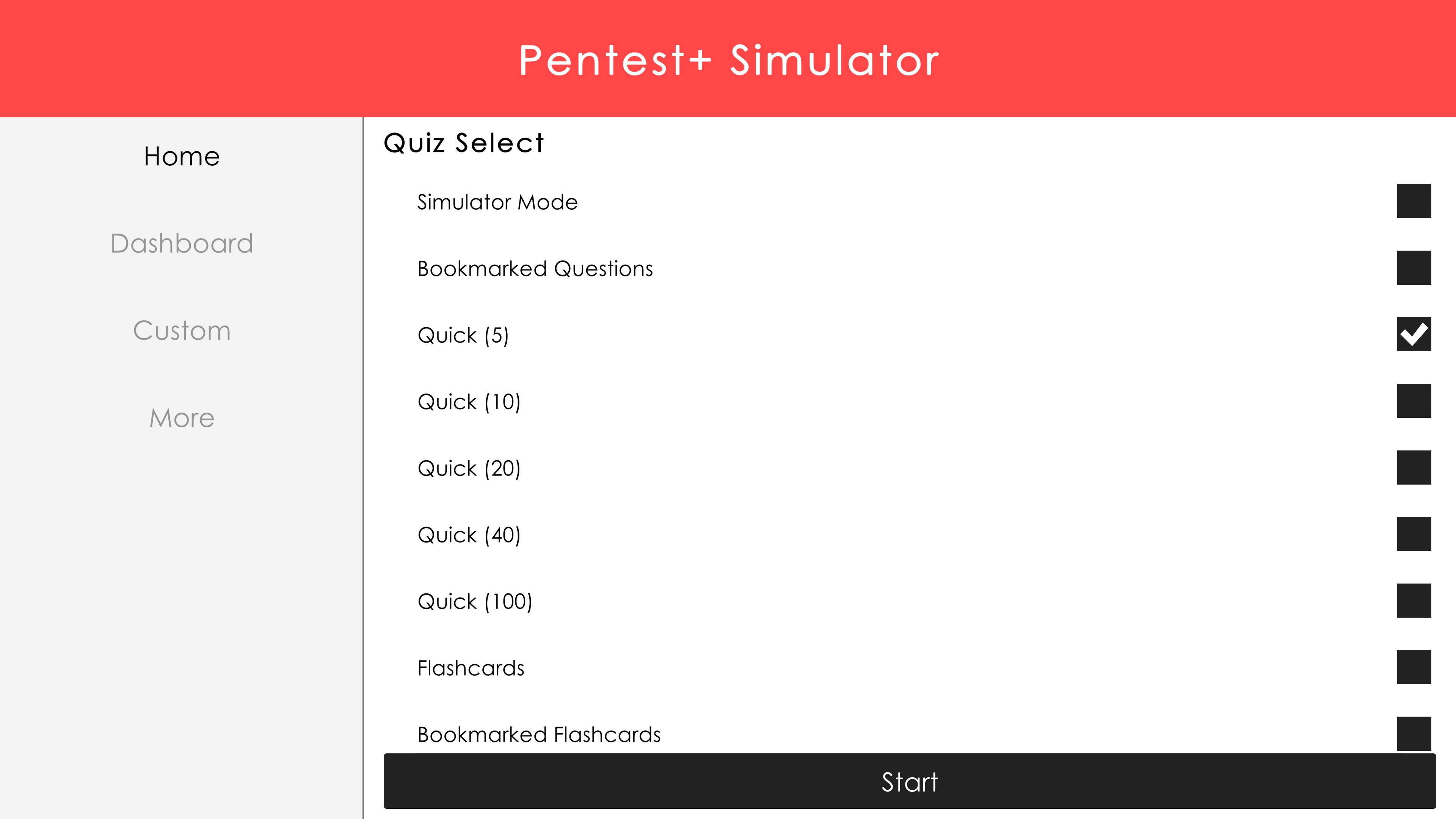 Allows you to quickly start a 5, 10, 20, 40, 50 question exam with randomized questions.