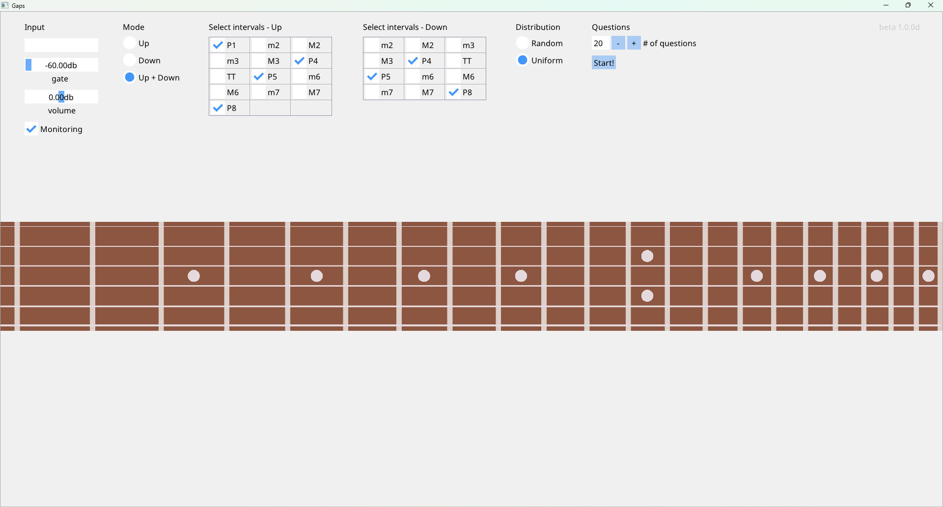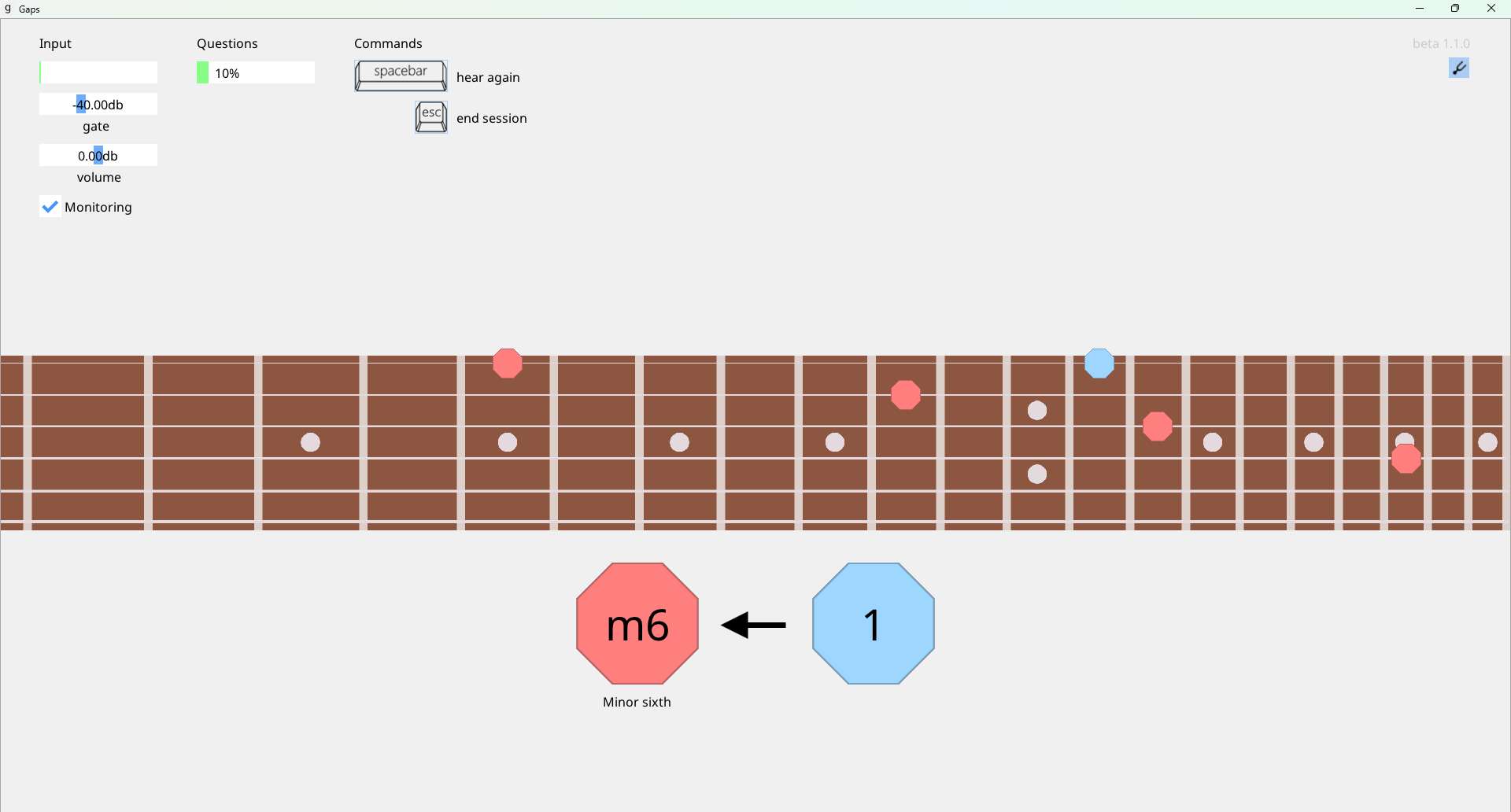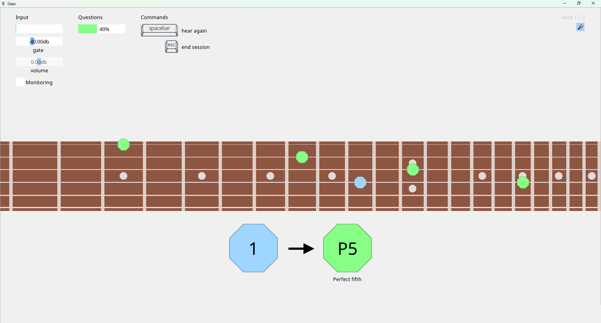 Gaps is an ear training software tool for guitarists. It uses your guitar microphone as an input for its exercises, so you will learn both to recognize intervals by ear and to find them on the fretboard at the same time.