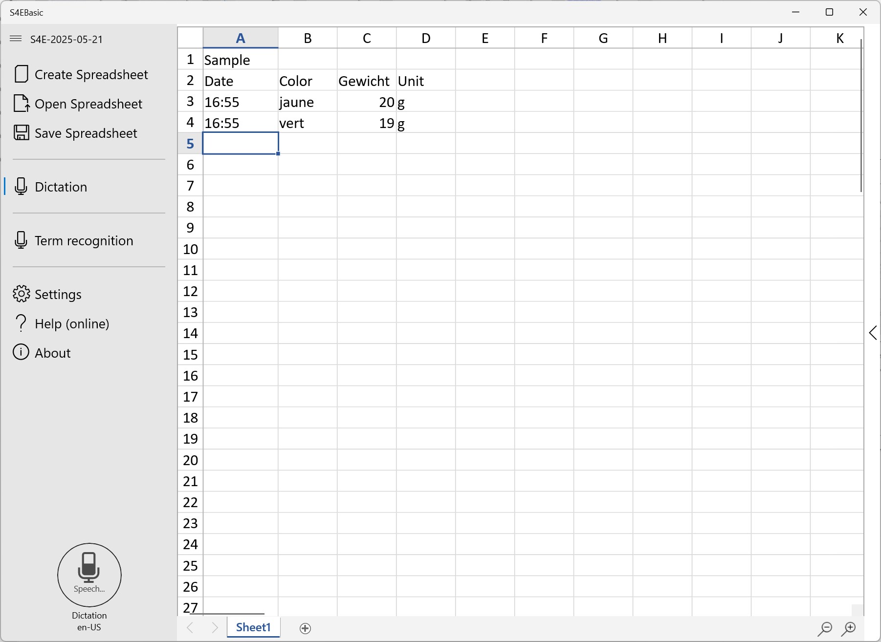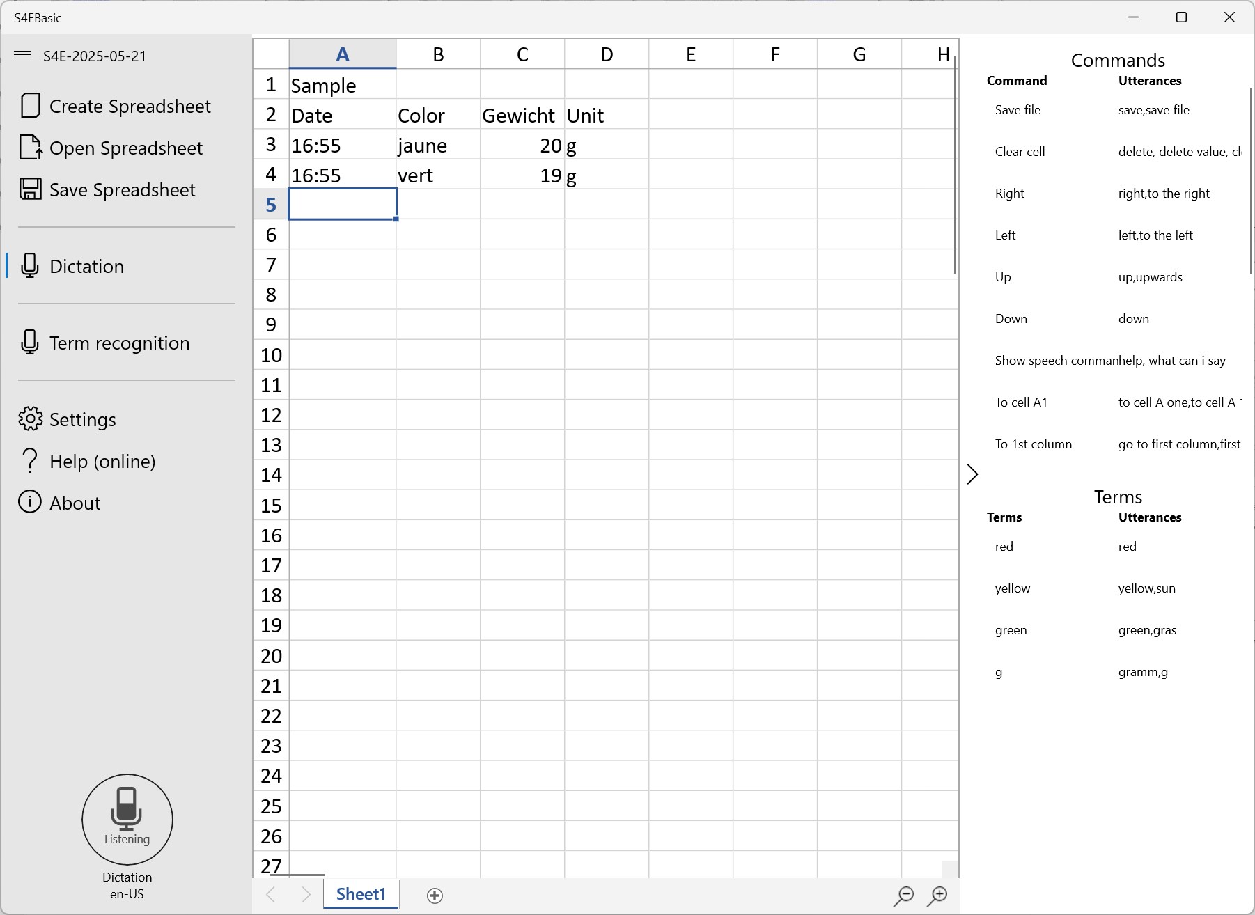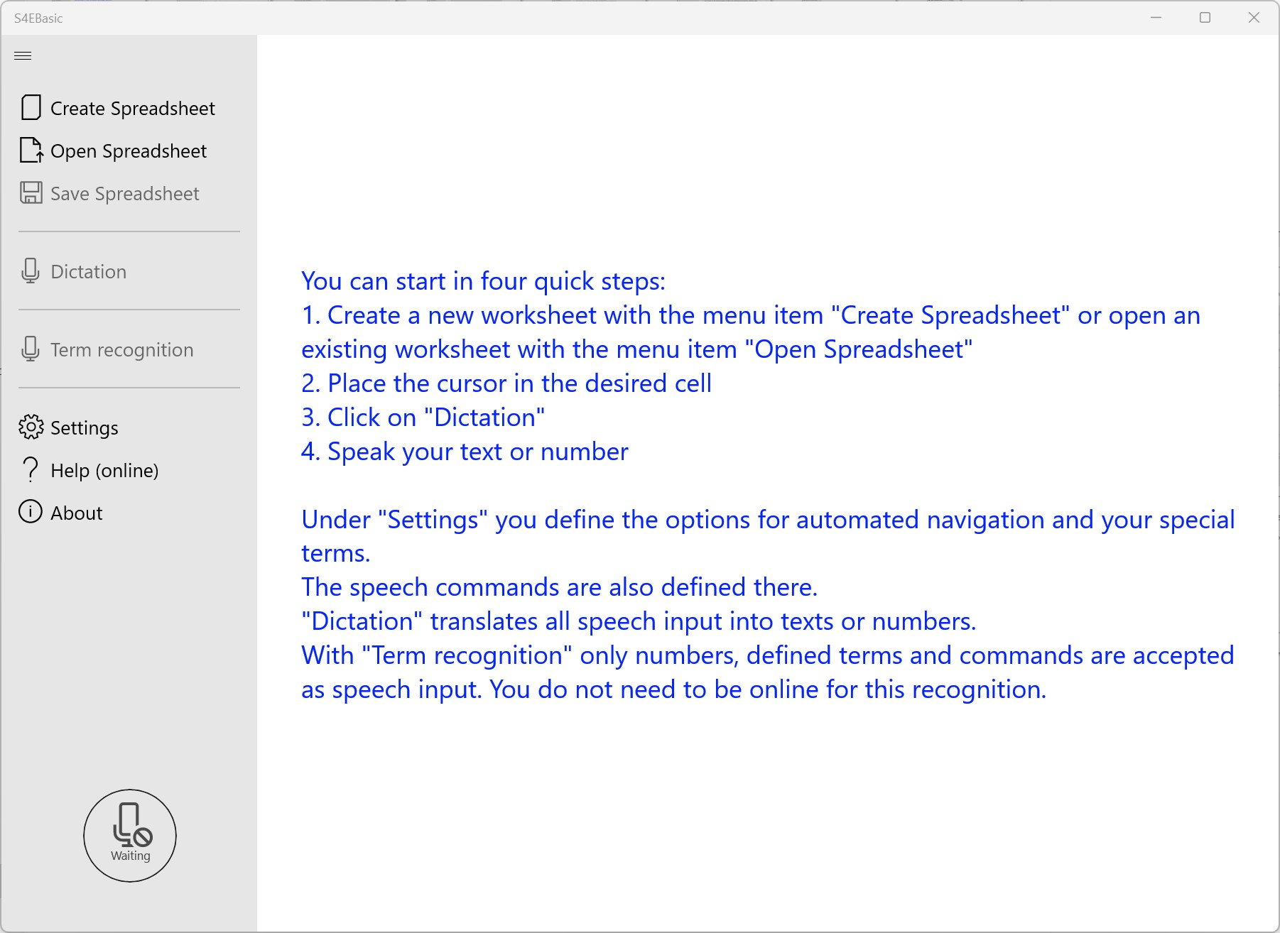 Speech input in Excel sheetsEasy and simple to use and configure Dictation of normal text including punctuation marksTechnical vocabulary/complicated texts can be defined in the term recognitionTerm recognition is offline usableNo need to install Excel