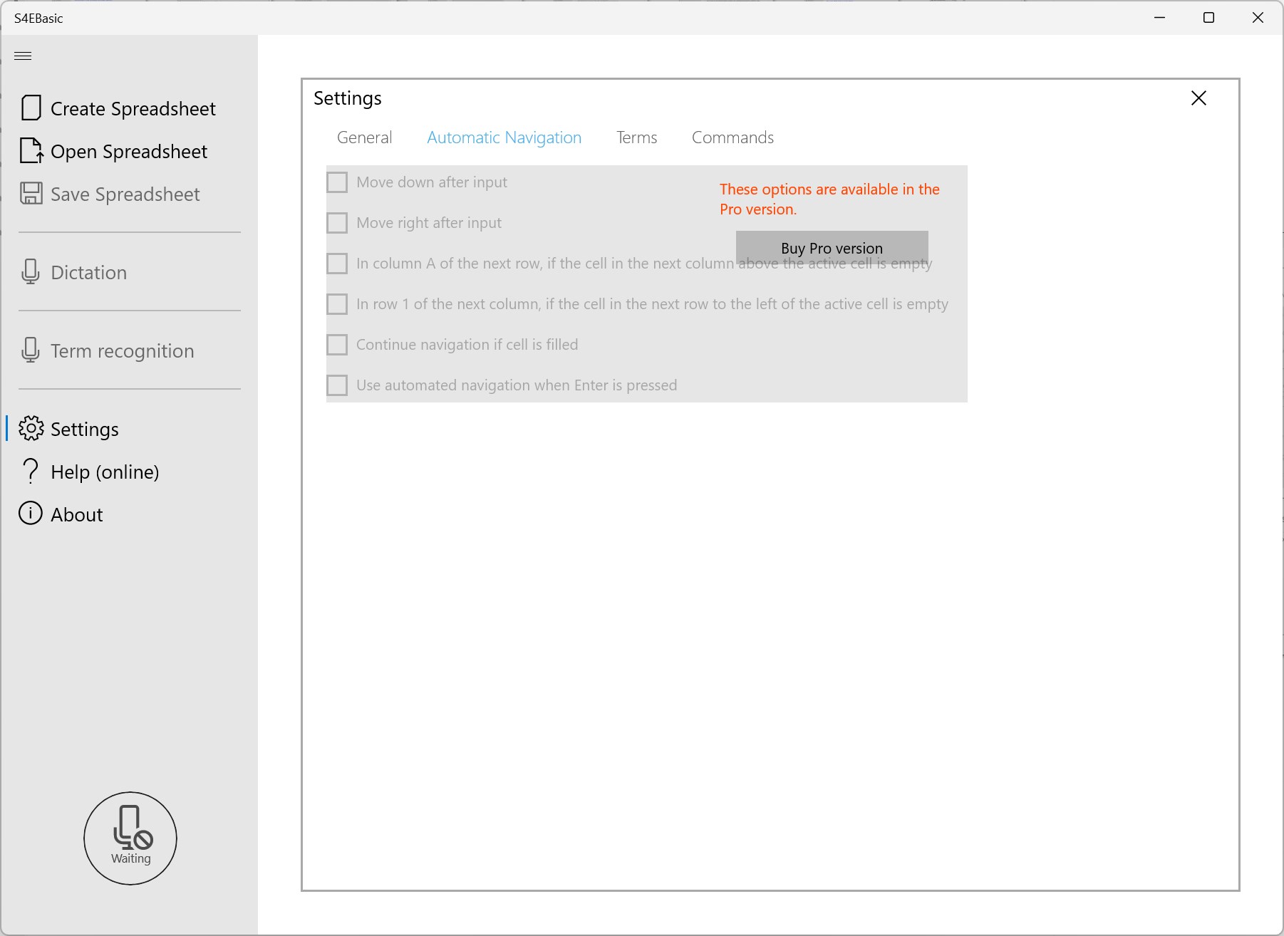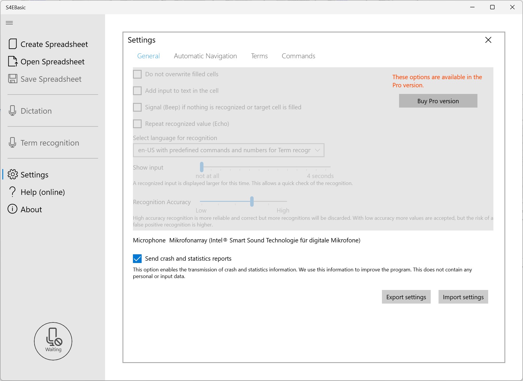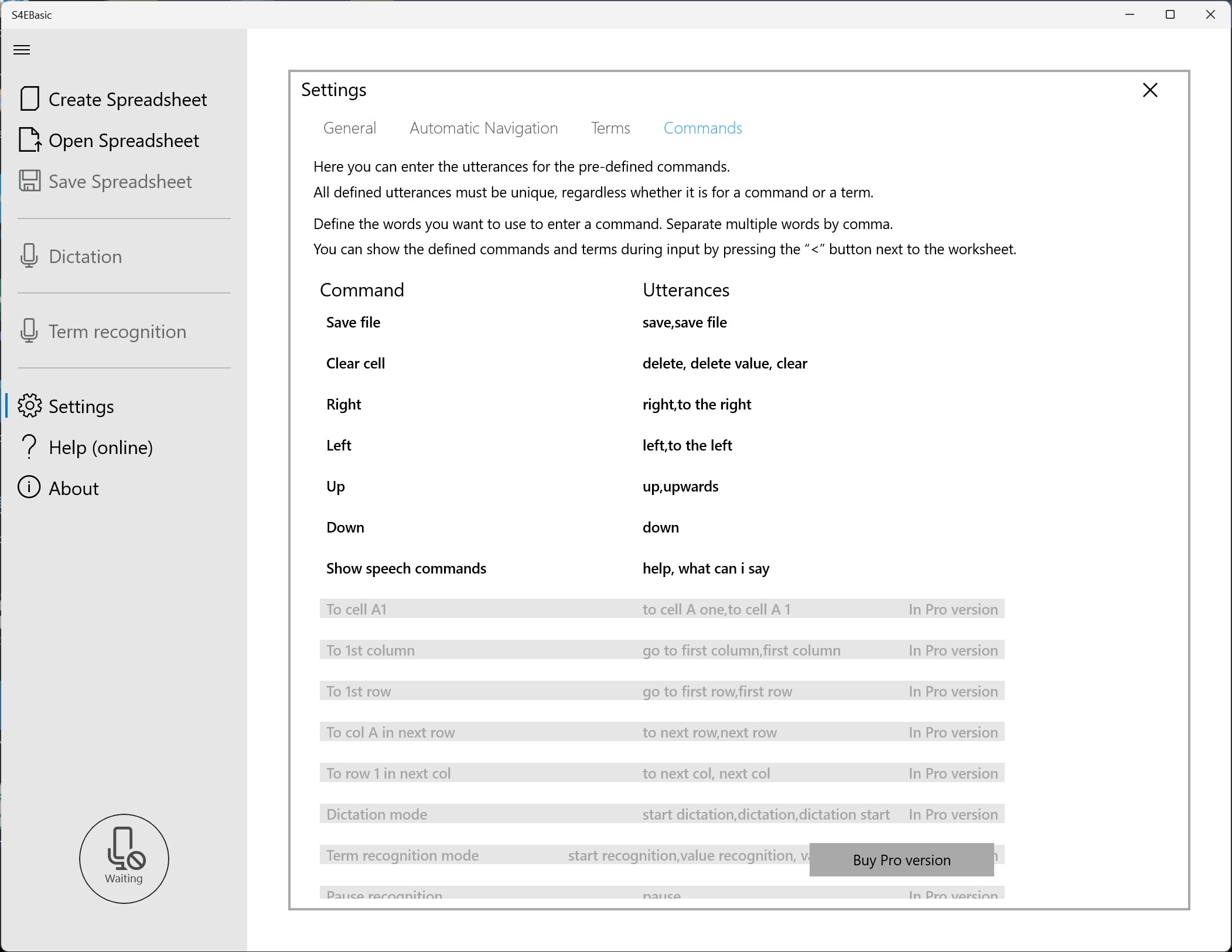 If you want full functionality, buy Speech4Excel Pro. The recognition capabilities are the same in both versions, but the Pro version has many more configuration options.