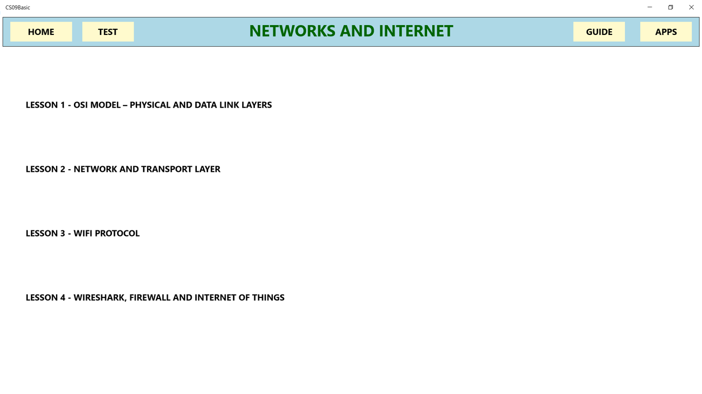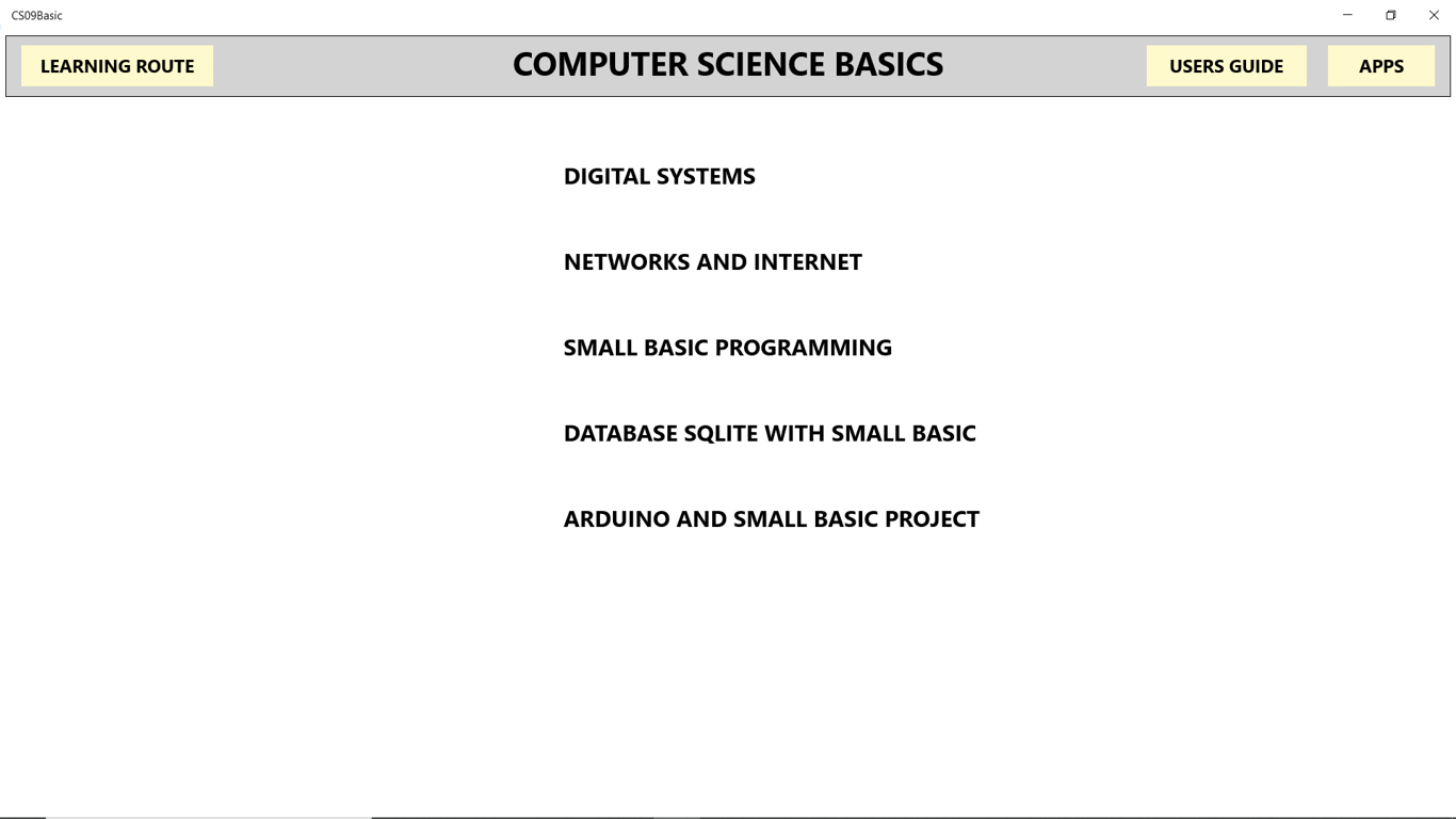 Much of this work is already contained in the Computer Systems One, Computer Networks One, Programming Small Basic and Computer Database SQLite applications. The Computing Impacts module is completely new. Anyone who wants to learn and experiment more with Arduino can use the Arduino Computer Science application.