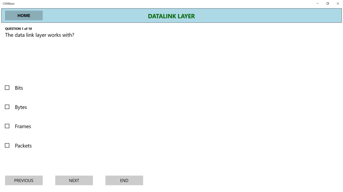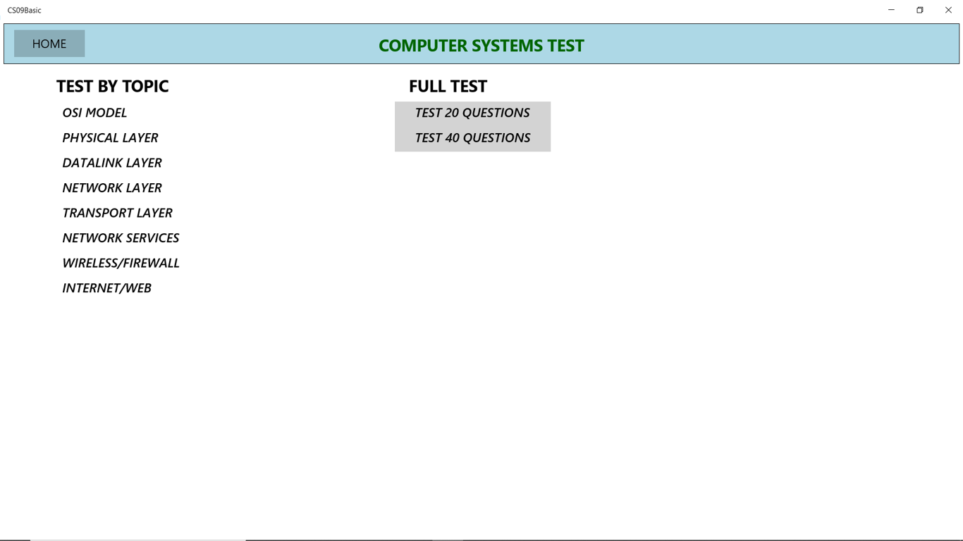 COMPUTER NETWORKS ONE – OSI model, physical layer, data link layer, network layer, transport layer, wireless network, network layer services, transport layer services, Wireshark and Firewall. Tests - 80 questions by topic, 20 questions randomly select and 40 questions randomly selected.