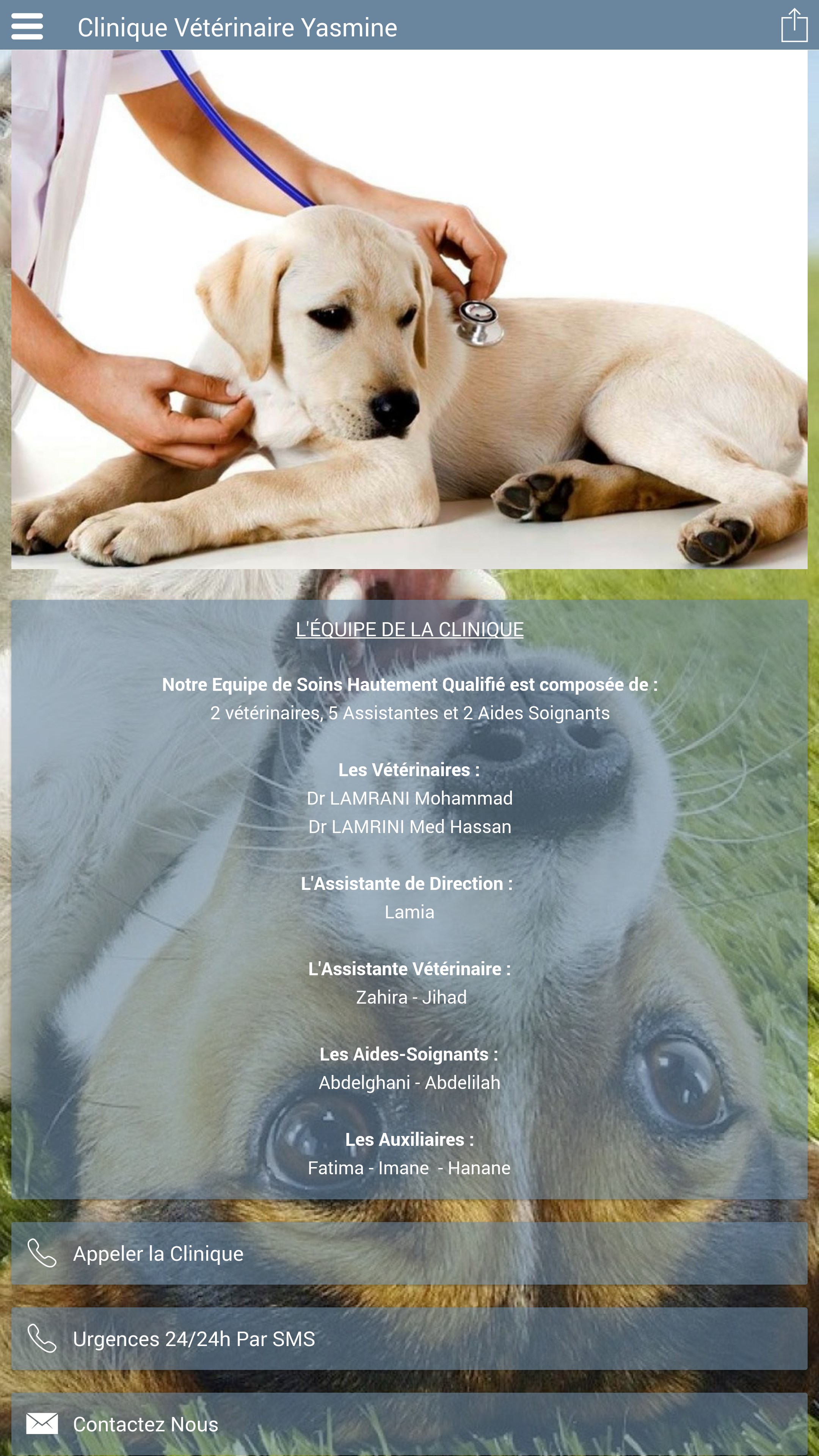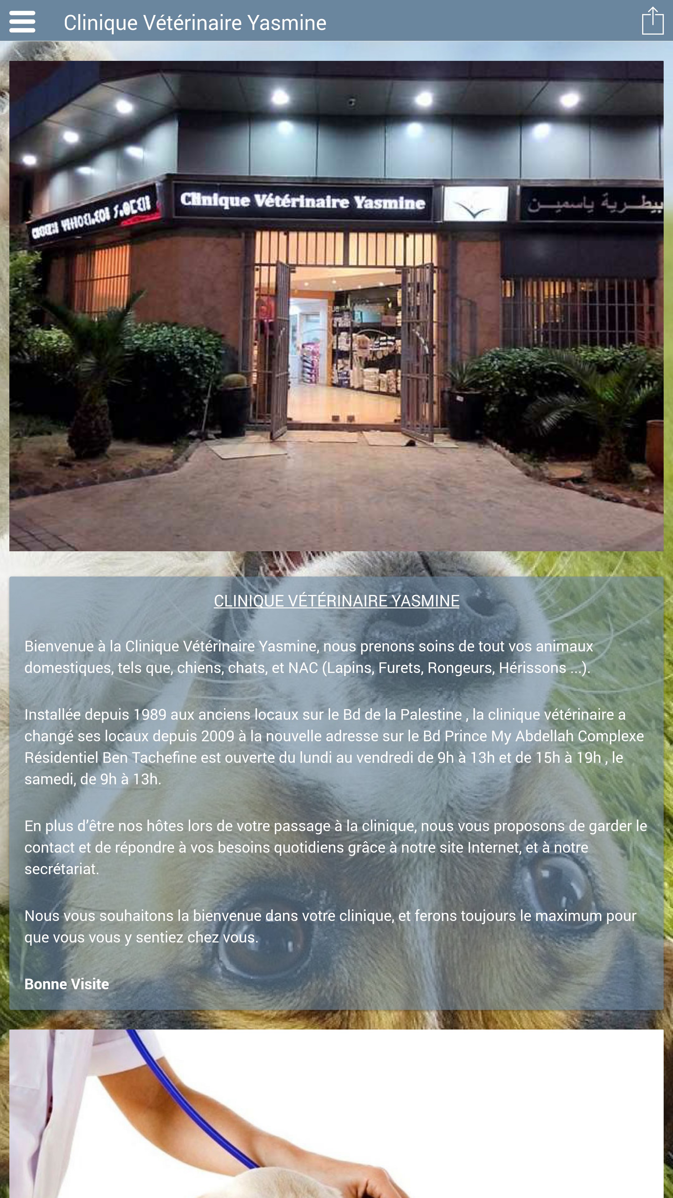 Avec notre Application Officielle, Obtenez les dernières informations concernant la Clinique Vétérinaire Yasmine Marrakech, nos Fiches Santés Animalières, et la possibilité d'accéder en ligne à votre E-Carnet de Santé de votre Animal, et prendre RDV en Ligne.