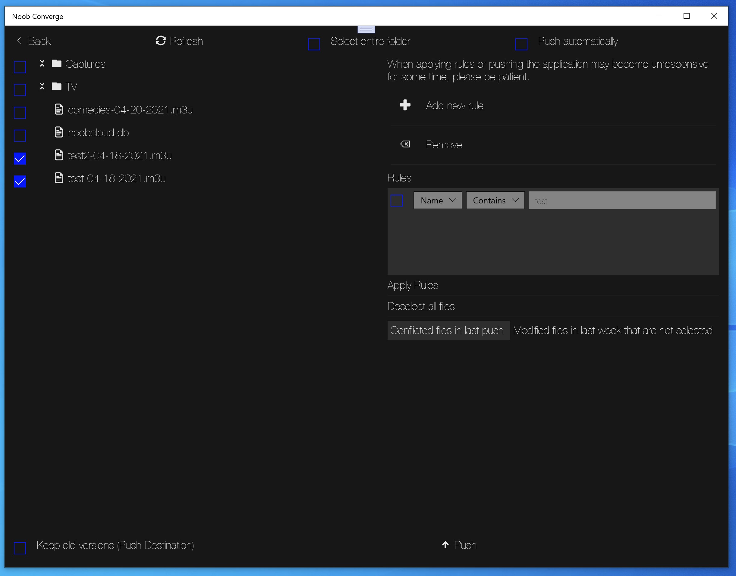 Note that the default behaviour is to overwrite files which are less recently modified than the files being pushed, unless you choose "Keep old version" in which case your old versions of files being overwritten are stored in a folder called converge_old_versions. When selecting files to be pushed, first create rules you want to apply (all rules must be fulfilled by a file to be selected), then apply rules. Then manually select/deselect files from the file browser on the left to further configure selected files. When creating rules you can use the | symbol to specify "or" between values for example: file type is: mp4|mp3 means file type is mp4 or mp3. To display modified files in the last week that are not selected to be pushed, click the tab by that name in the bottom of the screen. Files that are not overwritten because a more recent version exists in the backup location are logged in the conflicted files tab.