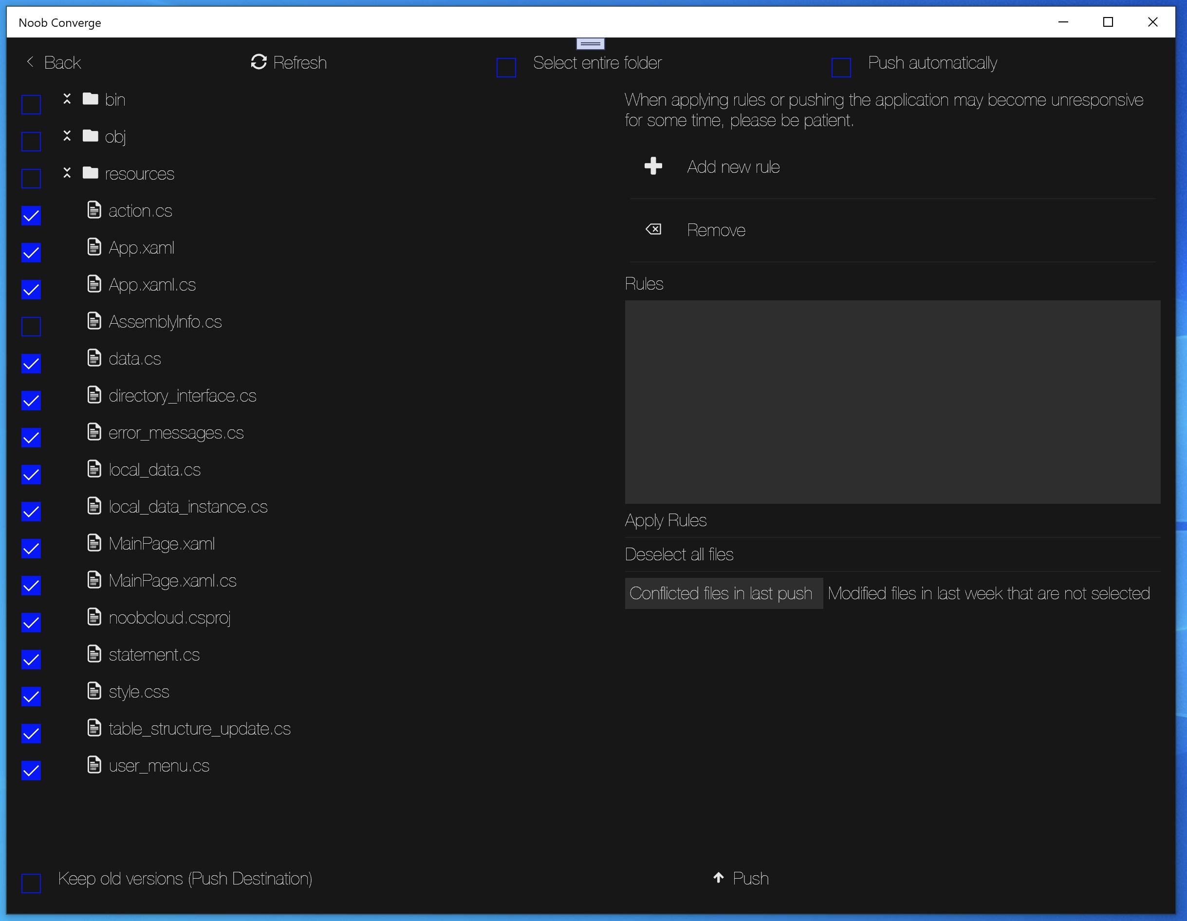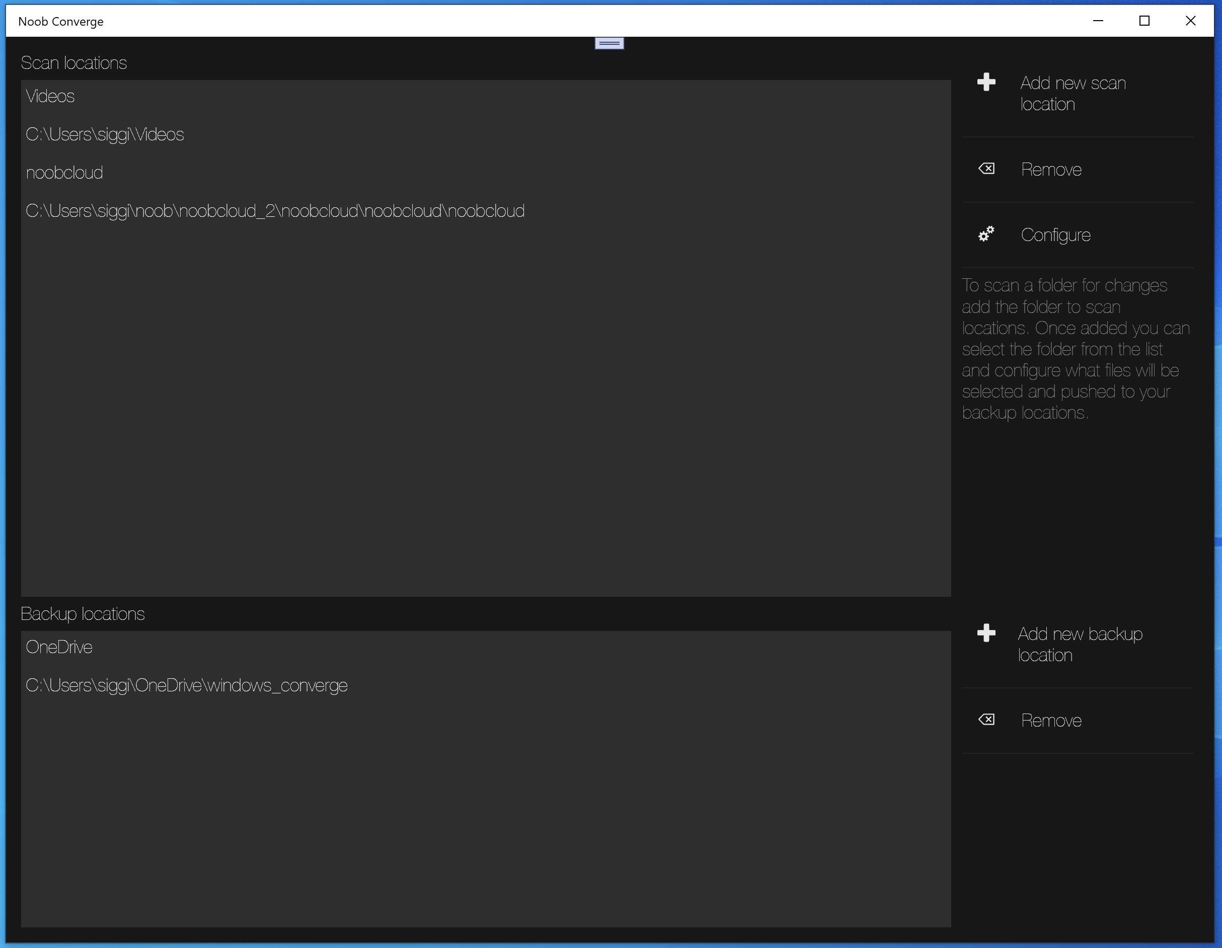 Converge is useful tool for anyone that wants to save space on their cloud drive or save time and energy. Have you ever found your self copying the same files over to your cloud or external drive again and again, or ever found that you only need a fraction of the files your copying to be backed up. Then Noob Converge is for you. Noob Converge helps you find a point of Convergence for your files in your Cloud drives or external drives, by letting you scan chosen directories for changes, select files within that directory to be pushed, manually or using a set of rules to be applied, then you can push the selected files to your backup locations effortlessly. Only modified files are pushed, if your backup location has a more recent copy of a file that file will not be overwritten and you will be notified of the conflict in the "Conflicted files" tab. You can also check which files have been recently modified which are not currently selected to be pushed.
