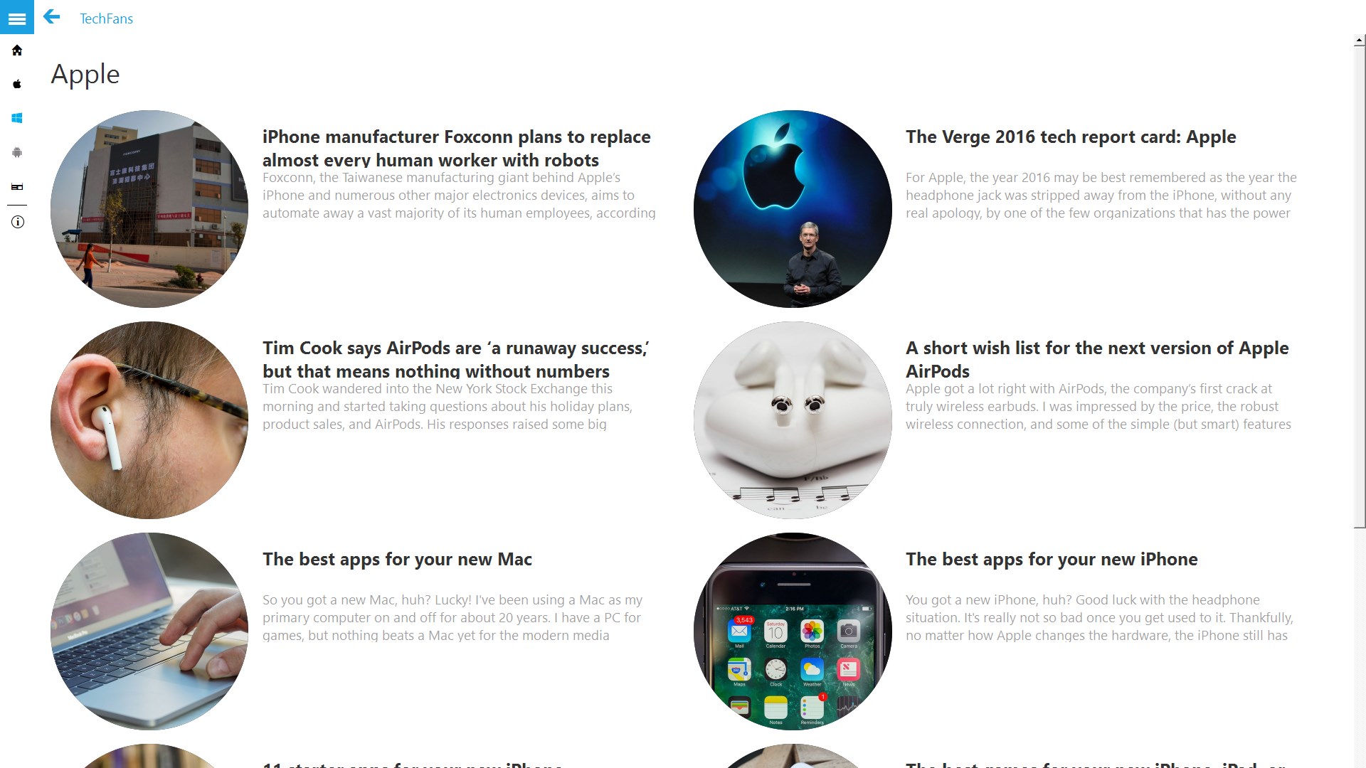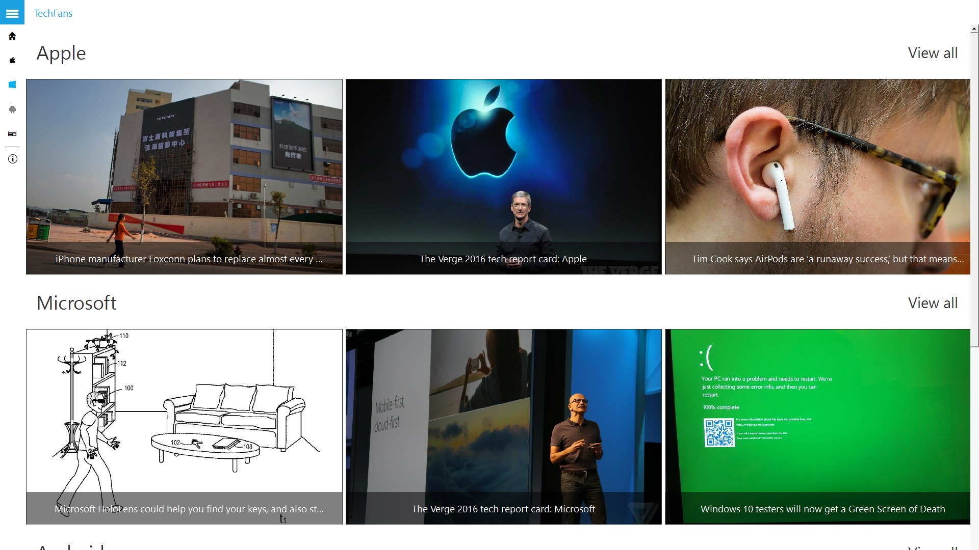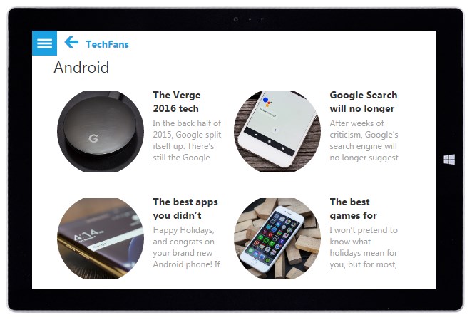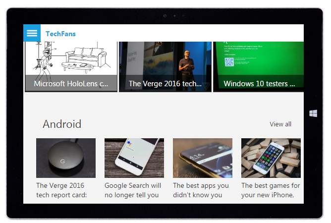 Stay connected Always with the Technological World with High Quality News Feeds. A Must have app for TechFans. You can view/read it even in \'Offline\' mode.You can Search the app\'s contents (loaded) via search in Menu.Best thing is that Once you click on News it will first show you Only 2 Paragraphs (approx.) & if you are interested then can click on read more...Officially connected with CSTechFans.com to Bring its News Feeds to You via App.TechFans App is Exclusively available on Windows 10 Universal Platform.