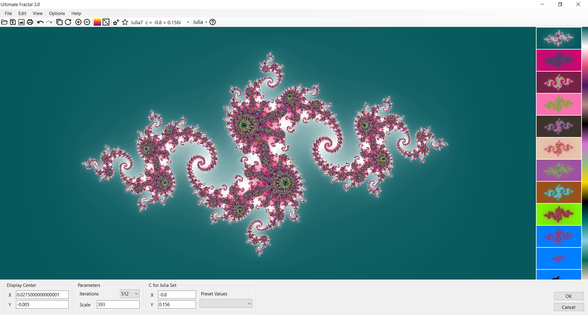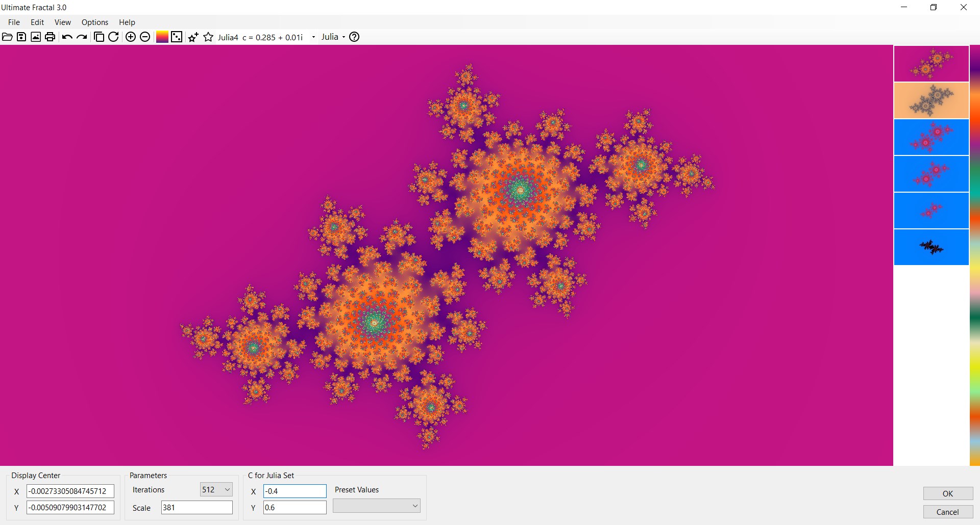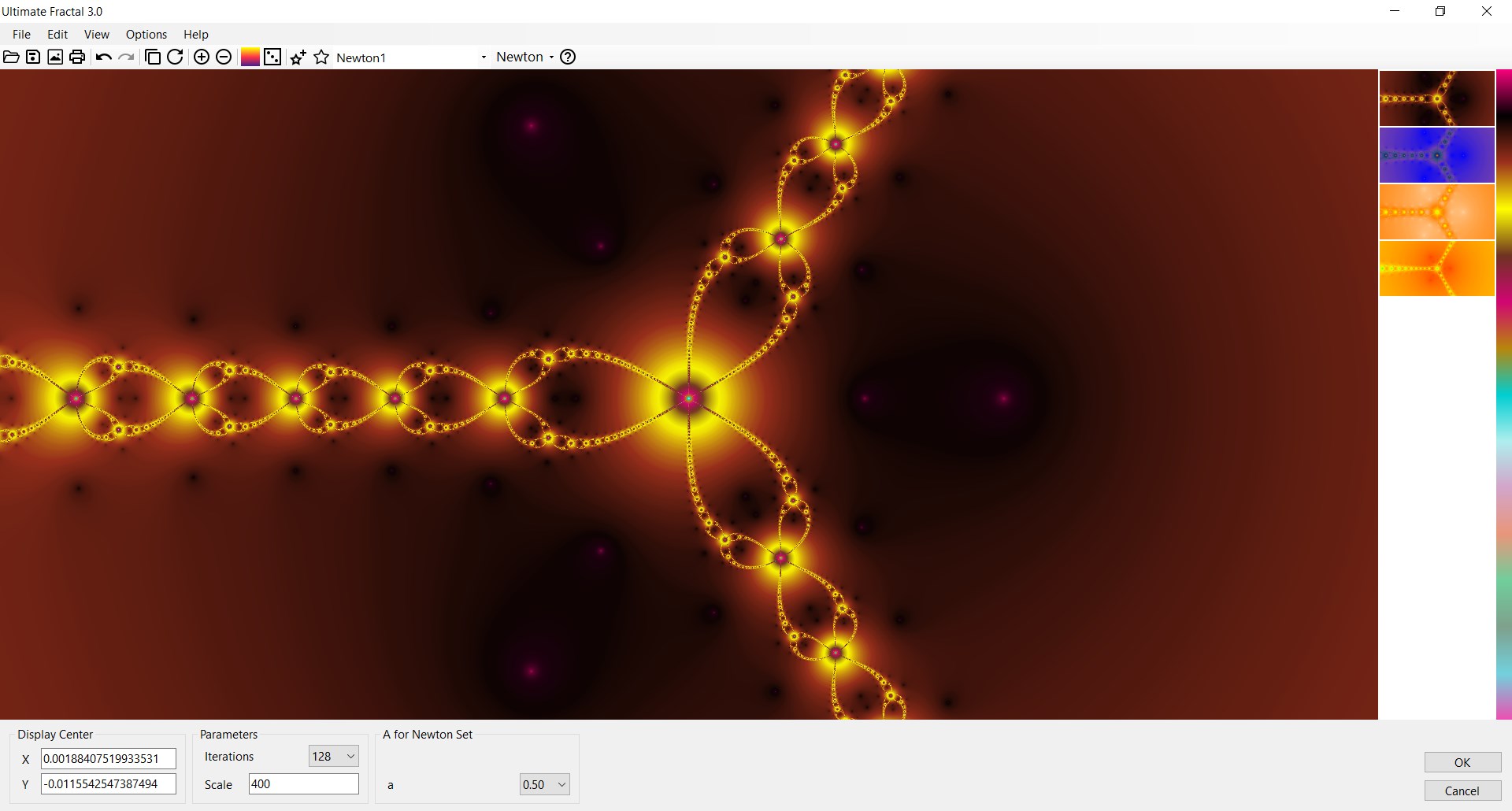 Mandelbrot, Cubic Mandelbrot, Quartic Mandelbrot fractalsJulia fractalsNewton fractalsColor gradient and hue variation to colorize the fractalAdjust the display center, the maximum number of iterations, the magnification or scale, and the complex parameter C
