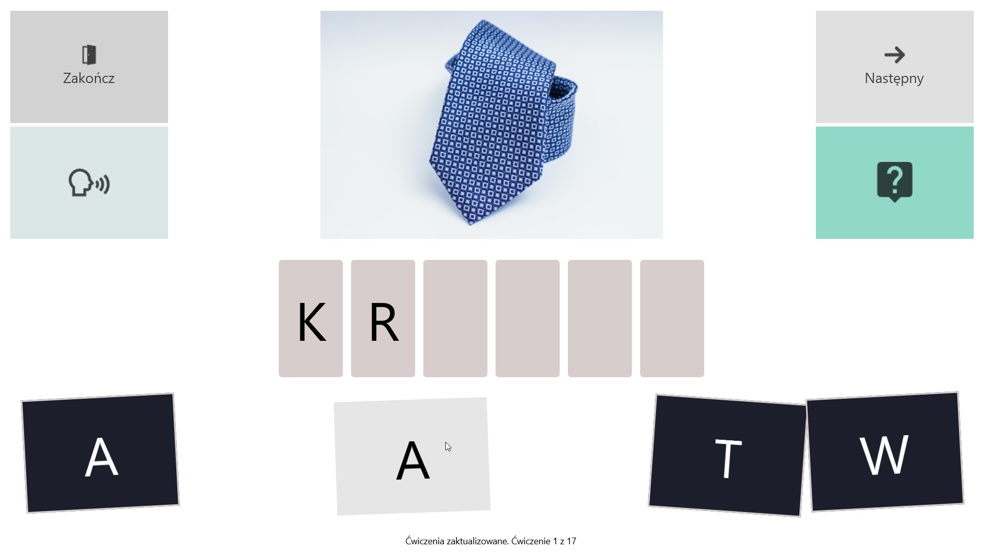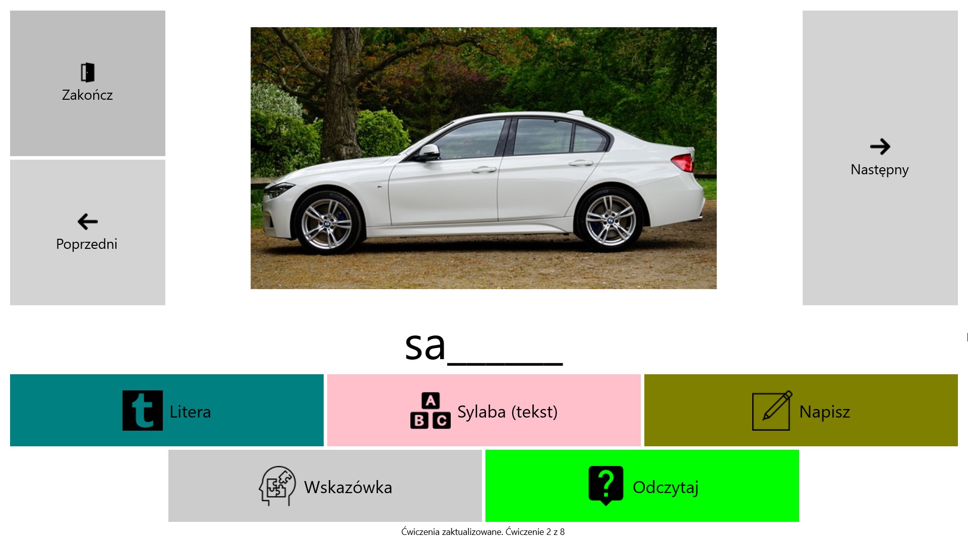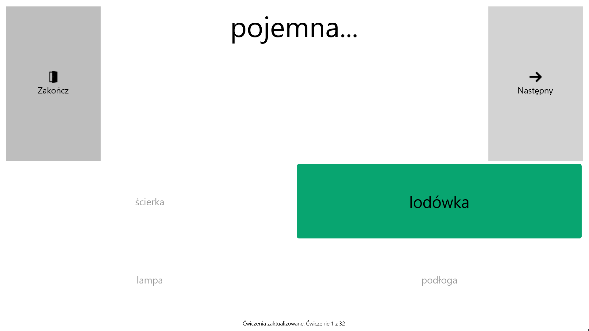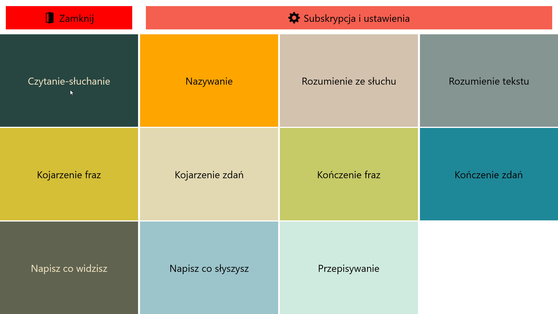 Obraz, dźwięk i tekstDziała bez internetuEkran dotykowy lub myszNazywanieKojarzenie frazKojarzenie zdańKończenie frazKończenie zdańPrzepisywanieRozsypki wyrazoweCzytanie-słuchanieRozumienie ze słuchuRozumienie tekstu