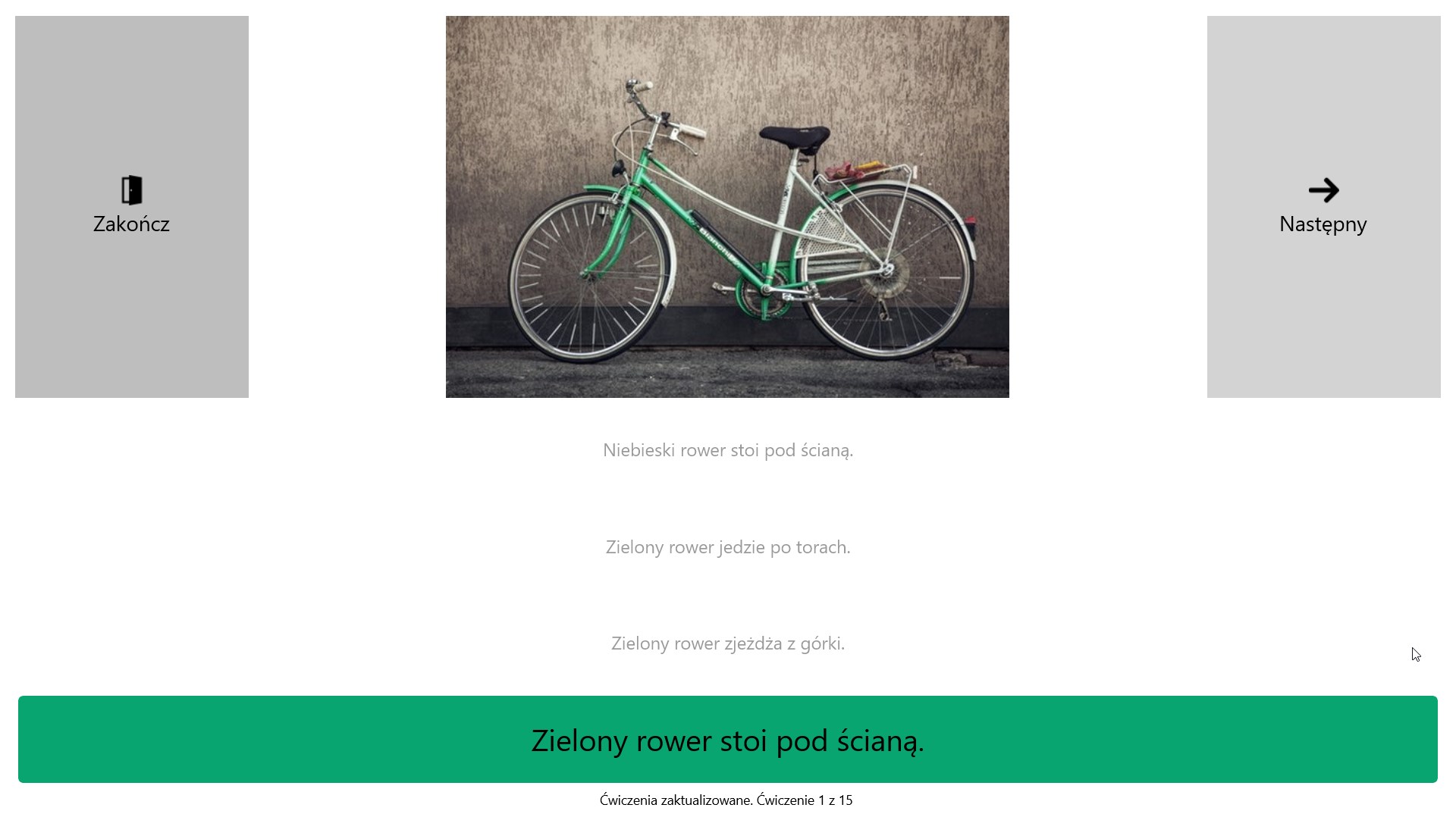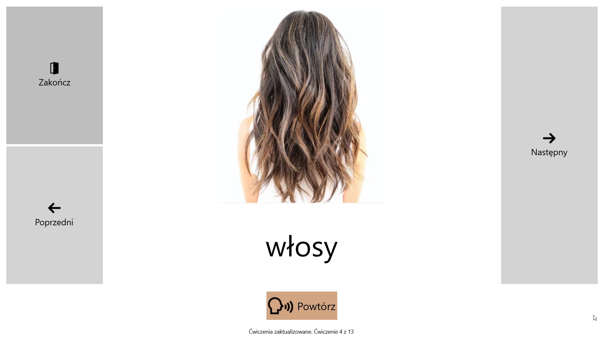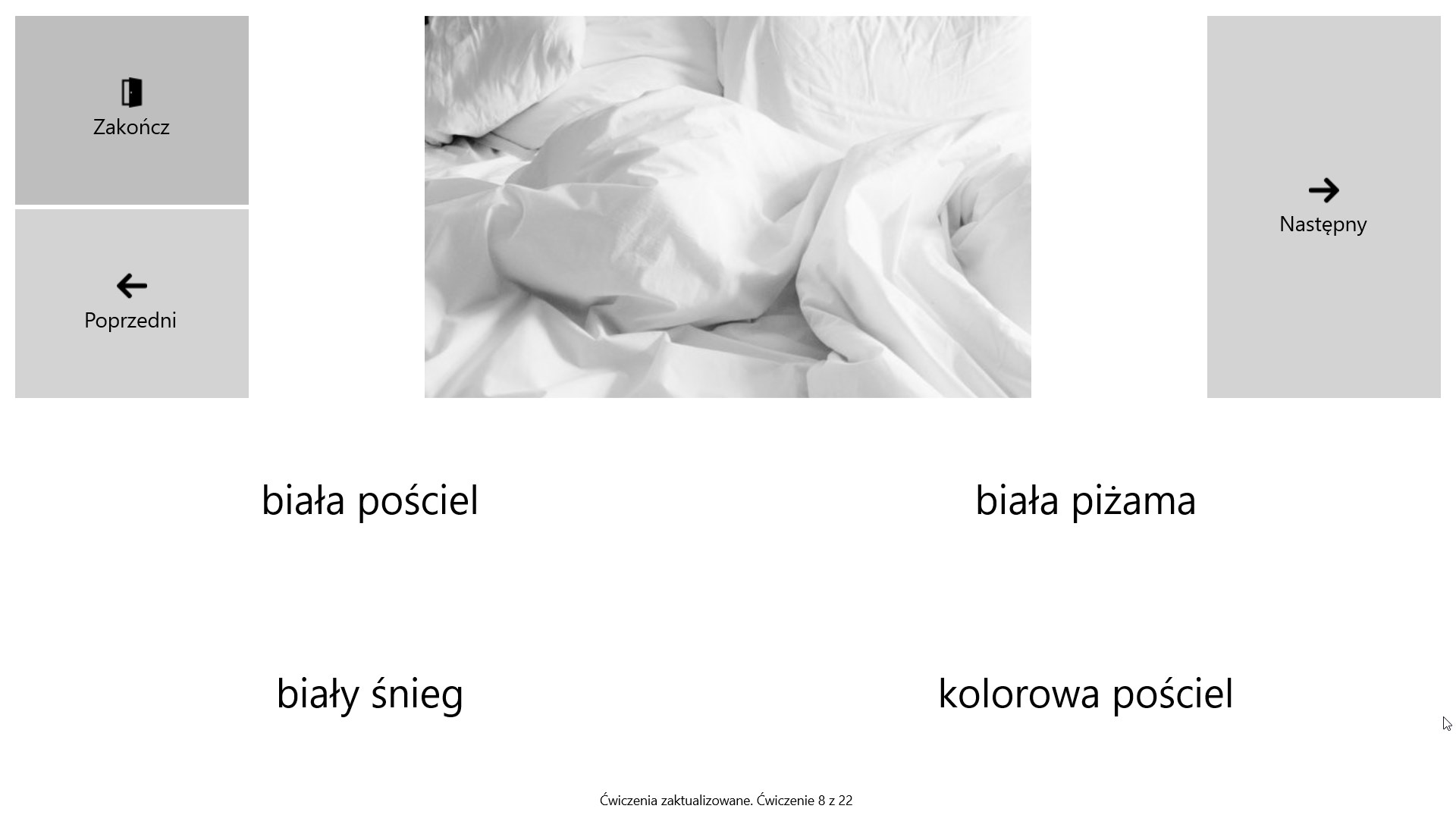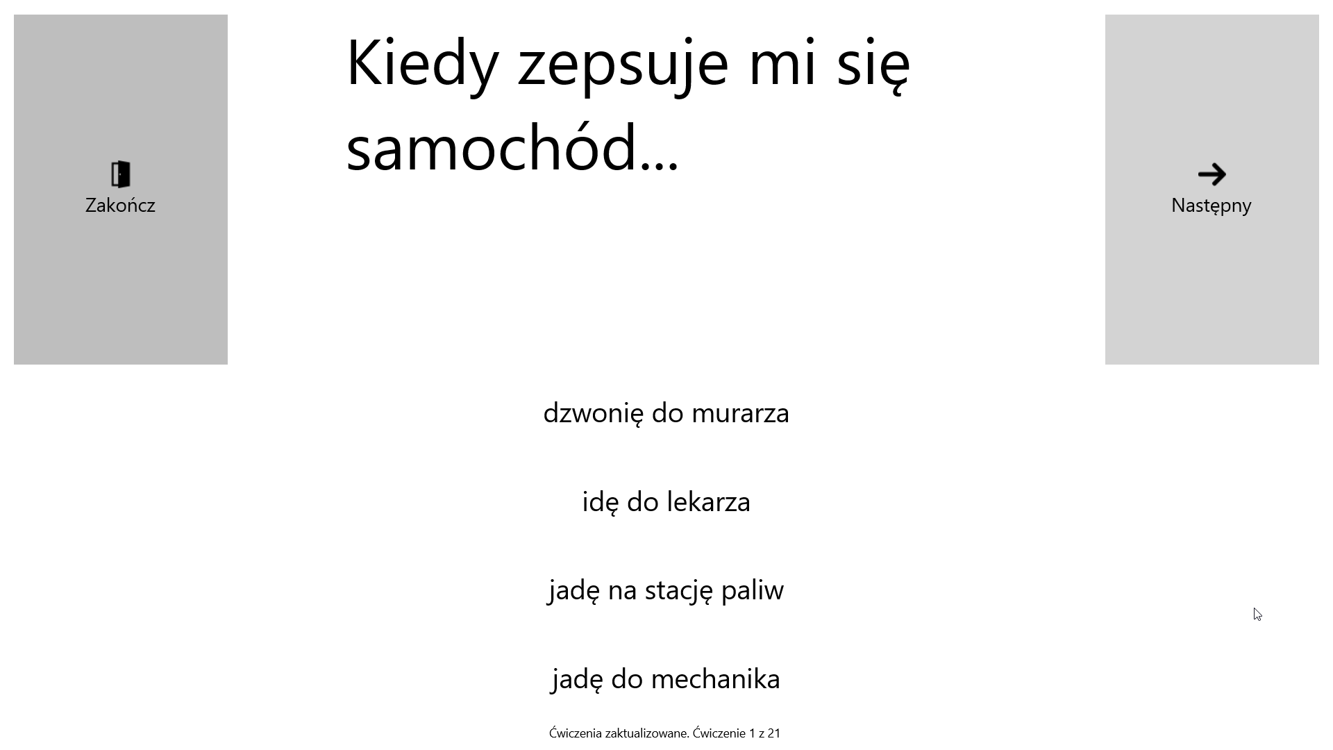 Obraz, dźwięk i tekstDziała bez internetuEkran dotykowy lub myszNazywanieKojarzenie frazKojarzenie zdańKończenie frazKończenie zdańPrzepisywanieRozsypki wyrazoweCzytanie-słuchanieRozumienie ze słuchuRozumienie tekstu