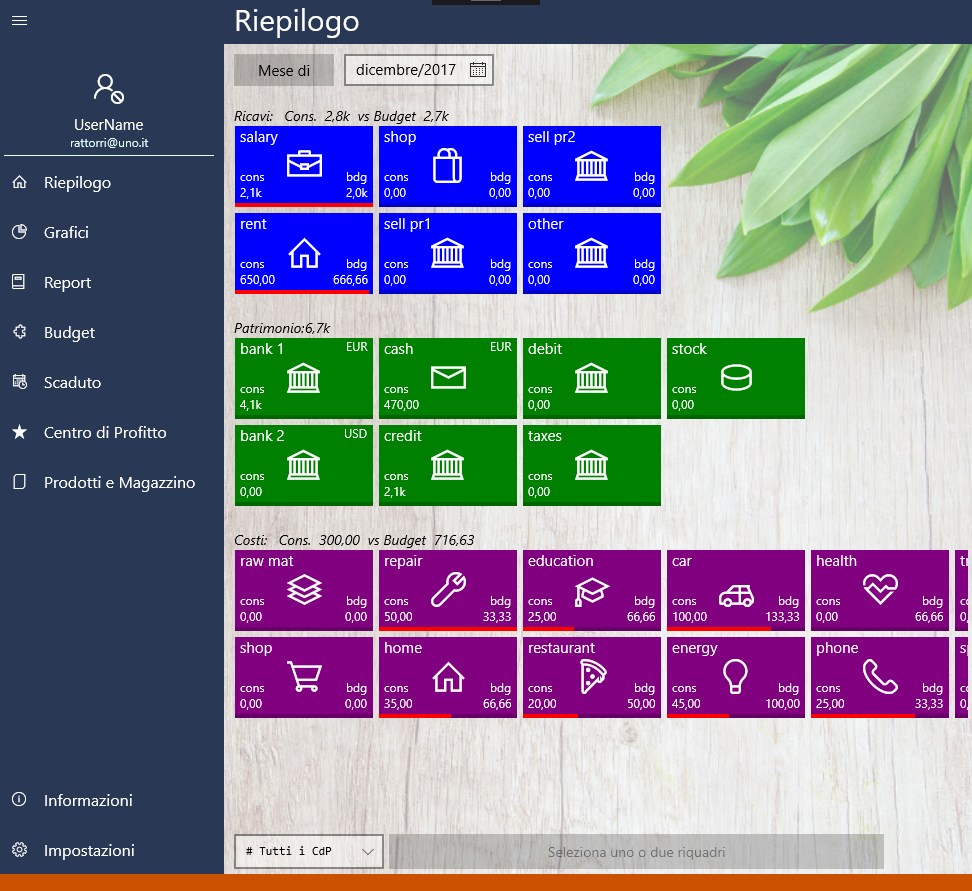 Fast expenses and revenues recording Also provide import function from other management systemsInsertion and immediate control of the budgetScan the receipts and attach them to the costs, useful for purchases under warrantySplit the vat in buying and sellingMySQL remote serverSuppliers/Customers managementAccounting by Profit CenterGraphs and reports exportableMulti-users with different permission levelsCredits and debits analysis (ageing)