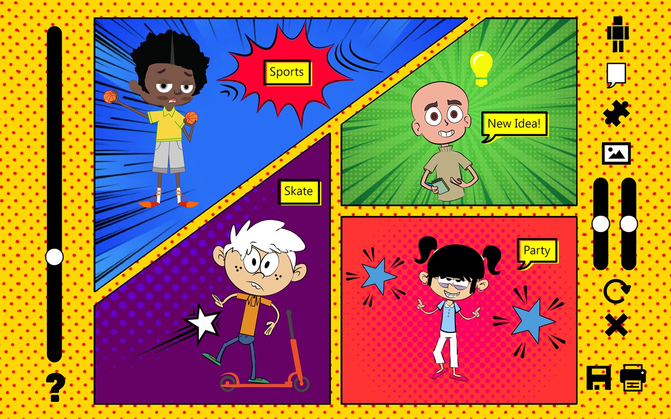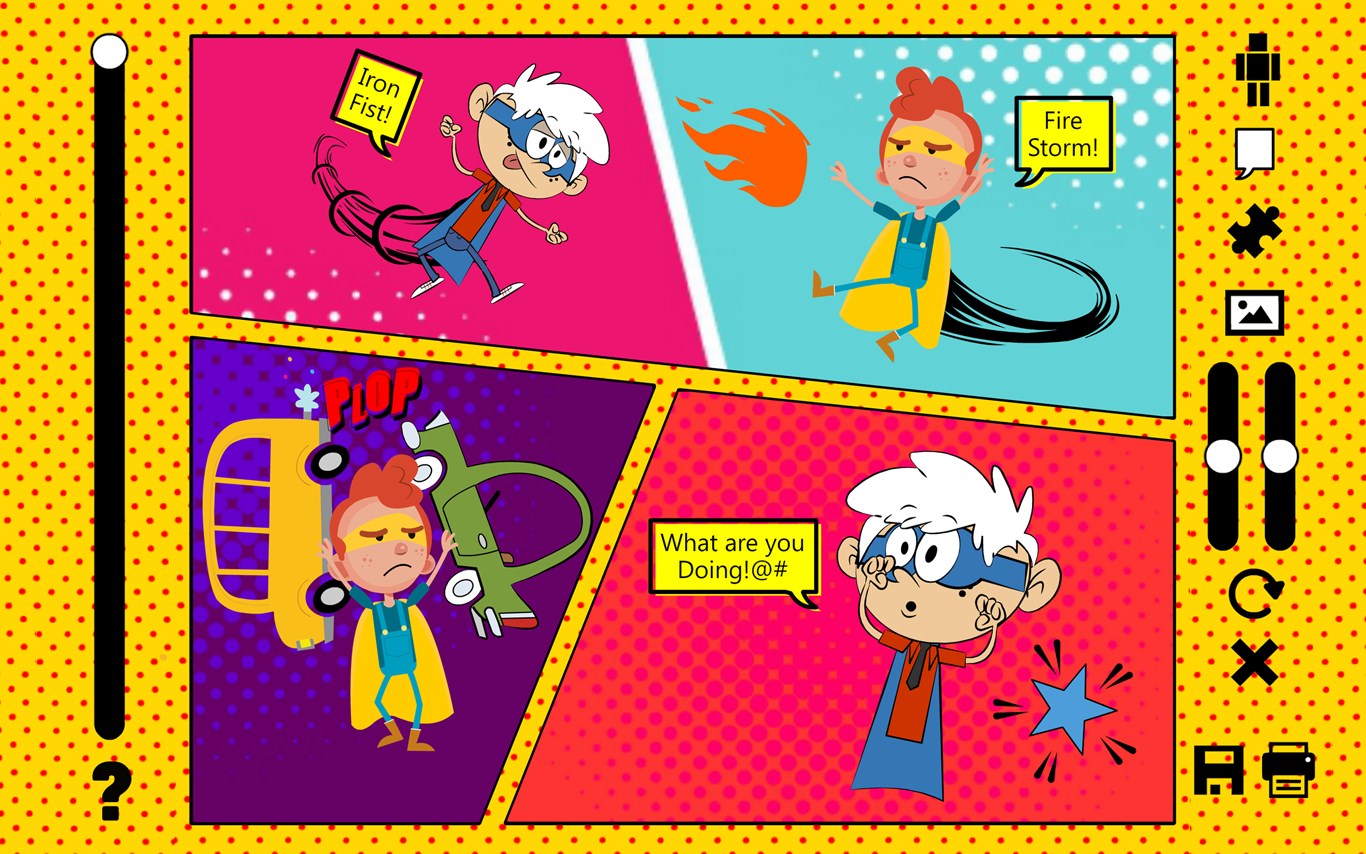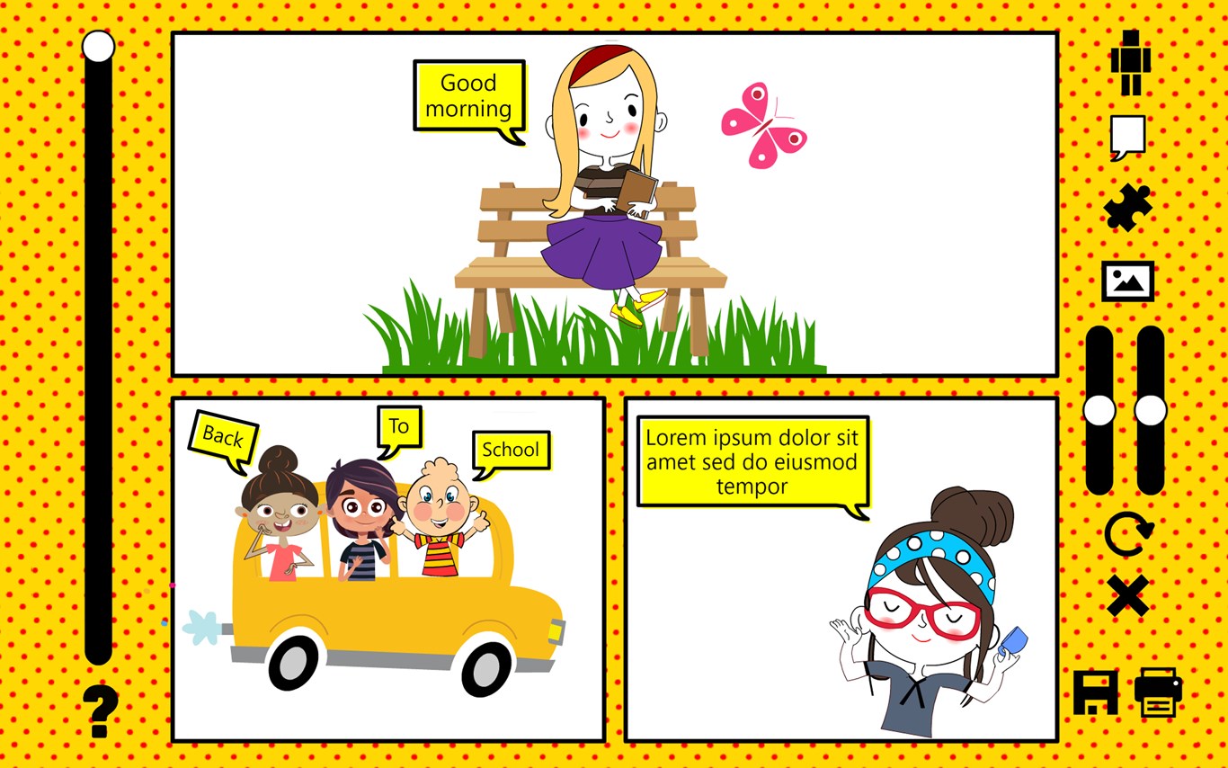 • Unique characters with tons of customization (8 boys + 8 girls).• Control characters body & gestures.• Dozens of objects, comic effects & backgrounds.• Print in vector high quality image in any paper size.• Halftone & cartoon filters for images.• More than 30 beautiful comic panels layout.• Useful to use in school projects & education illustrations.• Suitable app for boys & girls.• Suitable app for boys & girls.