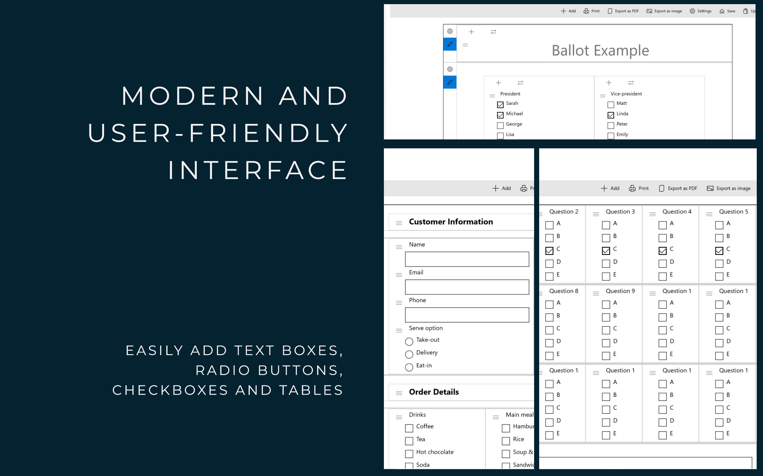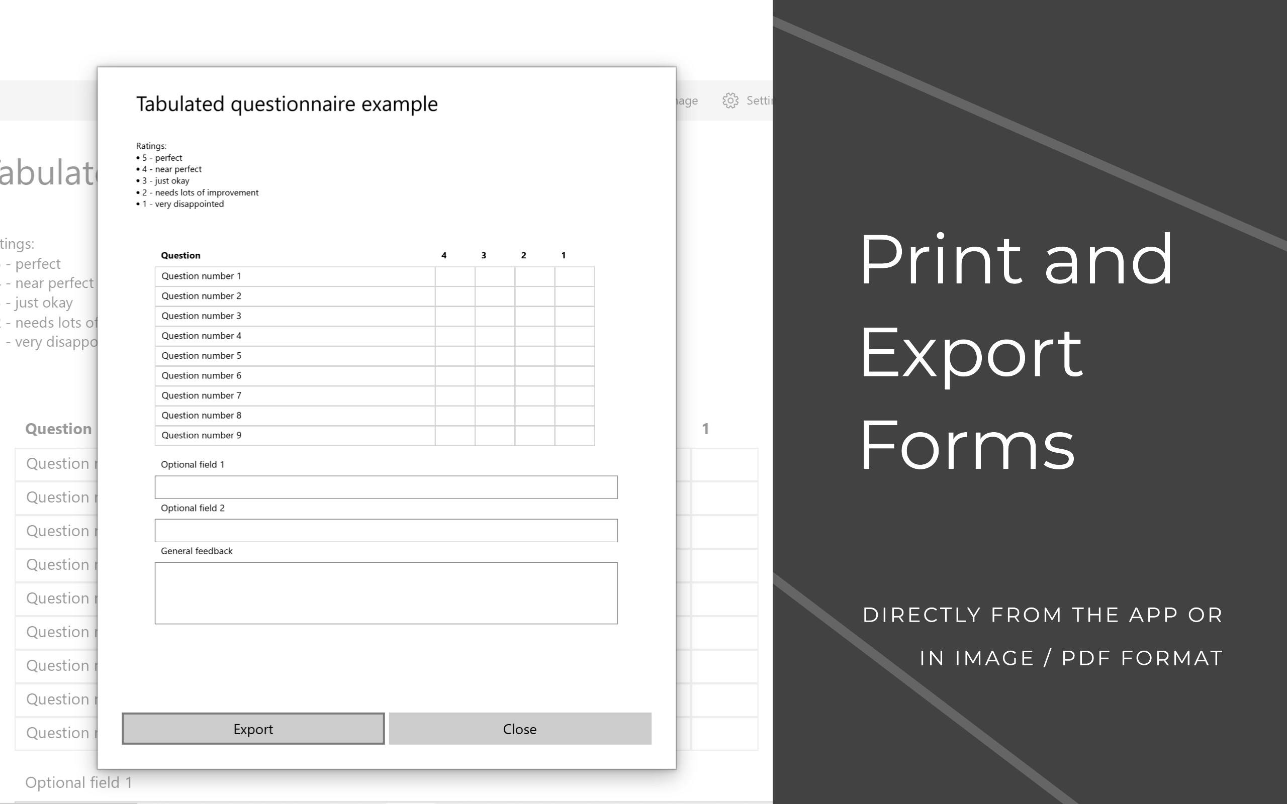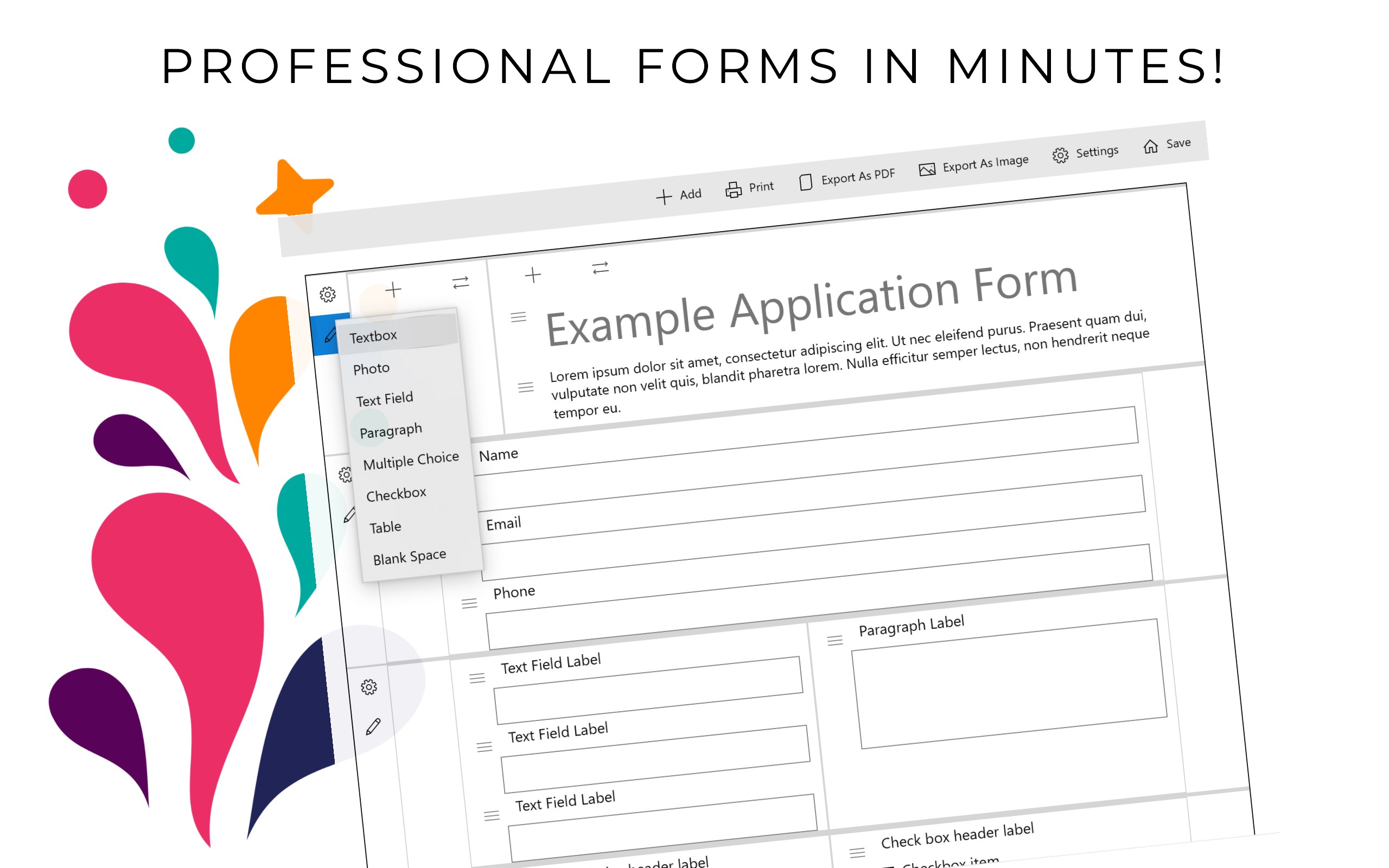 Create printable forms for quizzes, surveys, application forms and moreChoose from professionally designed templates or make your own forms from scratchCustomize your forms with text boxes, images, multiple choice questions, signature boxes, checkboxes, fonts and layoutsPrint or share your forms as images or PDFsPrint forms with headers, page numbers, timestamps and adjustable pagination settings
