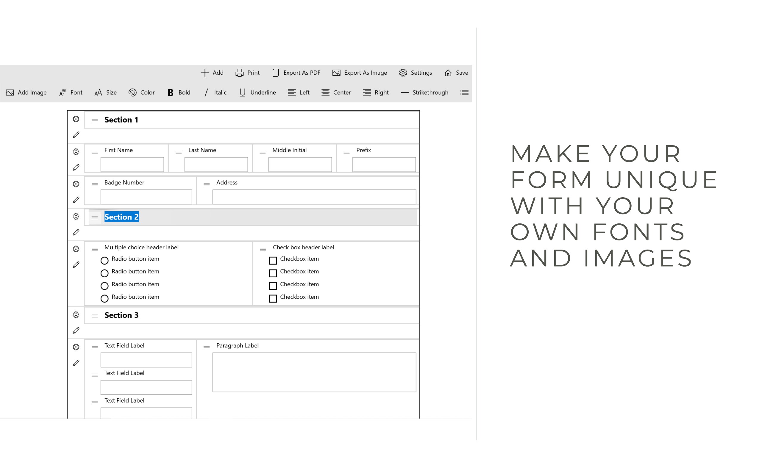 - Customize with text boxes, multiple choice questions, signature boxes, checkboxes, photos, fonts, and layouts.