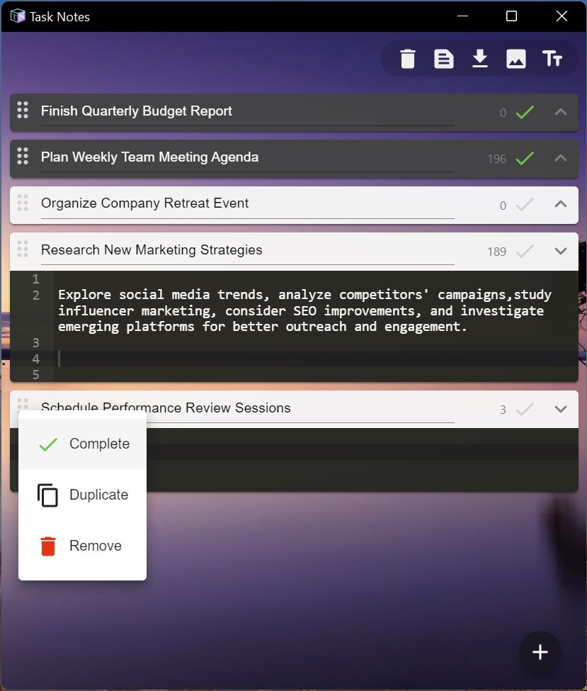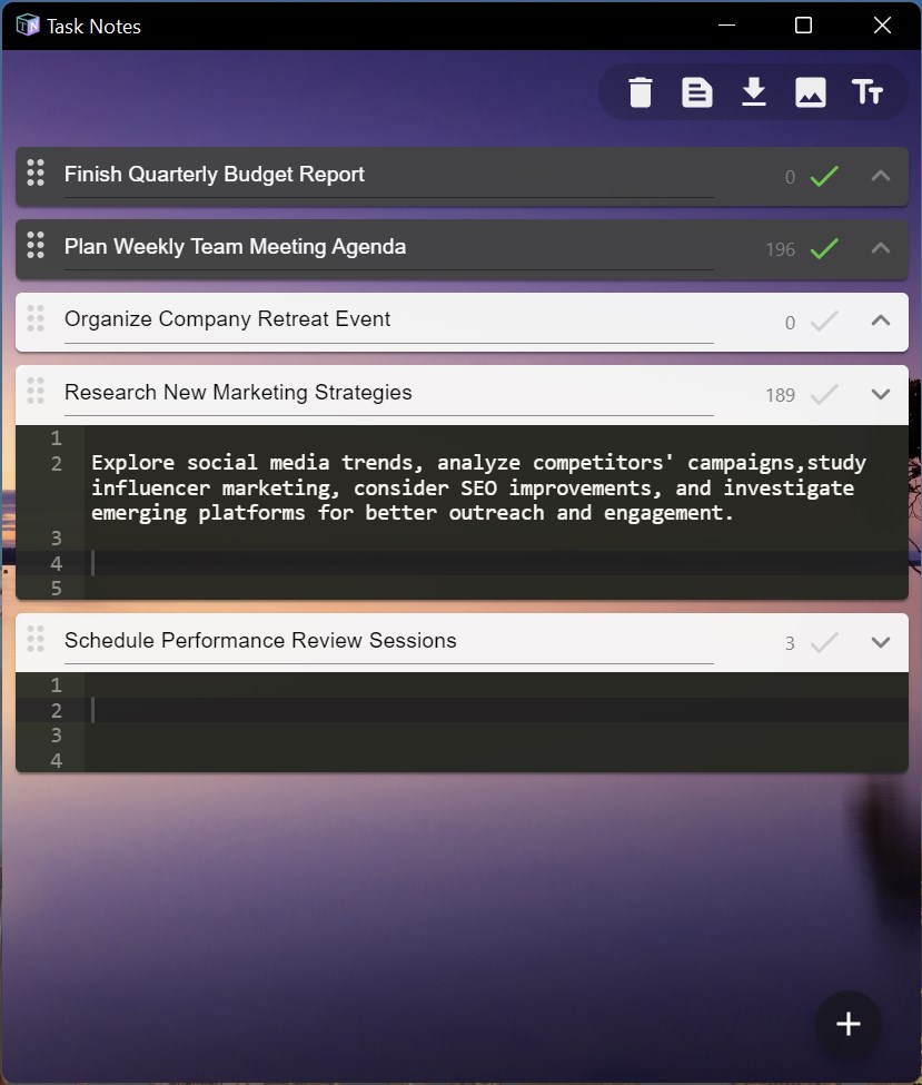To-do list: Easily create, manage, and complete tasks to stay organized.Note-taking: Compose and save notes associated with each task.Intuitive rearrangement: Quickly rearrange tasks in any order with simple drag-and-drop functionality.Syntax highlighting