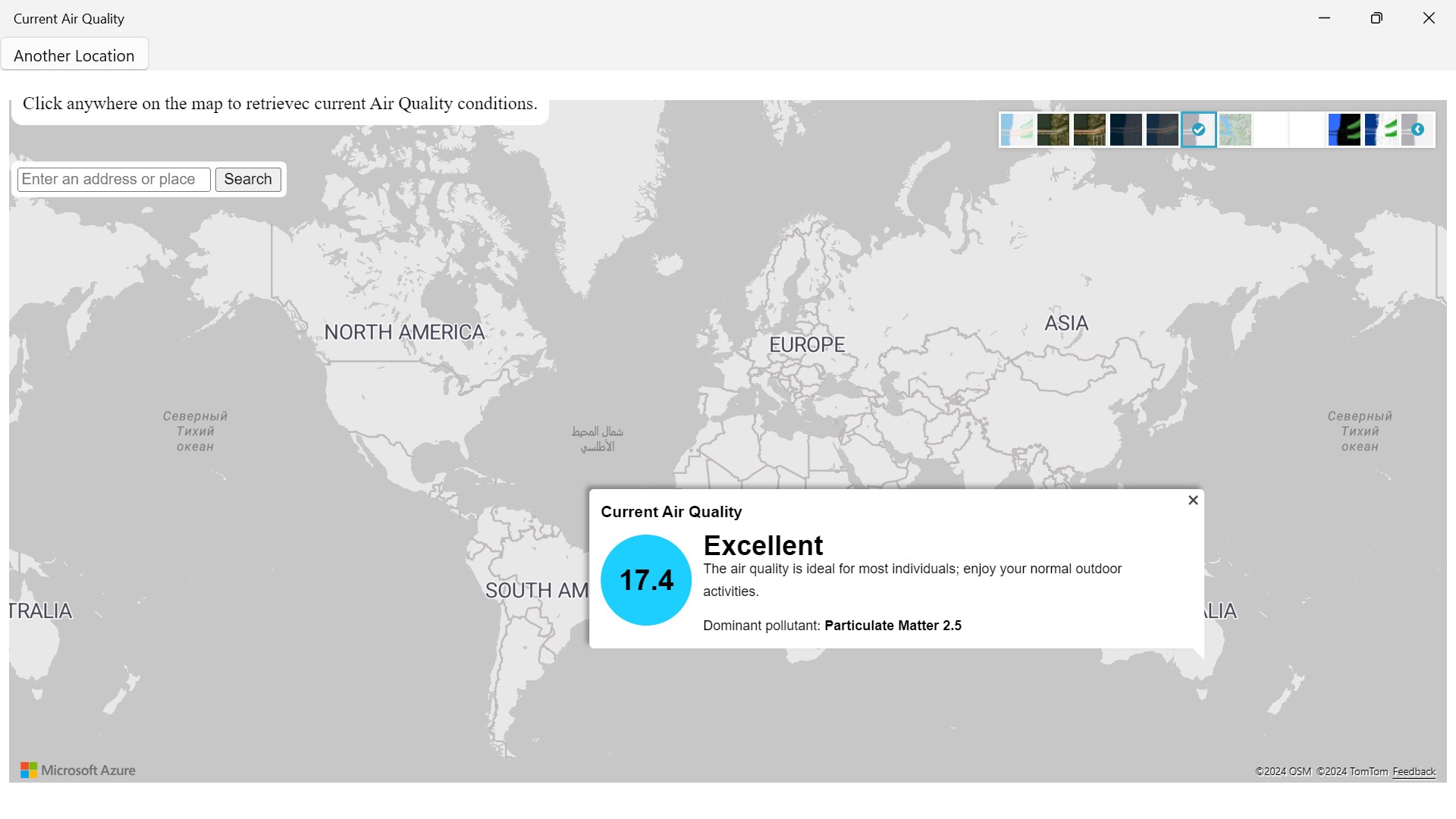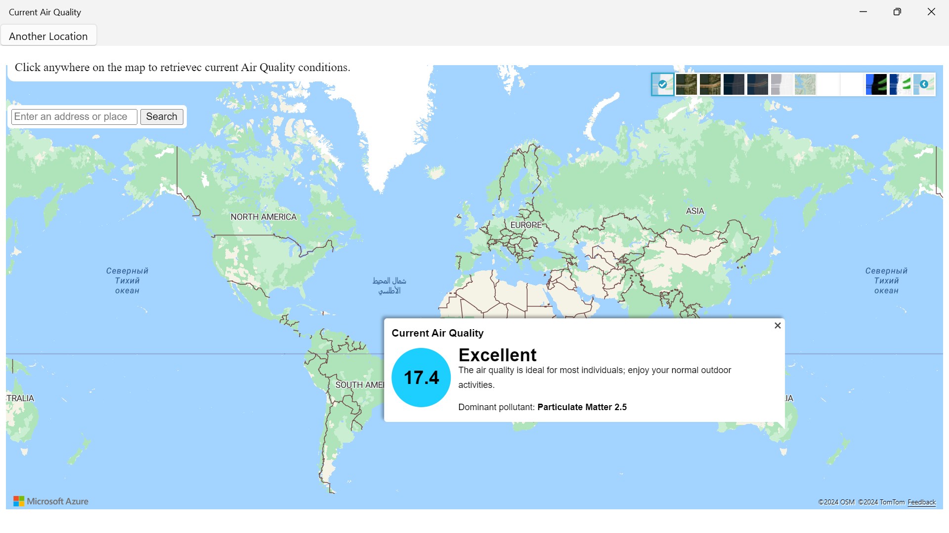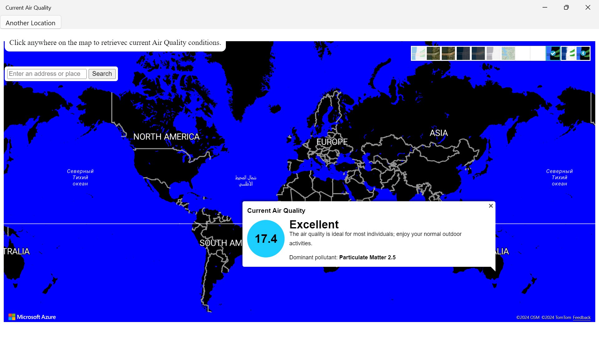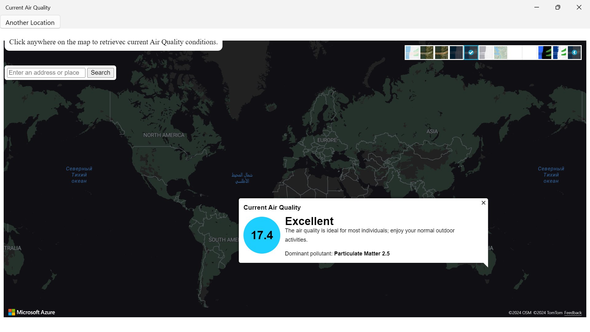 To check the air quality left click on mouse to get a reading result to check weather. You can change the different types of layers of maps by going to the right top corner of your screen
