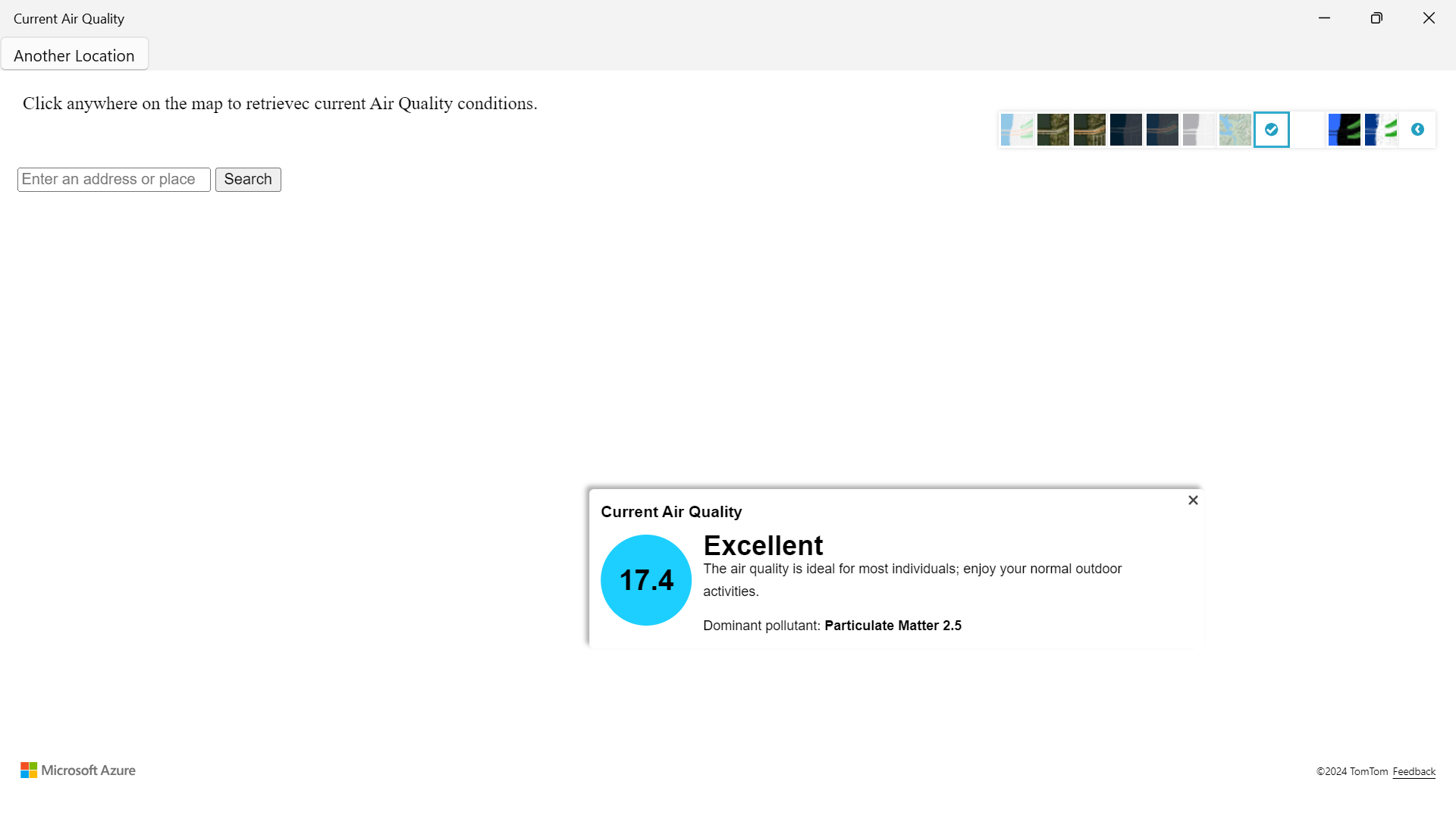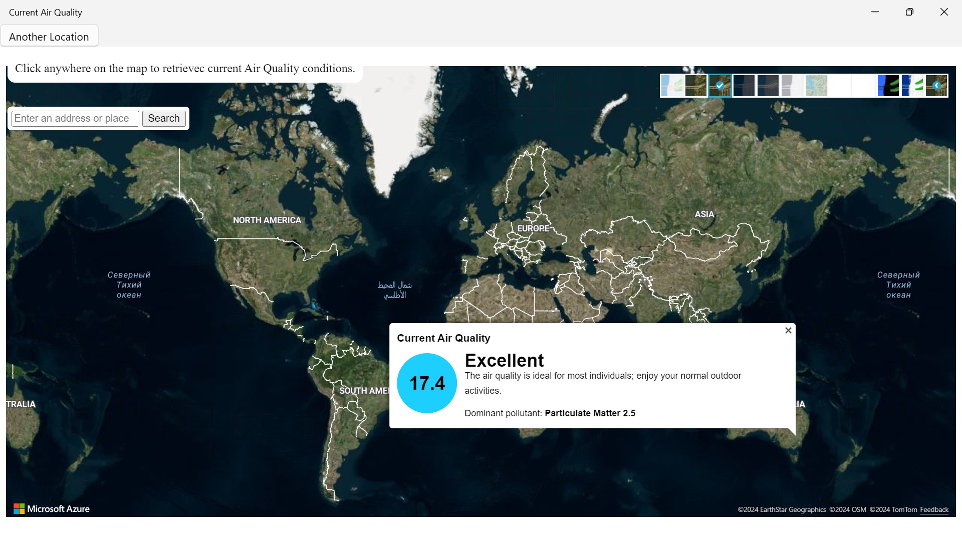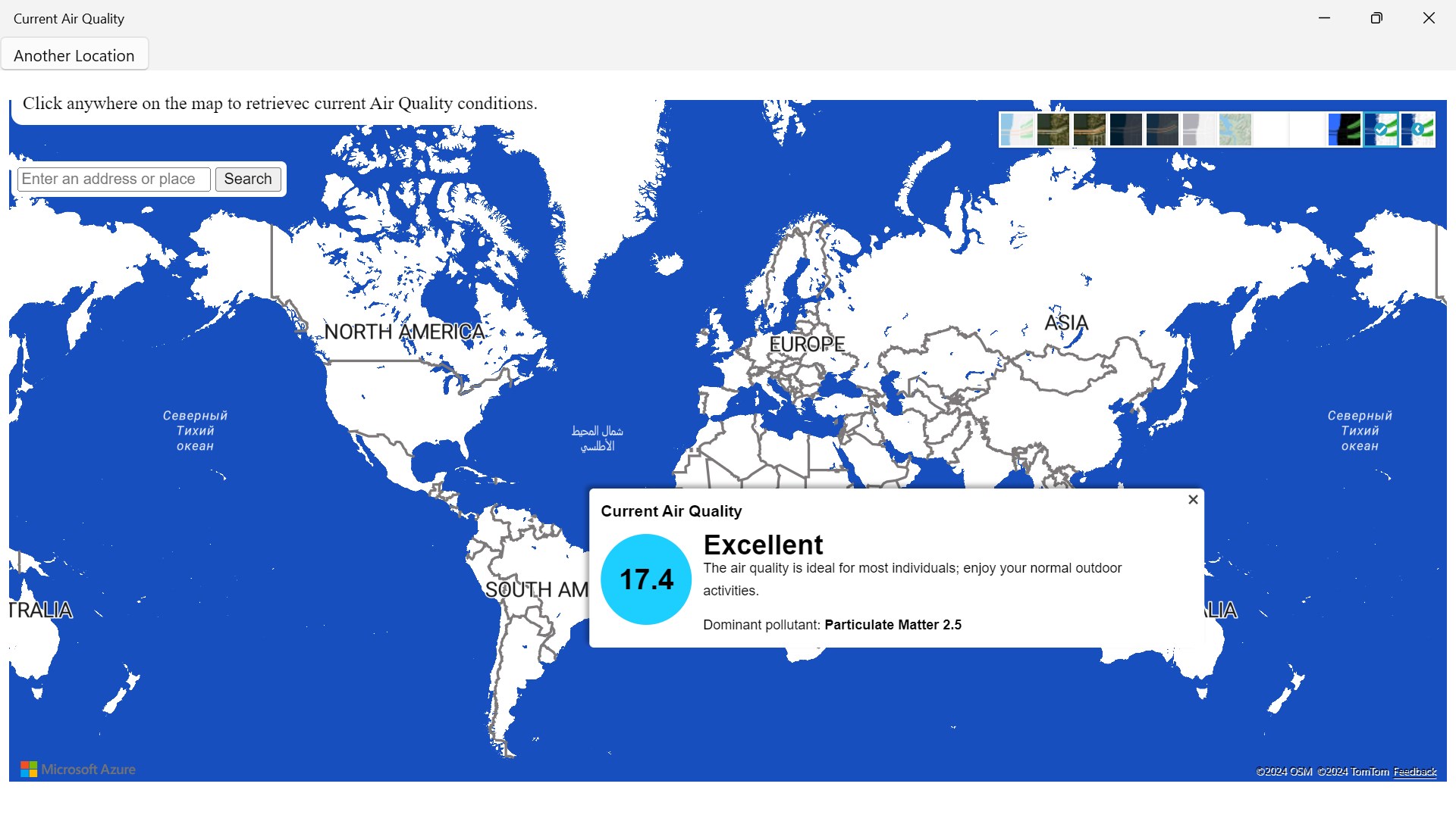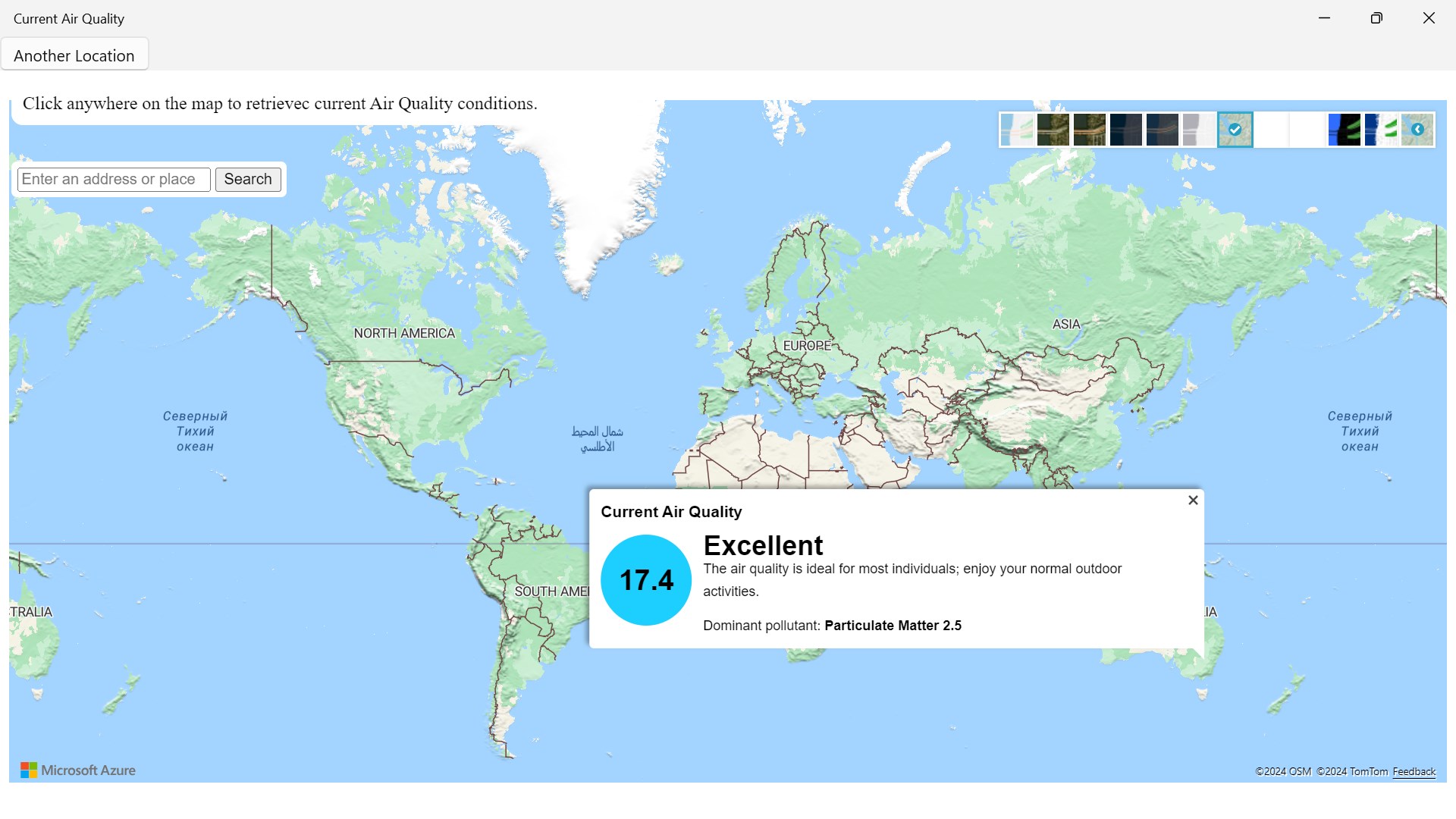 To check the air quality left click on mouse to get a reading result to check weather. You can change the different types of layers of maps by going to the right top corner of your screen