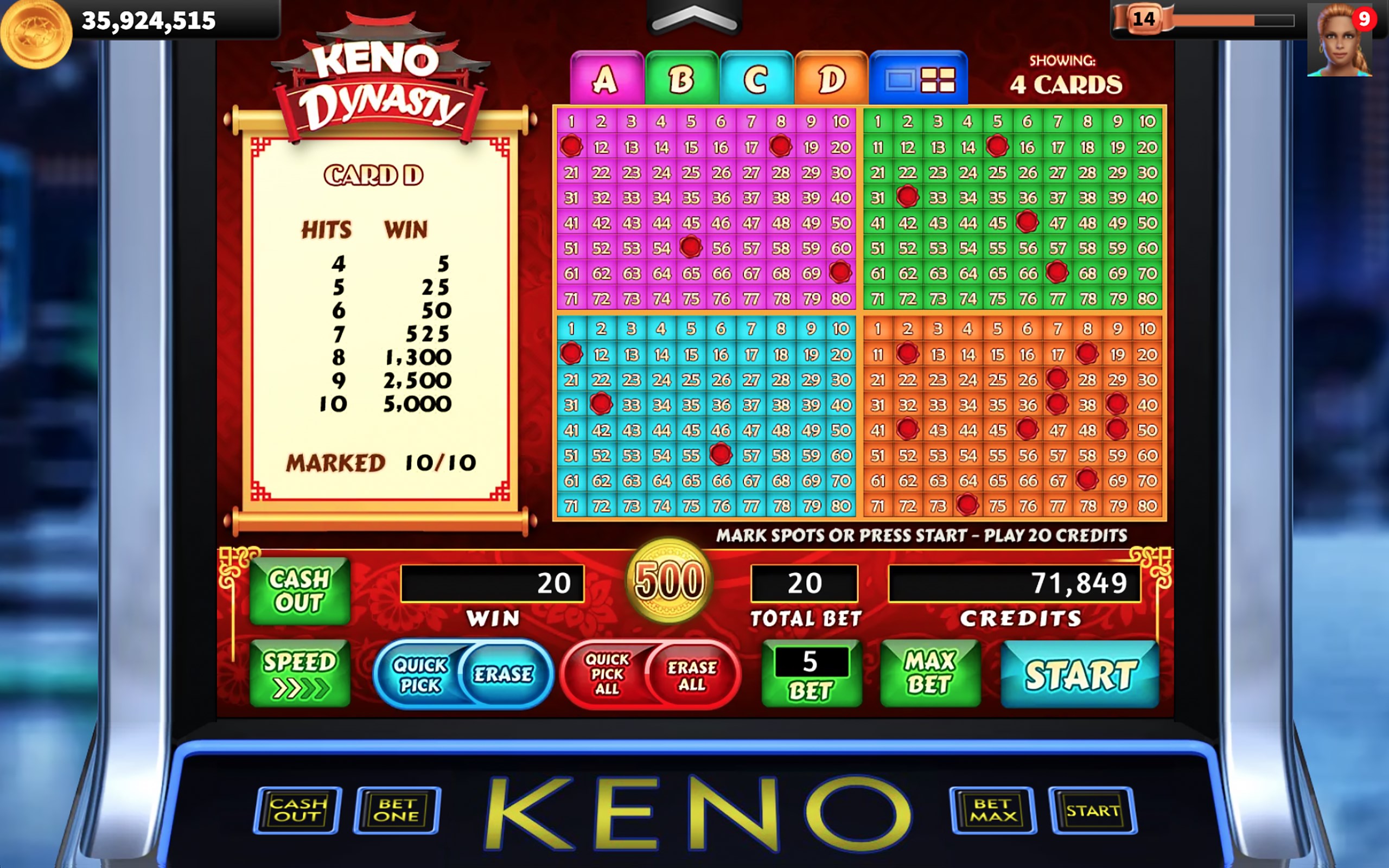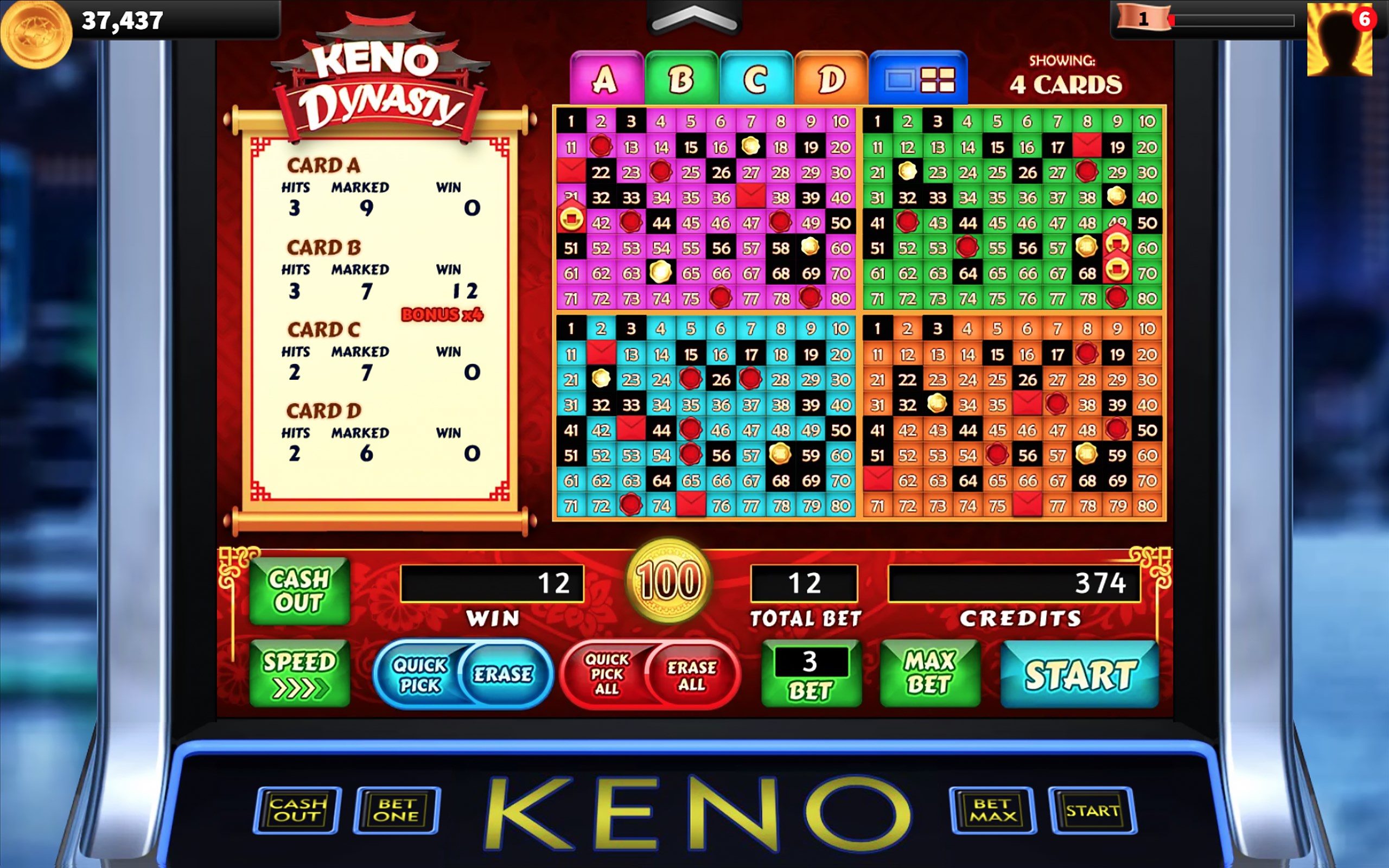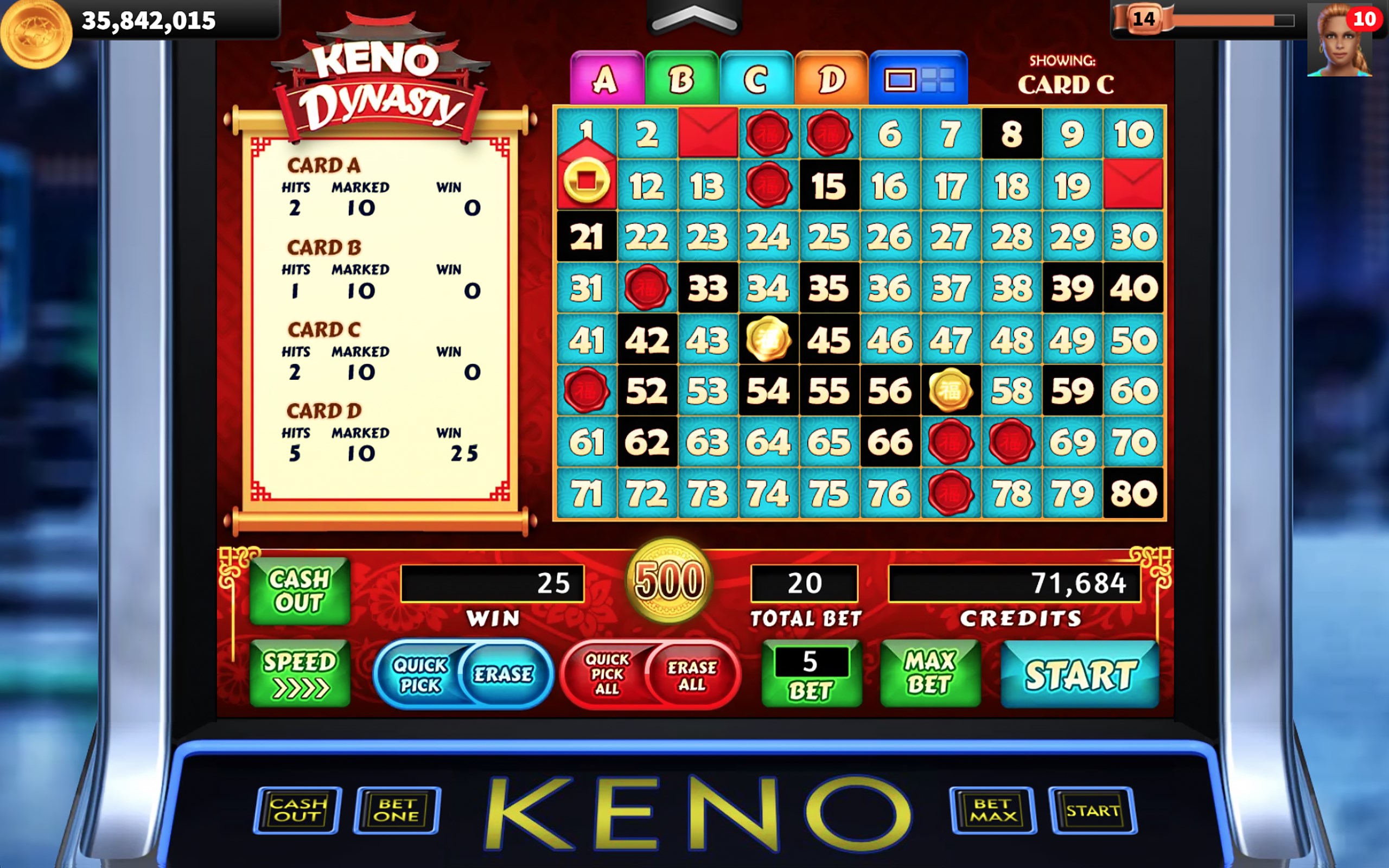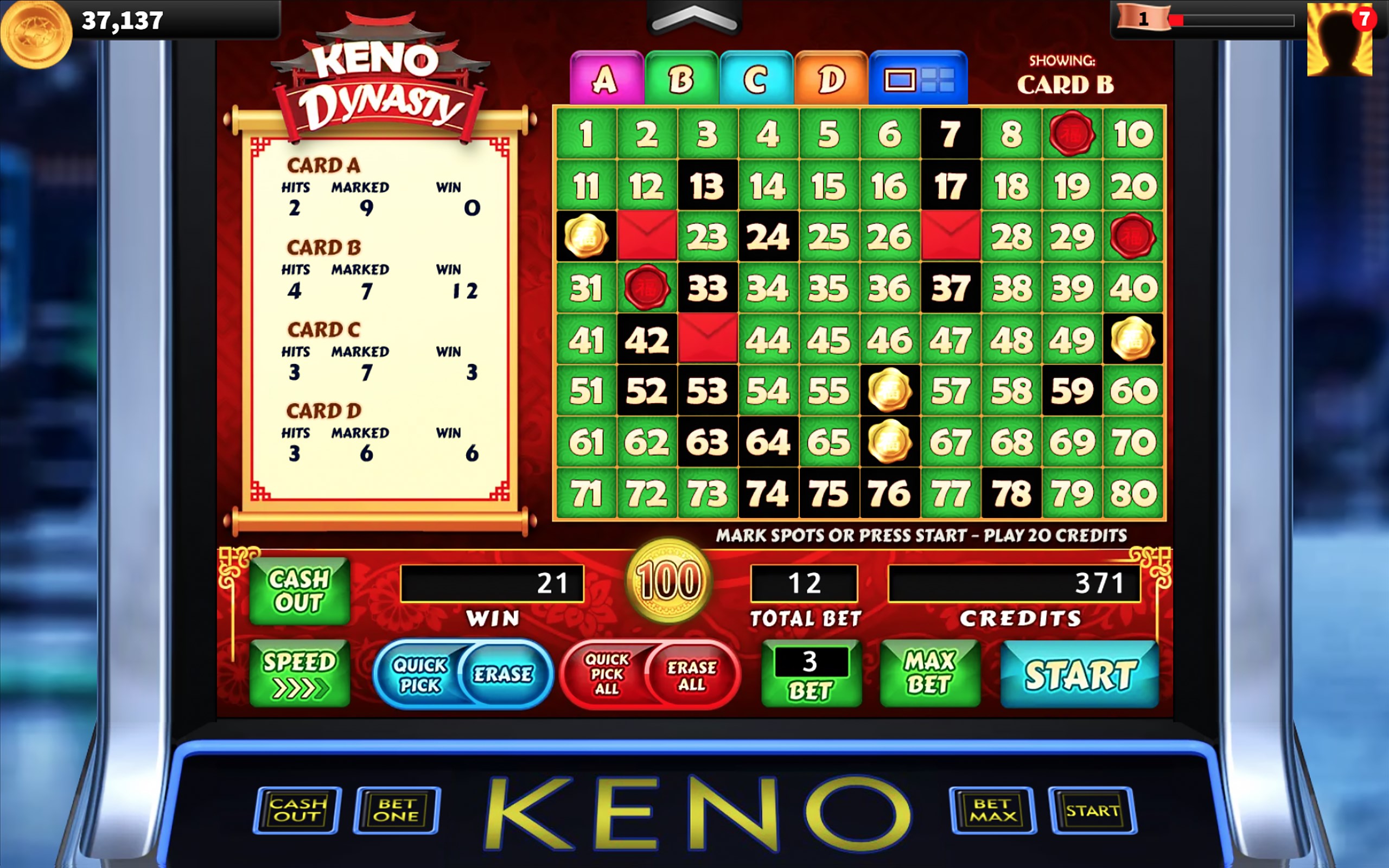 Choose 2 to 10 numbered spots on each of four independent game cards, or select Quick Pick to choose them automatically. Press the START button to begin play and reveal 3 additional bonus red envelope spots on each independent game card. Watch as twenty spots are randomly selected and marked on all game cards.