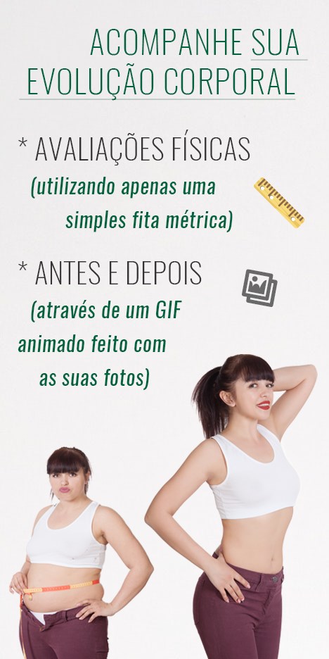 Avaliação Física, Evolução Corporal, Monitoramento Medidas Corporais e % de Gordura, Diário de Alimentação/Treinos/Sentimentos, Notas Diárias de 1 a 5 estrelas, GIF de Antes e Depois, Relatórios