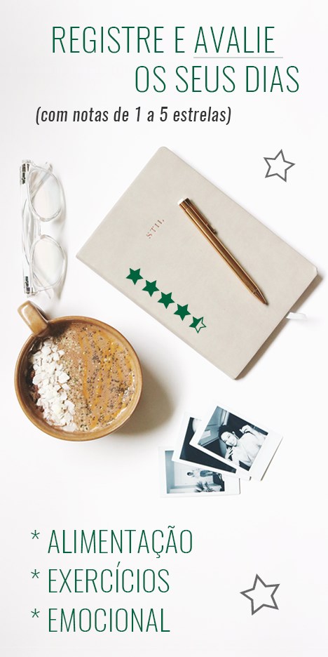 Dê notas de 1 a 5 estrelas para seus dias e registre suas refeições, treinos e sentimentos.