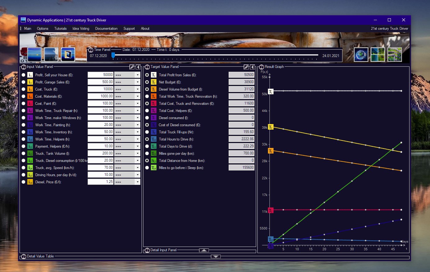 With all Input Values, there is a small selector that allows you to adjust each value up and down, in time. So let your worktime rise and fall, estimate your fixed cost, your pricing, your production, and the number of customers. Dynamic Applications will count it all together, beautifully displayed in 48 months.